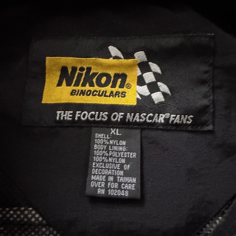 Vintage-inspired NASCAR racing jacket, featuring a bold black and yellow color scheme with reflective accents. This full-zip windbreaker showcases the Nikon Binoculars logo on the collar, along with prominent NASCAR branding on the front and back. Type: Jacket Style: Windbreaker Outer Shell Material: Nylon Department: Men Color: Black Lining Material: Polyester Insulation Material: Polyester Fabric Type: Microfiber Features: Reflective, Full Zip, Lined Pattern: Solid Accents: Logo, Reflective Stripe Model: Nikon NASCAR Racing Keywords: Nikon, NASCAR, racing jacket, windbreaker, full zip, black yellow jacket, vintage jacket, retro jacket, motorsport, race car, mens jacket, XL jacket, reflective jacket, NASCAR jacket