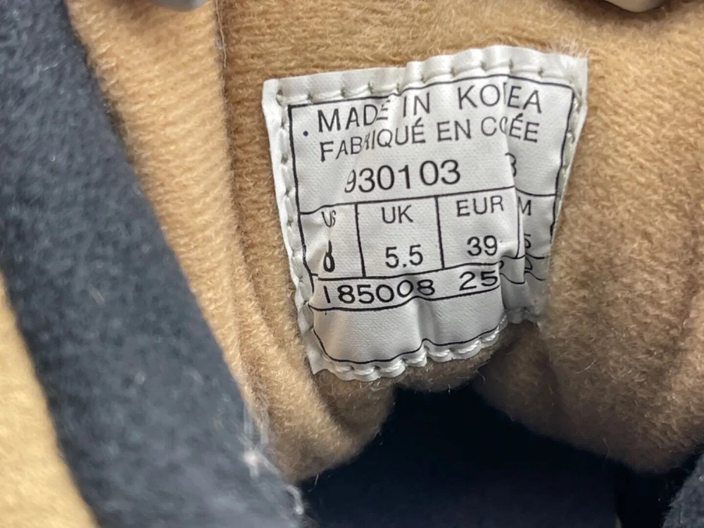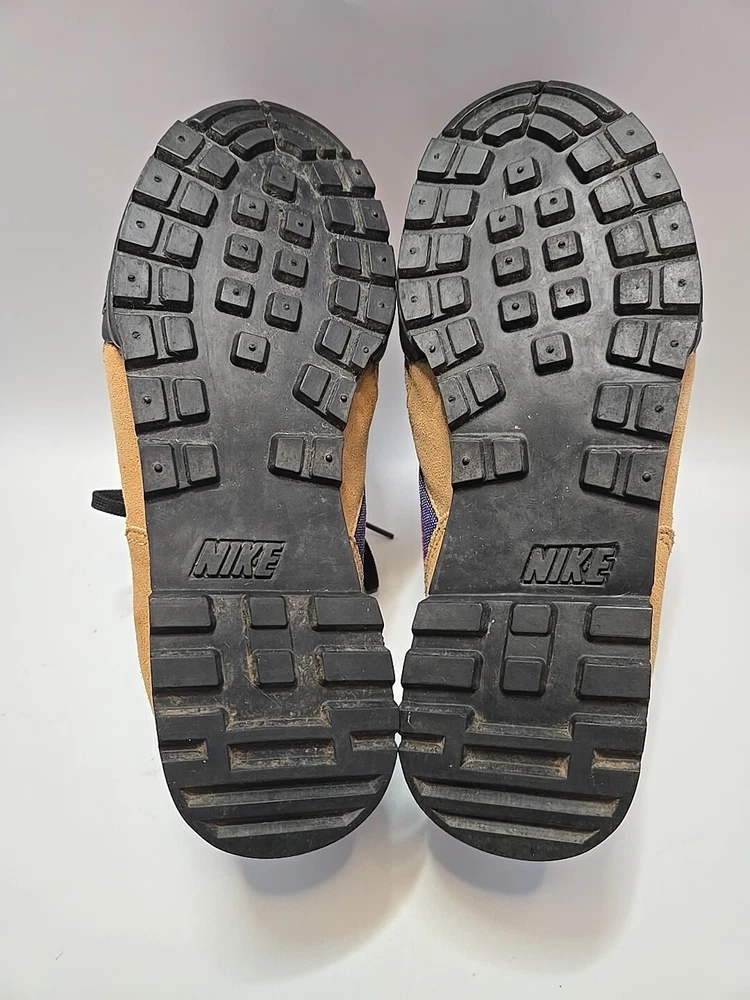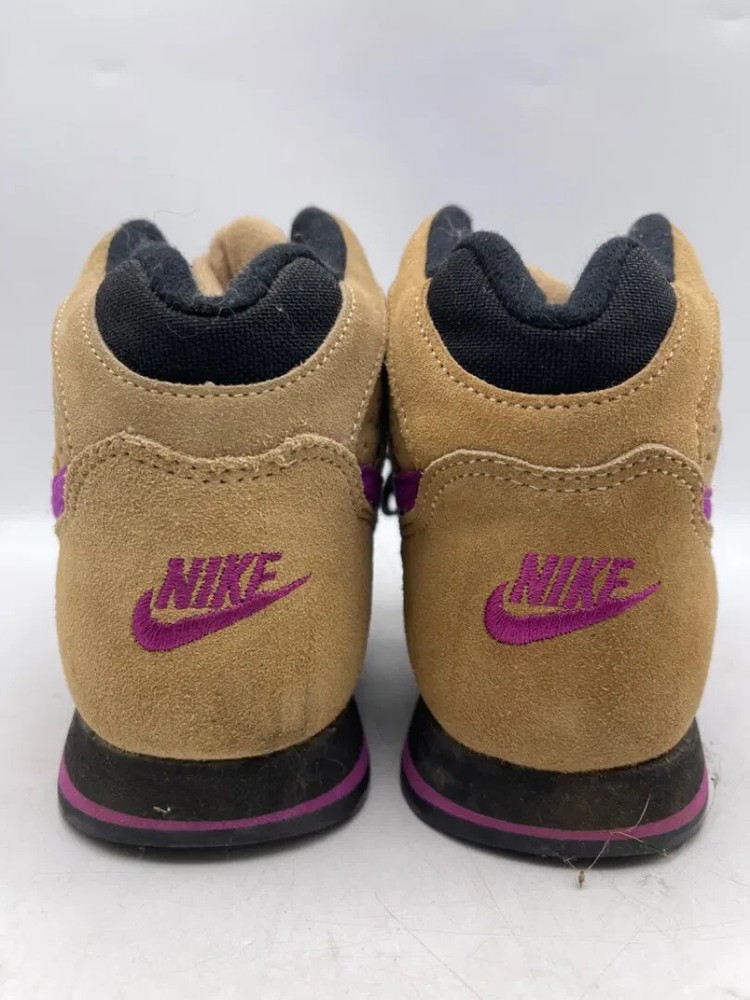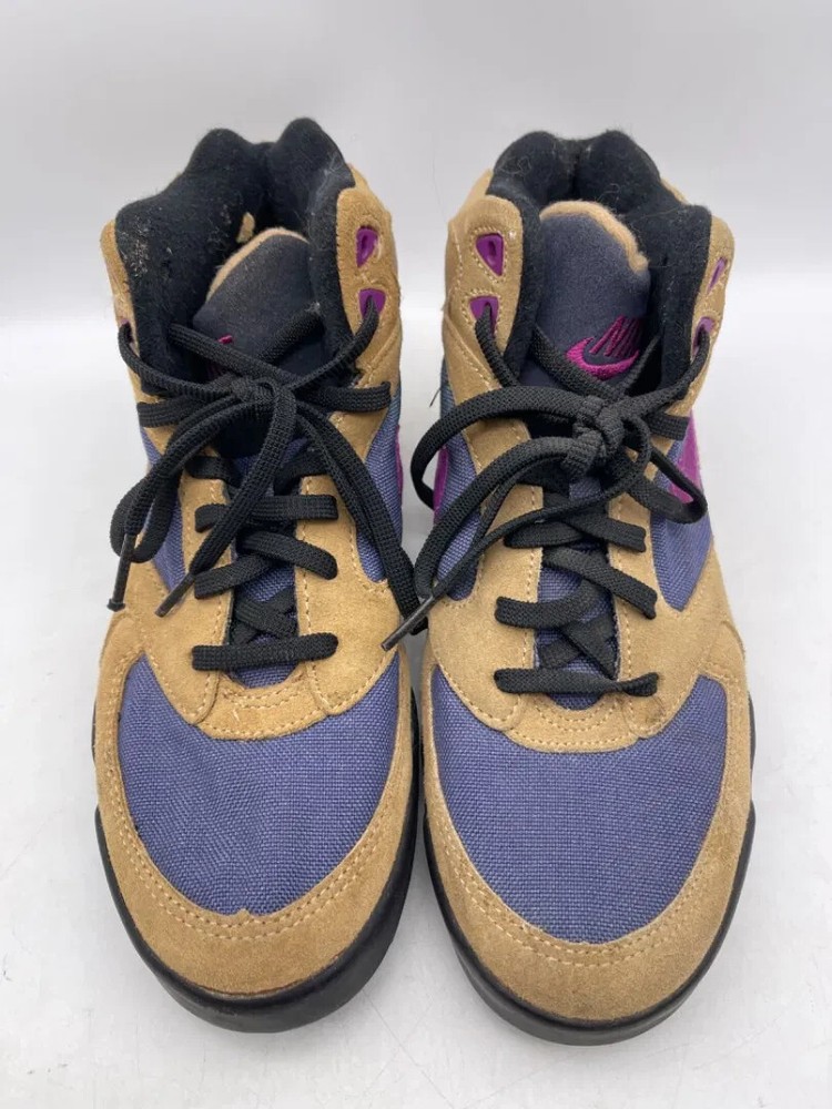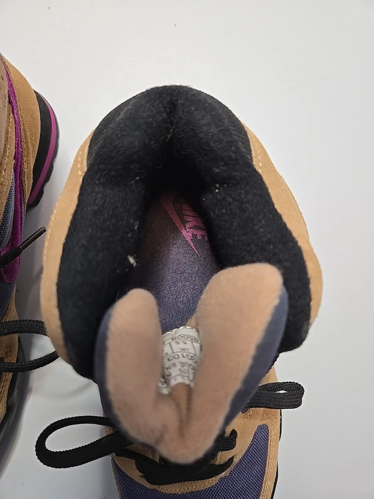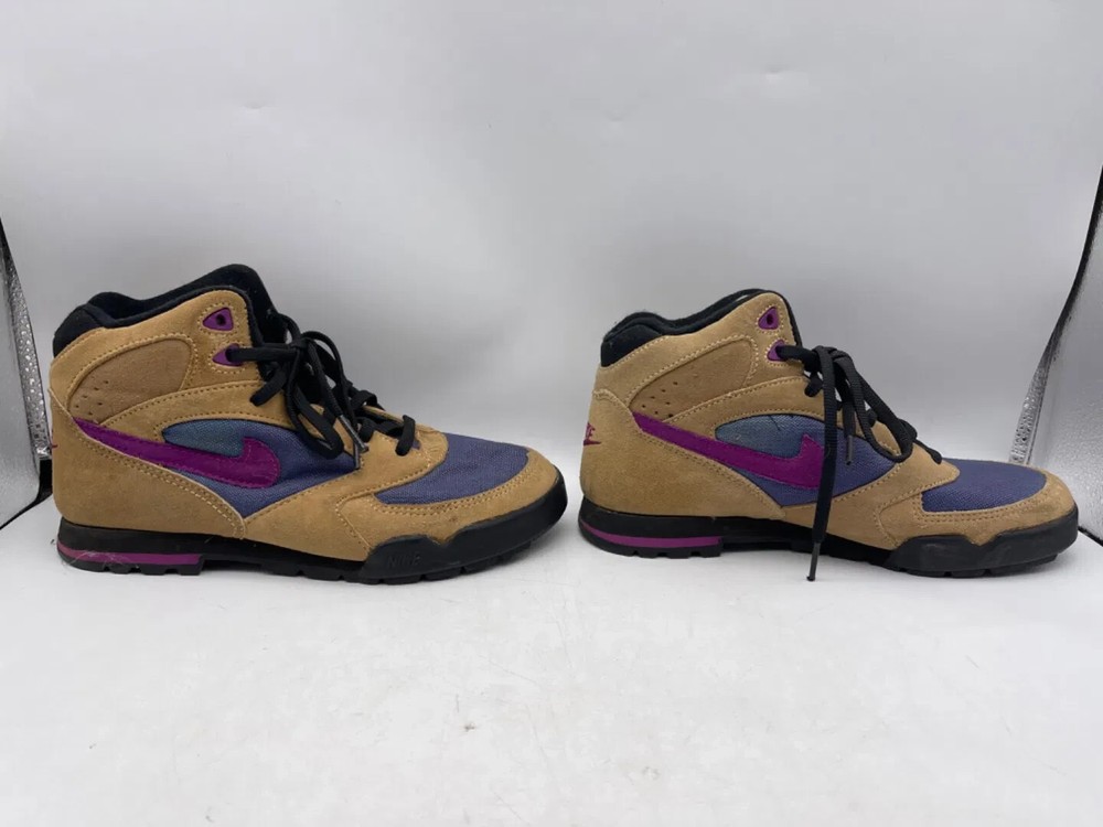 The product is a rare vintage pair of Nike ACG Caldera hiking boots in women's size 8, dating back to the 1990s and made in Korea. These ankle boots feature a solid blue suede upper with a lace-up closure and comfortable rubber outsole. They are part of the Nike ACG product line and are designed for hiking.