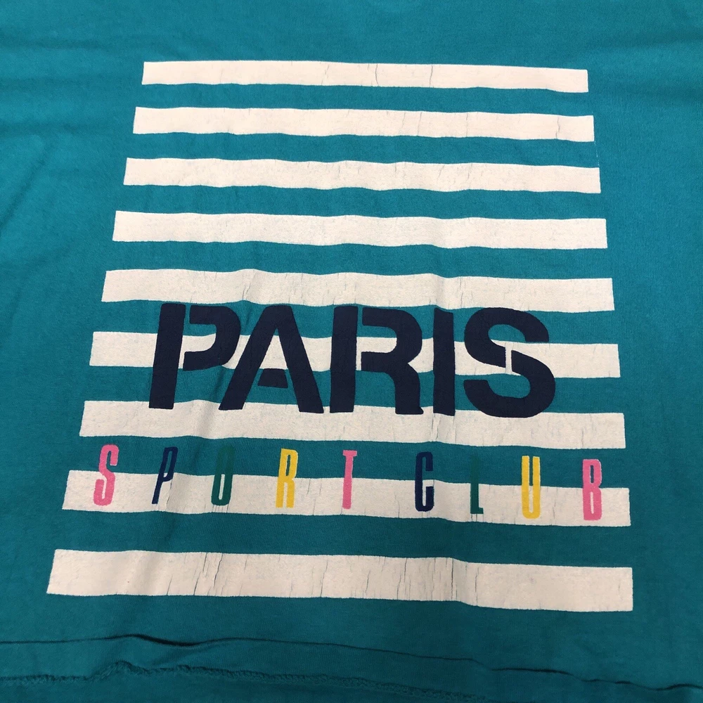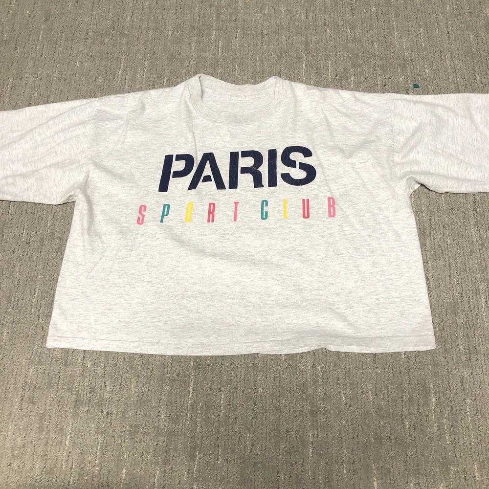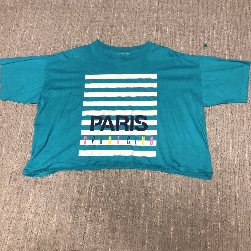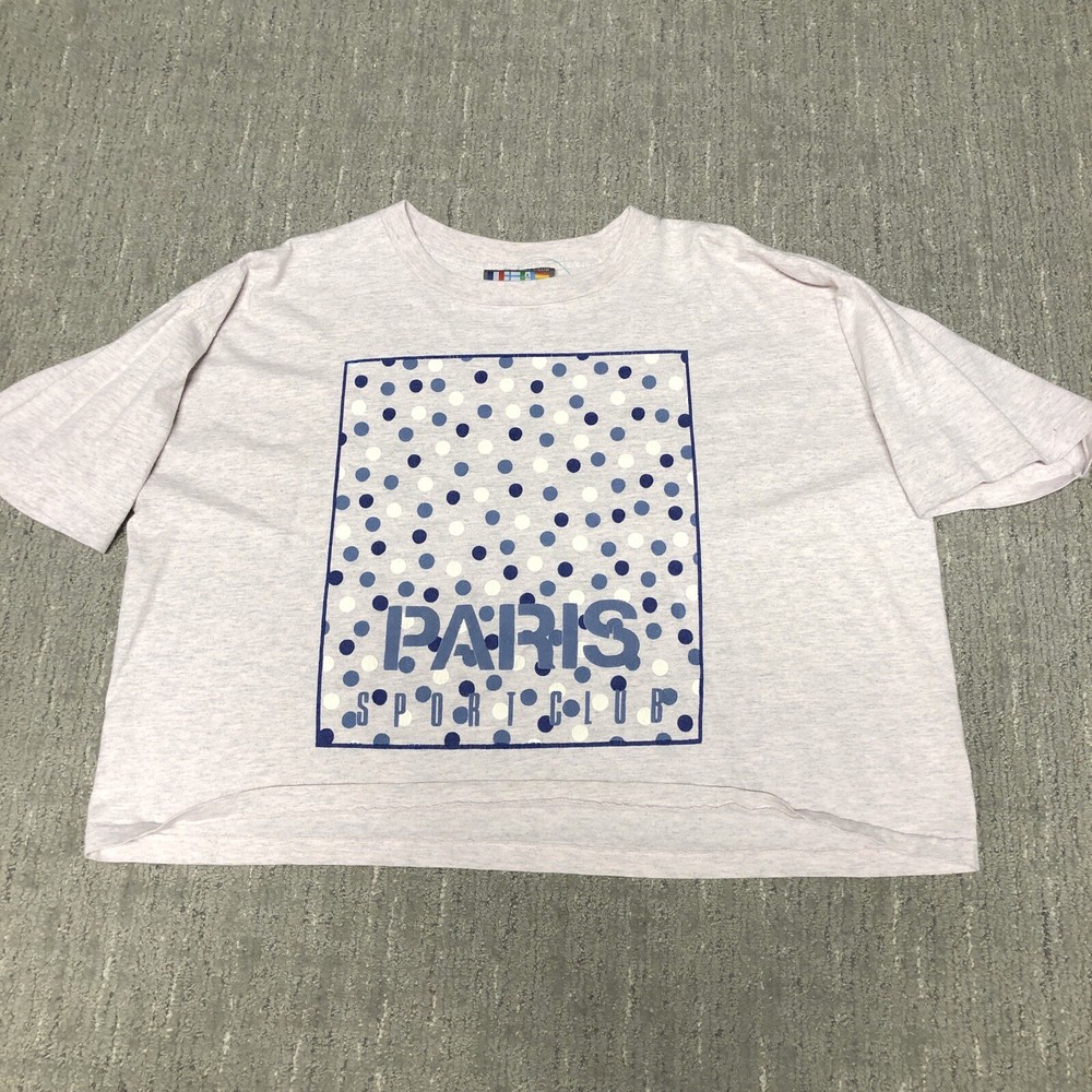 Vintage: Yes Country/Region of Manufacture: United States Sleeve Length: Short Sleeve Size: XL Theme: 90s, Retro, Preppy Type: T-Shirt Size Type: Regular Department: Women Neckline: Crew Neck Color: Multicolor Brand: Paris Sport Club Closure: Pullover Pattern: Solid Style: Cropped Material: Cotton Fit: Regular