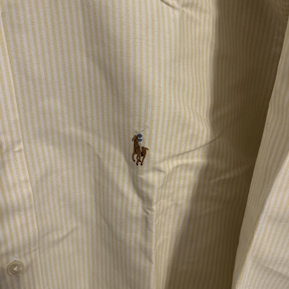 This Vintage 90's Ralph Lauren Yarmouth Oxford Yellow Men's Button Down Shirt is a classic piece perfect for casual occasions. Made from 100% cotton with a button-down collar and long sleeves, this shirt features a striped pattern and a light fabric wash. The shirt is designed in size XL with a regular fit, making it a versatile addition to any wardrobe. The Ralph Lauren brand and the 90s theme bring a touch of designer flair to this timeless and colorful piece.