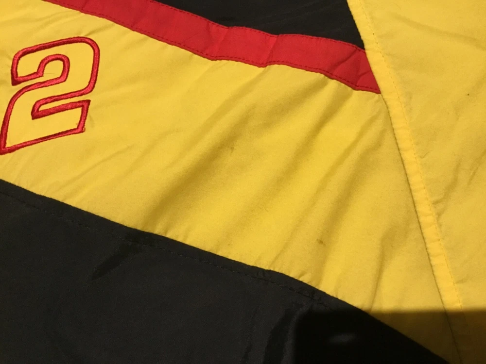 This is an awesome Vintage 90s Rusty Wallace #2 Miller Lite Ford Penske Racing XL NASCAR Bomber Jacket! The original tag has been taken off, so I don’t know what brand it is and there are a couple stain areas. Otherwise, the zipper still functions exceptionally well and the jacket is in great condition! See photos! If you have any questions, please contact me. Thanks for looking!