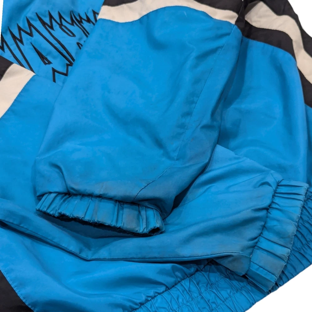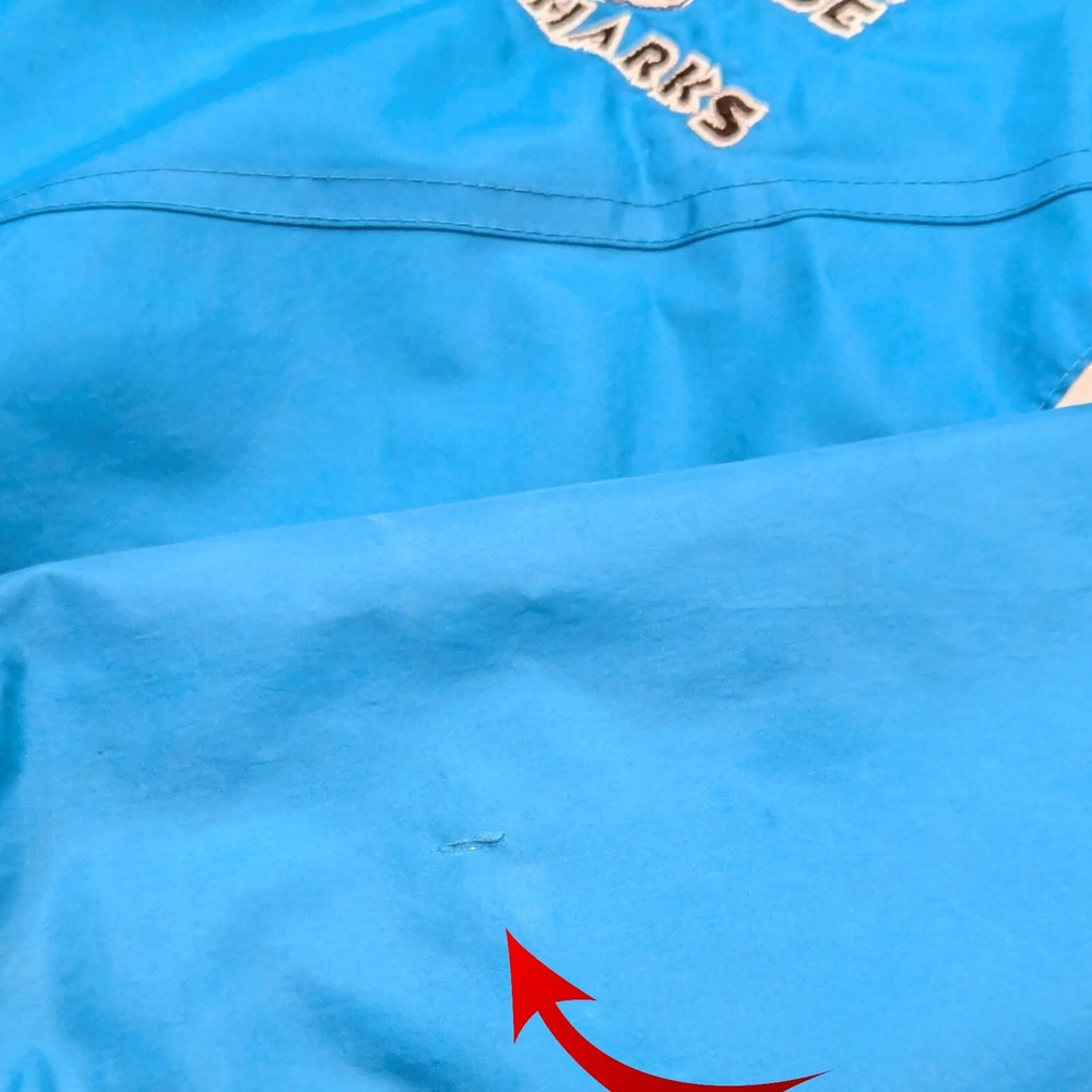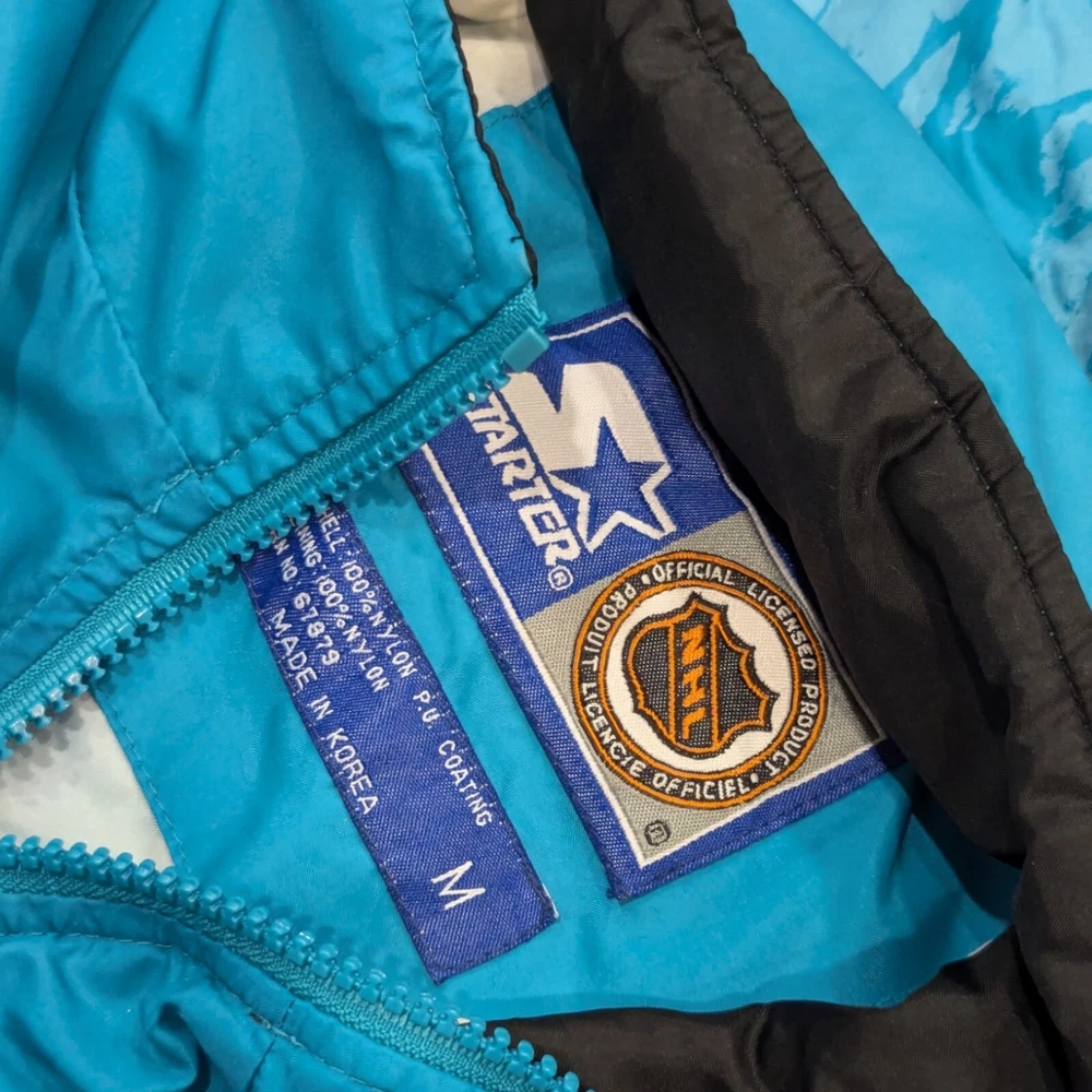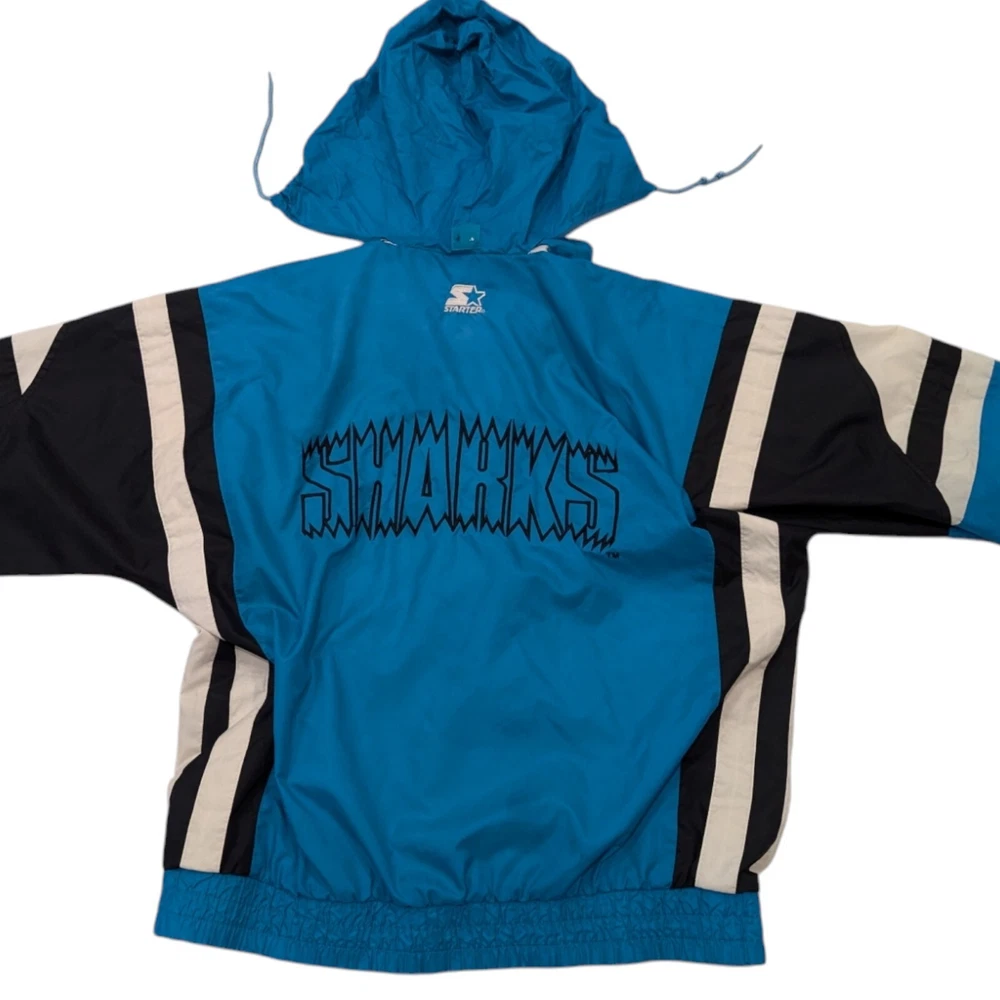 Vintage 90s San Jose Sharks Starter NHL Hockey Windbreaker Jacket Medium Pre-owned Prewashed in detergent More teal than pics show A lot of wear: Hood has marks on the inside Both ends of the sleeves have a bunch of marks Rip on the back Rip to the inside liner Marks on the front Refer to pictures for overall condition and sizing.