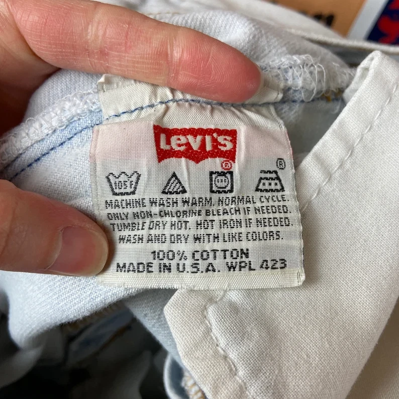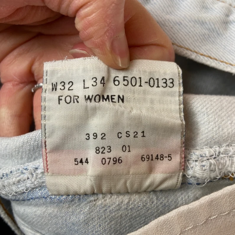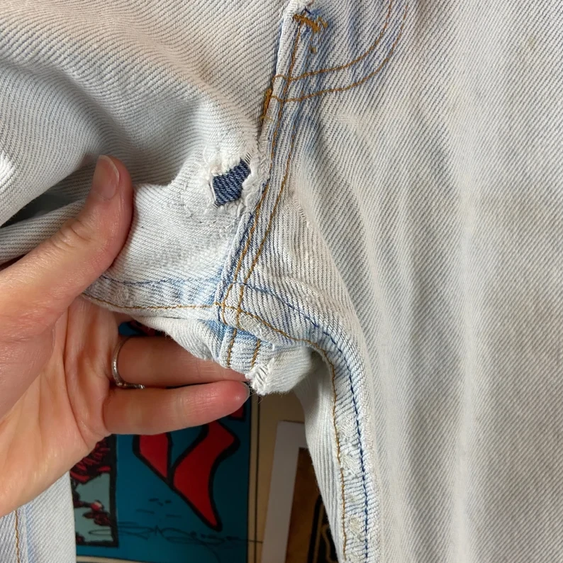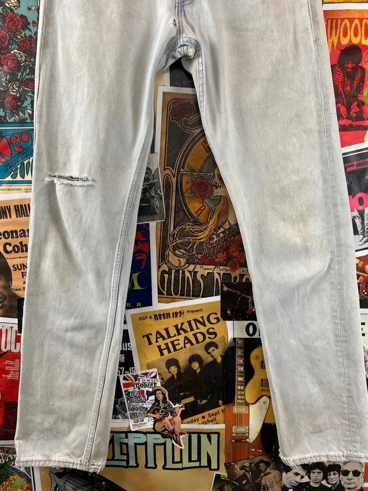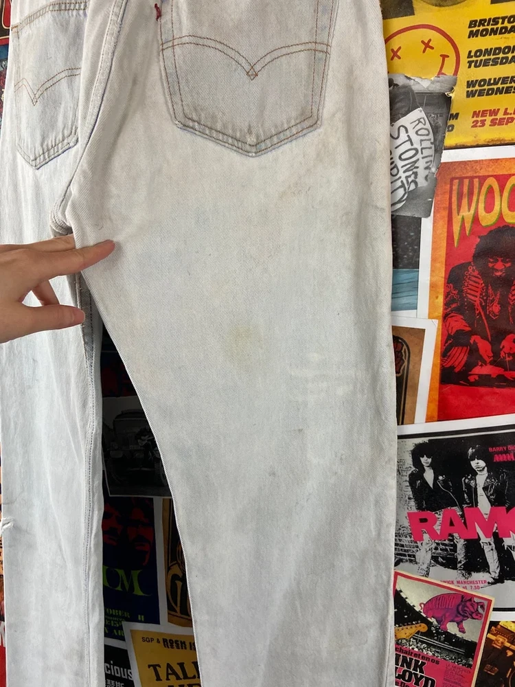 Vintage 90s light wash stained and faded Levi's 501 denim jeans. Made of 100% cotton in U.S.A. Selling in as is condition - has staining/discoloration and a mended hole {see images + video}. Tagged size 32x34, but measures at 30x33 3/4". Perfect 90s grunge jeans! Are tagged as a women's on the back of the label, but can be worn unisex. Check measurements for sizing. waist -- 30" hips -- 39" rise -- 11" thigh -- 21" inseam -- 33 3/4" cuff -- 7.5" total length -- 41"