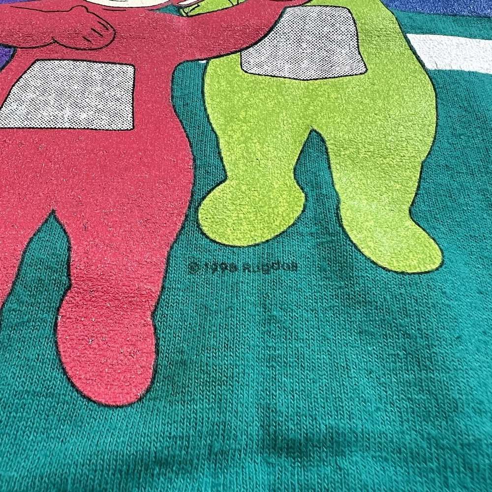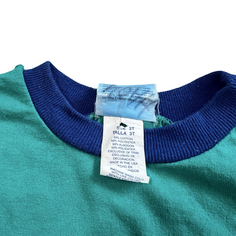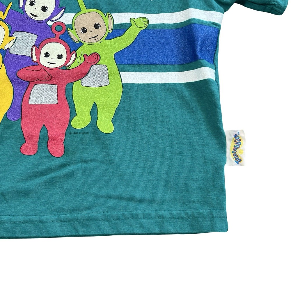 Brand: Teletubbies Style: Ringer T-Shirt, green body with navy crew neck and blue/white chest stripes Size: tag reads 3T Material: 50% Cotton, 50% Polyester (exclusive of trim) Details: Short sleeve toddler tee with full front graphic print of Teletubbies characters Tinky Winky, Dipsy, Laa-Laa and Po Tag text (as shown): 3T / TALLA 3T / 50% COTTON / 50% POLYESTER / 50% ALGODON / 50% POLIESTER / EXCLUSIVE OF TRIM / MADE IN THE USA / MACHINE WASH COLD / WASH WITH LIKE COLORS / GENTLE CYCLE Made in the USA Keywords: Teletubbies shirt, boys 3T, green ringer tee, toddler graphic, Tinky Winky Dipsy Laa-Laa Po
