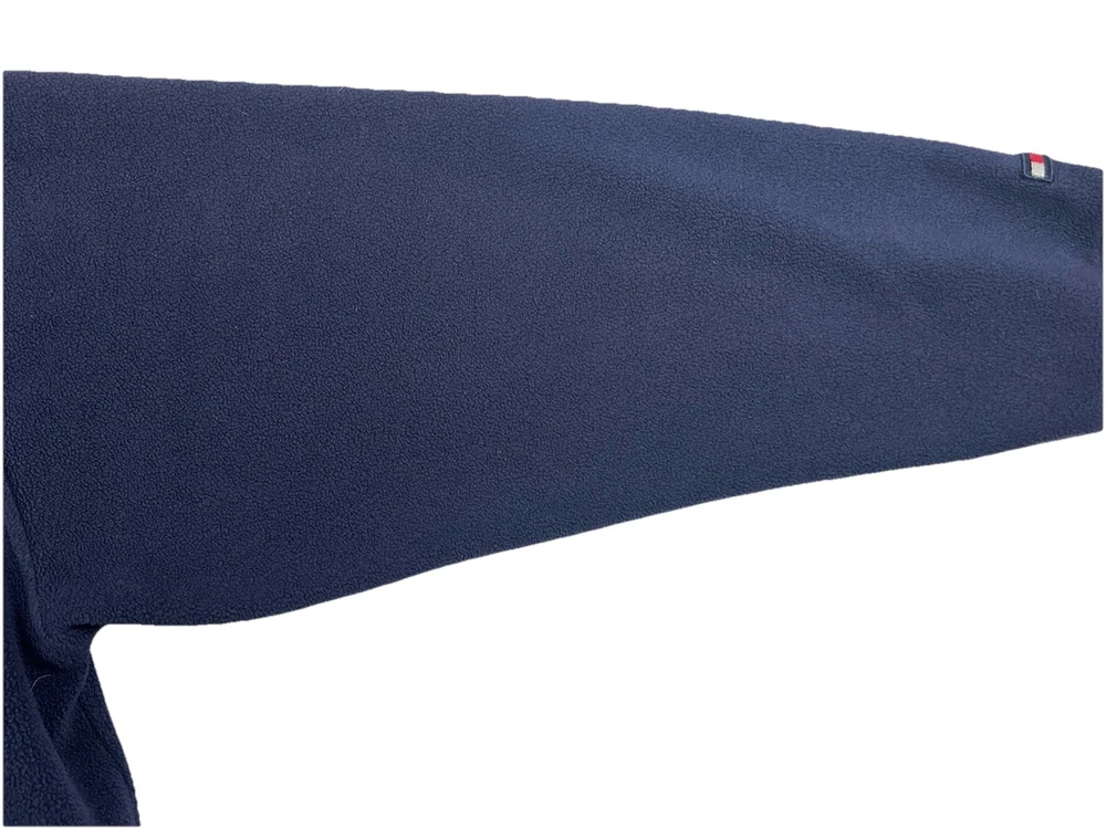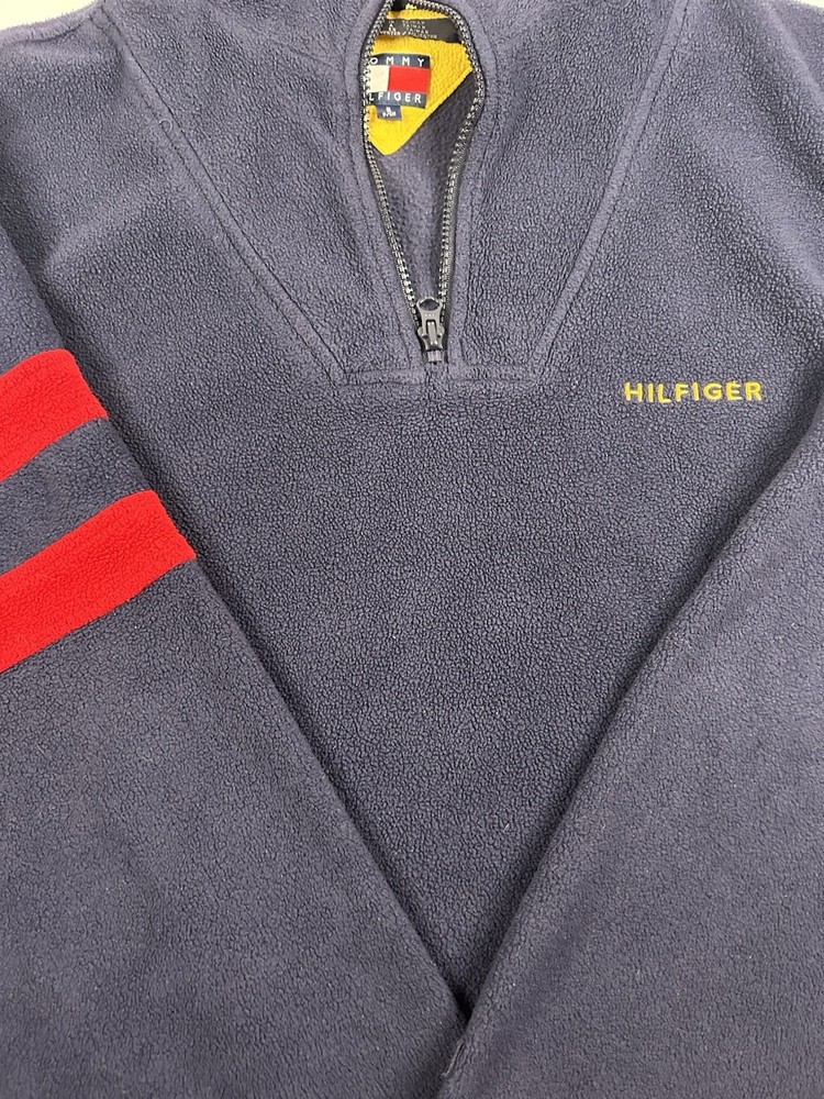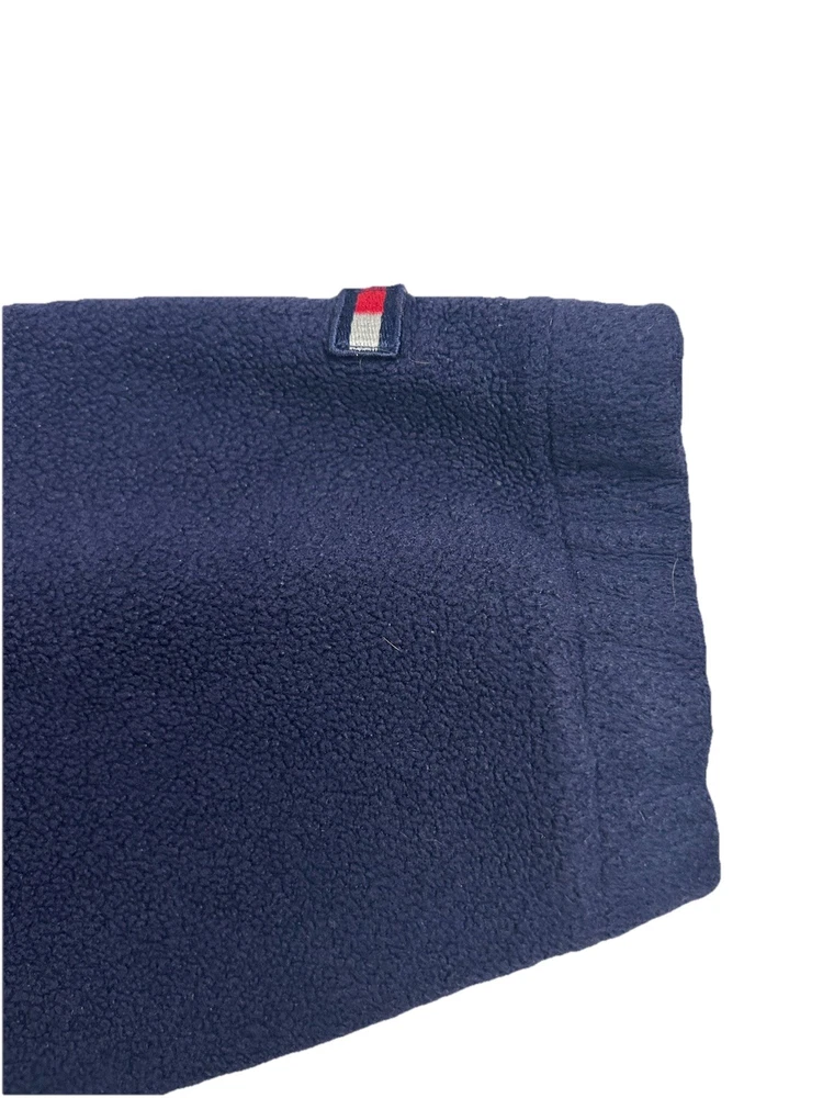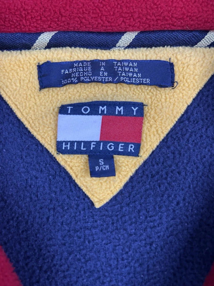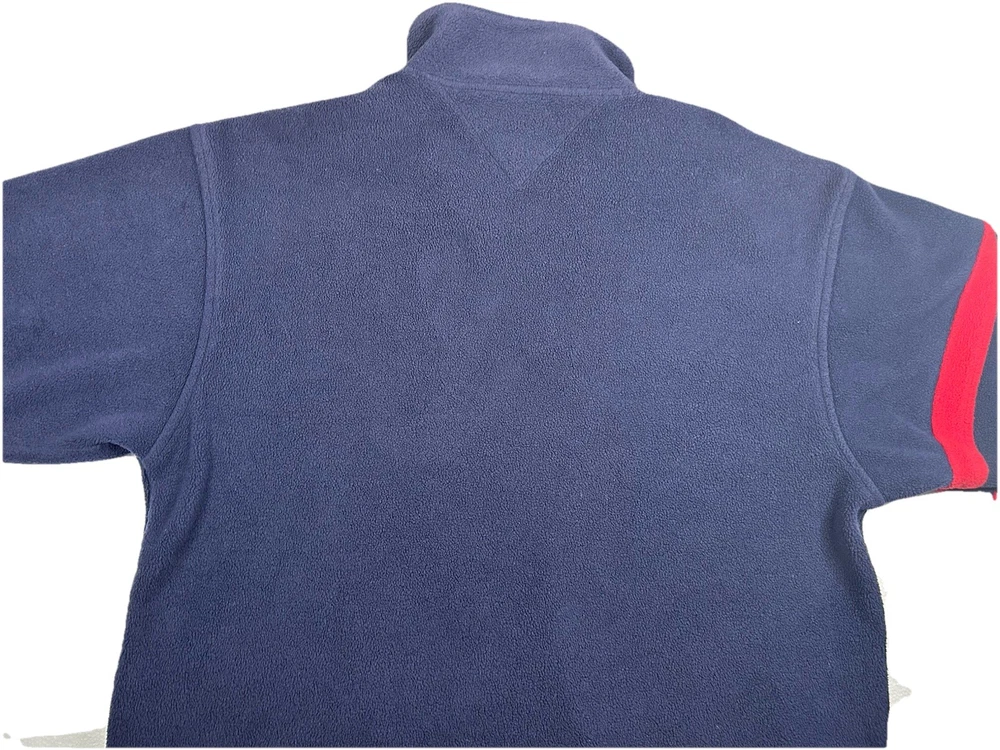 The Vintage 90s Tommy Hilfiger Navy Fleece Pullover with Red Stripes is a men's small sweatshirt featuring a classic solid color design with a collared neckline and long sleeves. Made from polyester fleece, this pullover is perfect for winter, fall, and spring seasons. The red stripes add a pop of color to the navy blue background, while the Tommy Hilfiger logo accents give it a vintage touch. This regular fit sweatshirt is machine washable and ideal for casual everyday wear, making it a stylish and comfortable addition to any wardrobe.