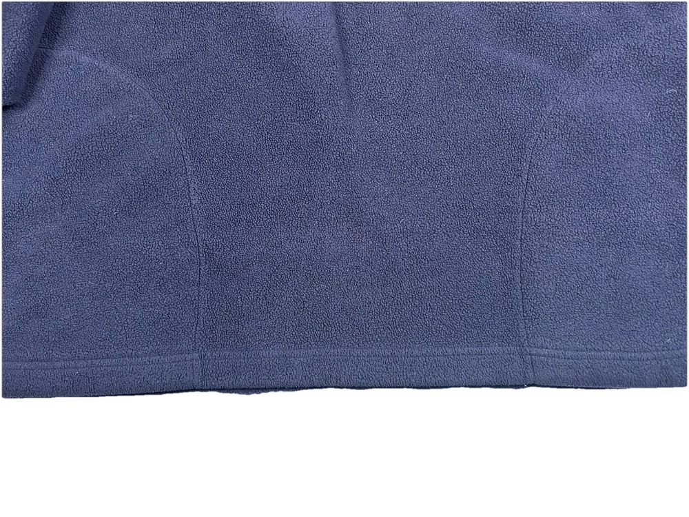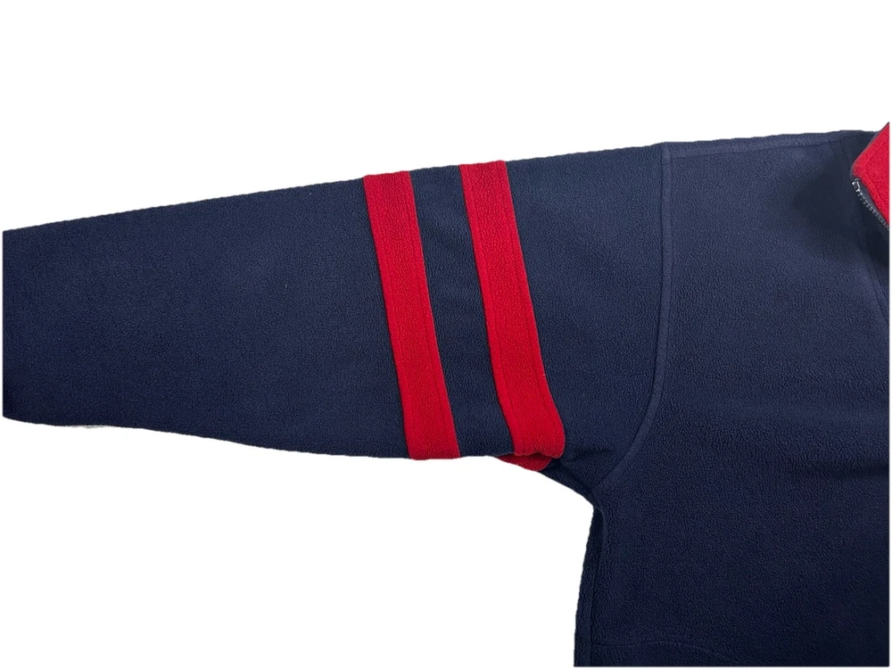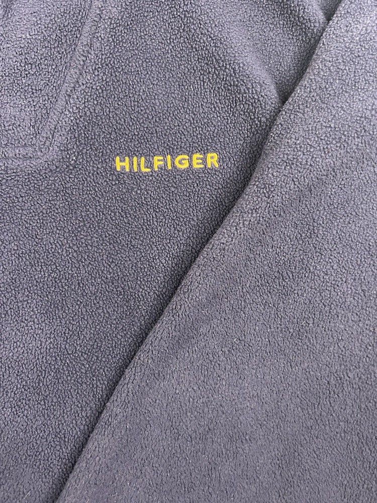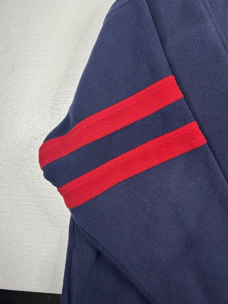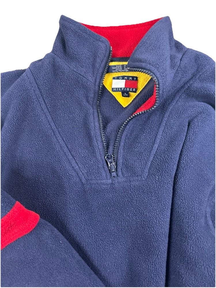 The Vintage 90s Tommy Hilfiger Navy Fleece Pullover with Red Stripes is a men's small sweatshirt featuring a classic solid color design with a collared neckline and long sleeves. Made from polyester fleece, this pullover is perfect for winter, fall, and spring seasons. The red stripes add a pop of color to the navy blue background, while the Tommy Hilfiger logo accents give it a vintage touch. This regular fit sweatshirt is machine washable and ideal for casual everyday wear, making it a stylish and comfortable addition to any wardrobe.