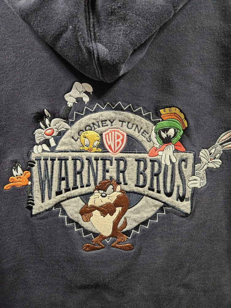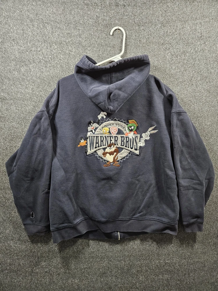 Size: XL Brand: Warner Bros. Theme: 90s, Cartoon Type: Hoodie Sleeve Length: Long Sleeve Closure: Zip Accents: Embroidered Vintage: Yes Features: Hooded, Pockets Department: Men Color: Blue Size Type: Regular Style: Full Zip