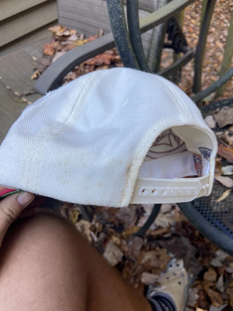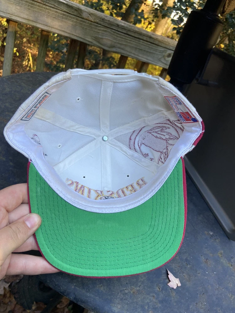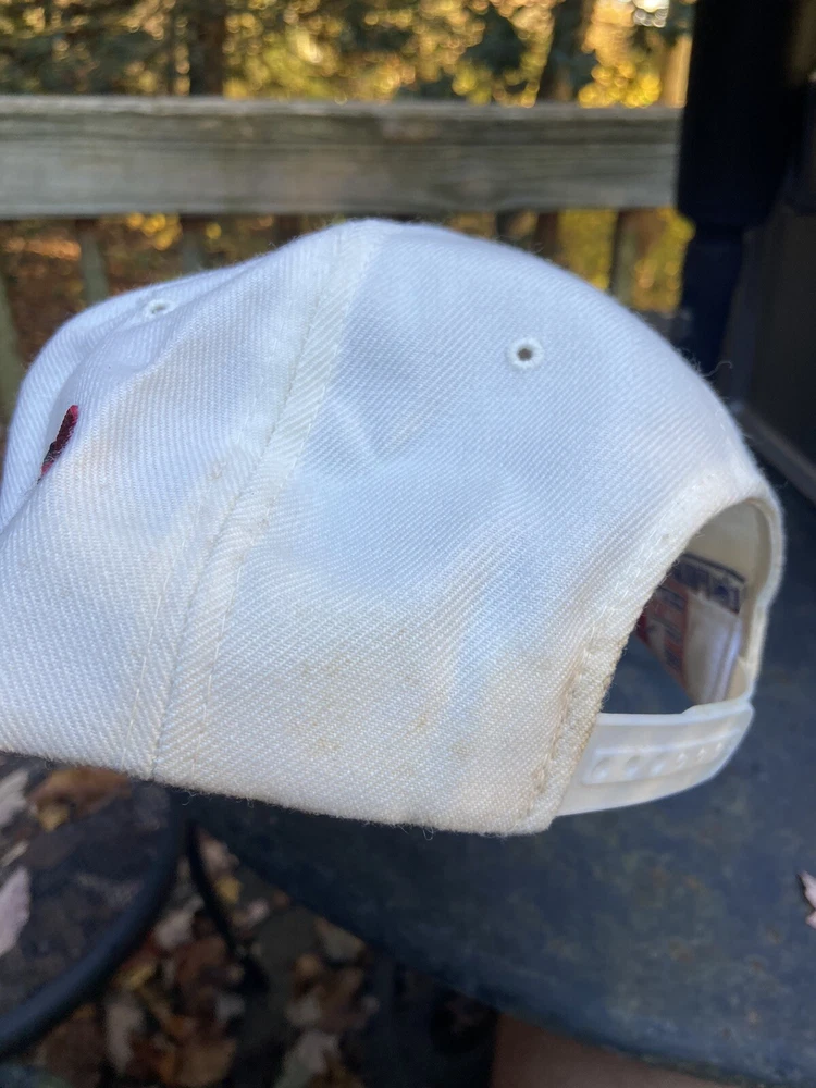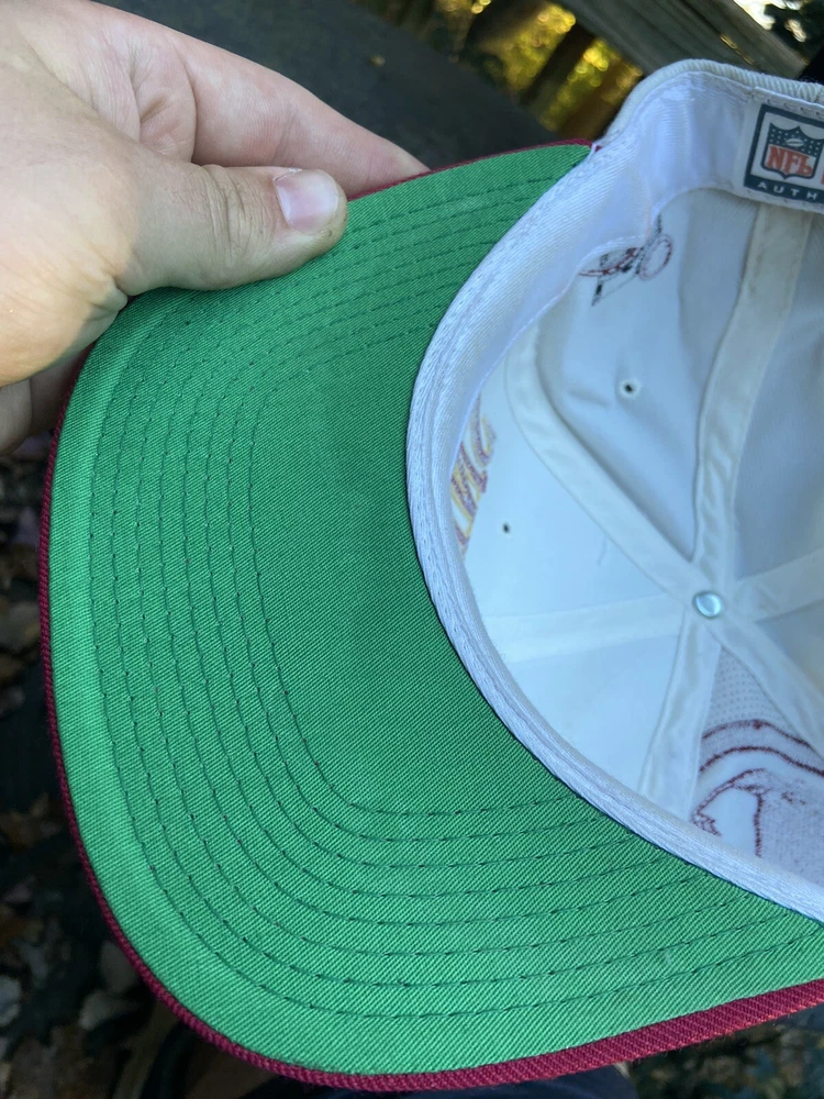 Vintage 90s Washington Redskins NFL Laser Sports Specialties Shadow Snapback Hat. A super cool hat with the Redskins logo and the team's name behind it in a cool script. It has the one panel with the laser design and logo. The hat has sat in storage for an extended amount of time so there are some storage stains throughout the hat as shown in the pictures. There are marks around the entire inner brim, and there are some marks on the outside of the panels and throughout the hat. A good and thorough clean would restore the hat and make it look great. A great piece for any fan of vintage hats and vintage Redskins gear.