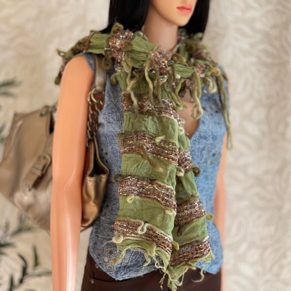 Vintage Y2K Grunge Fairy Scarf Hippie bohemian distressed Description: 90s or 00s green multicolor silk blend scarf by Scala. ***Other clothing/accessories not included. Condition: good. Yarn coming loose in some places; adds to overall character of scarf Dimensions: - length: 52 inches - width: 19 inches