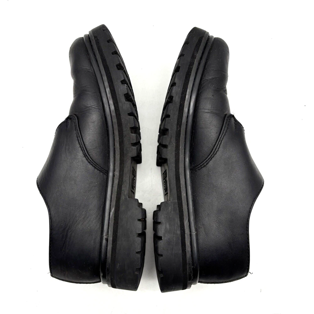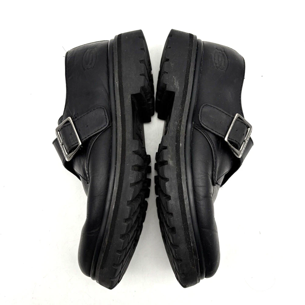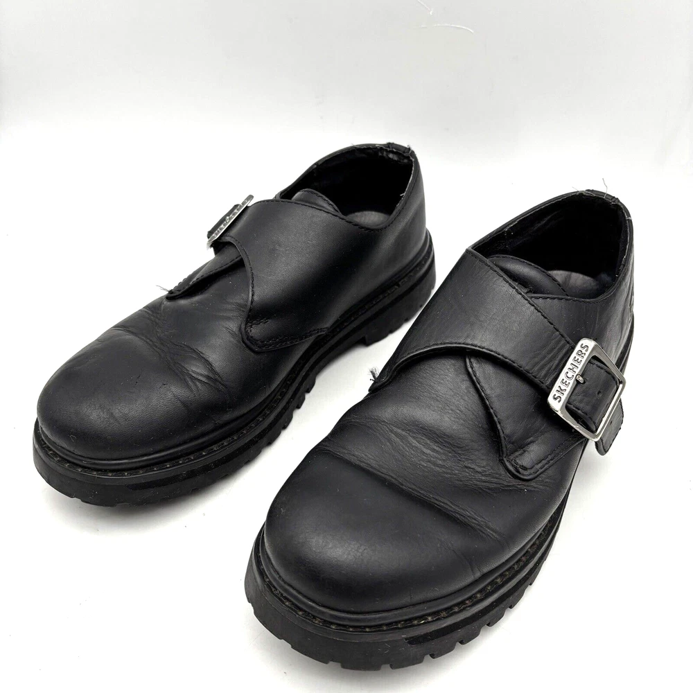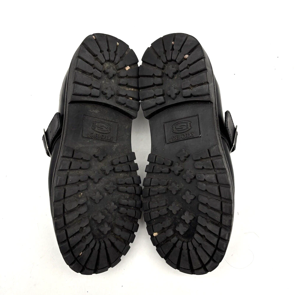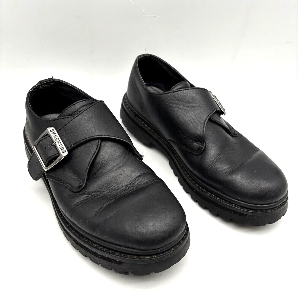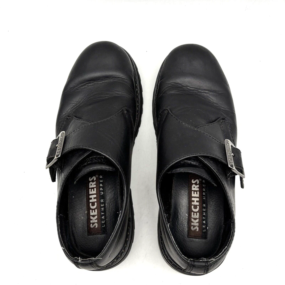 Vintage 90s Y2K Skechers Loafers Style Code: 6649 Black Genuine Leather Chunky Sole Silver-tone Buckle with Adjustable Strap 1 3/4" heel 1" platform Size: US Men 7.5 US Women 9.5 UK 6.5 EU 40 Great pre owned condition. Gently owned. Mild wear on soles. Creasing in leather around toes. Inner tag has flaking from age. All flaws shown in photos. Clean and from a smoke free home.