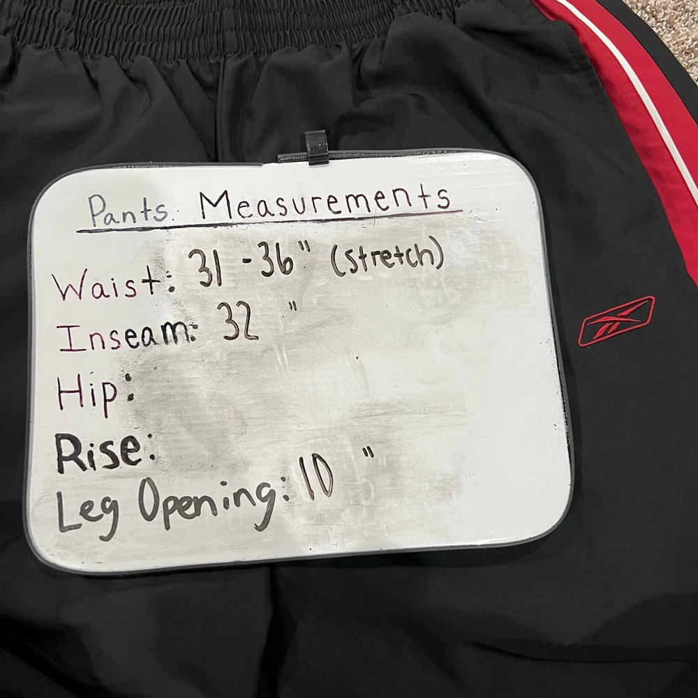 Vintage 90s men's black red Reebok wide leg lined baggy windbreaker track sweatpants w/ zippered ankles Tag Size: L Waist: 31-36" (stretch) Inseam: 32" Leg Opening: 10" Item is in good used condition. Look at photos to see the condition. All, if any, flaws have been pictured. See the last photo for measurements. The waist measurements are measured flat and then multiplied by 2 to get the full measurement around. Please know which measurements fit you prior to purchasing, and don’t just rely on the size tag. Feel free to ask any questions! ***Item is cross posted on several platforms***