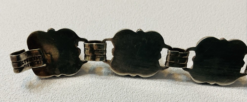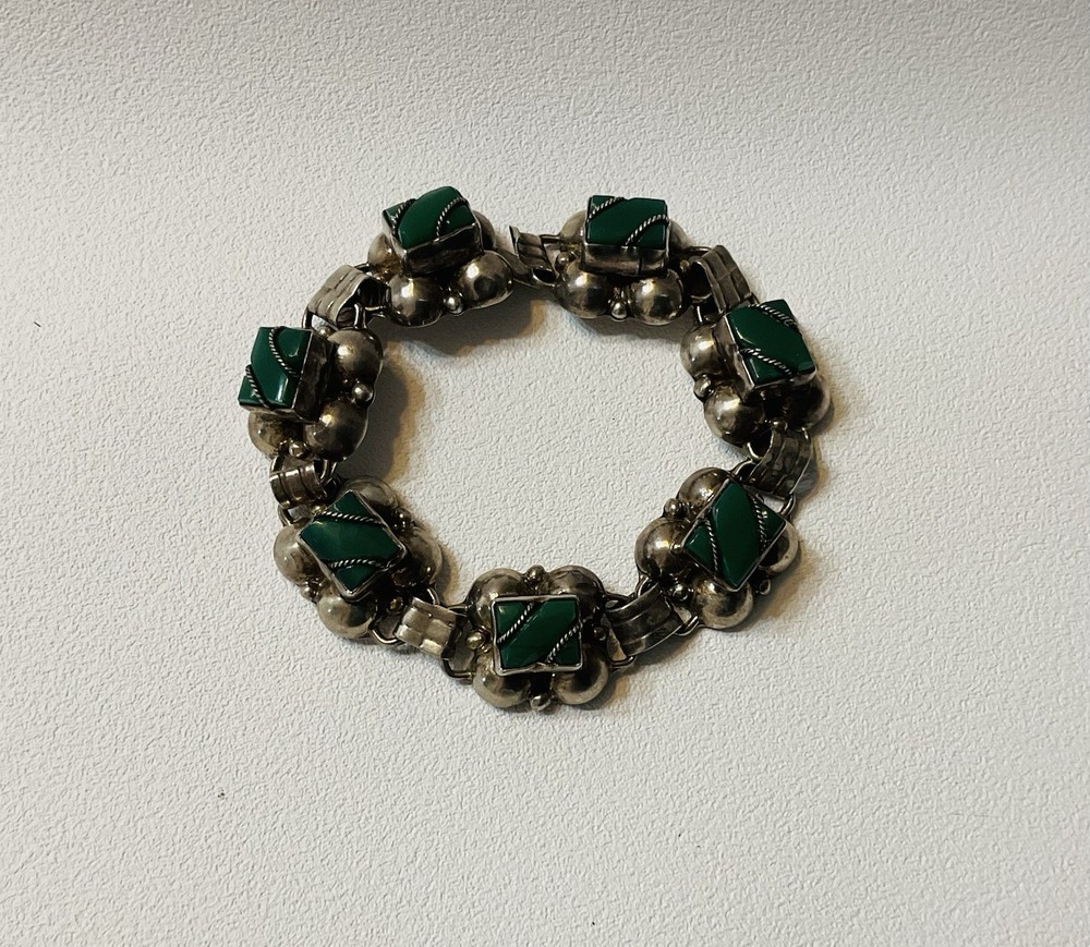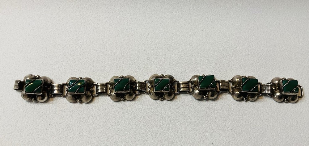 This vintage Mexico 925 silver bracelet features green onyx stones set in sterling silver. The chain style bracelet is crafted in Mexico and showcases the elegant beauty of the green onyx stones. Perfect for adding a touch of sophistication to any outfit, this bracelet is a unique and eye-catching accessory that will make a statement.