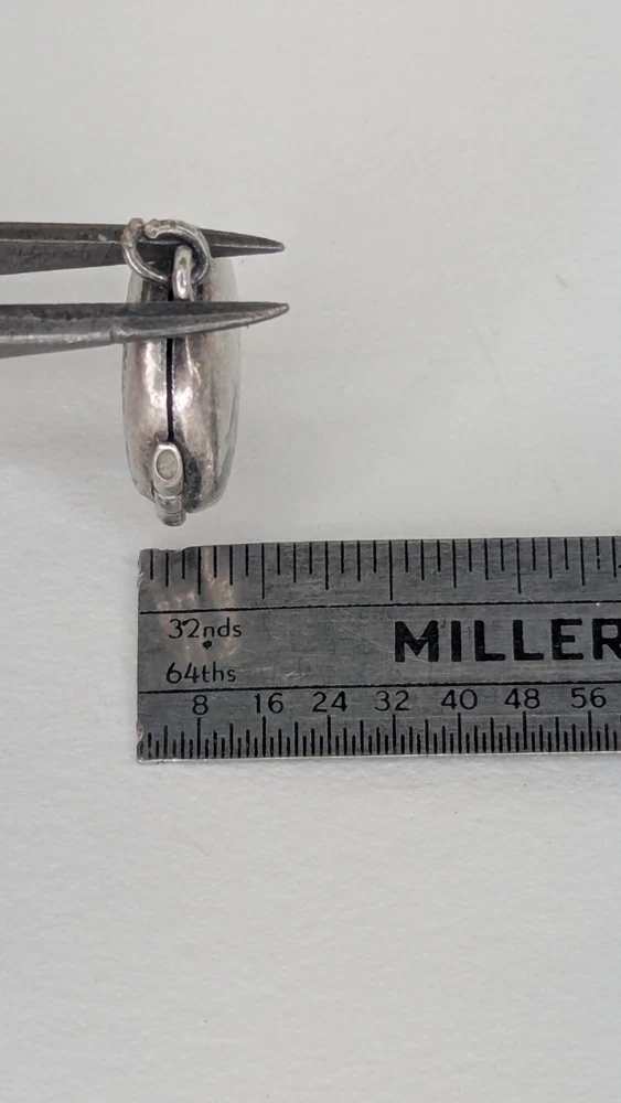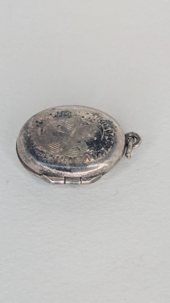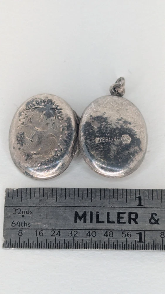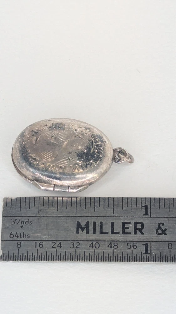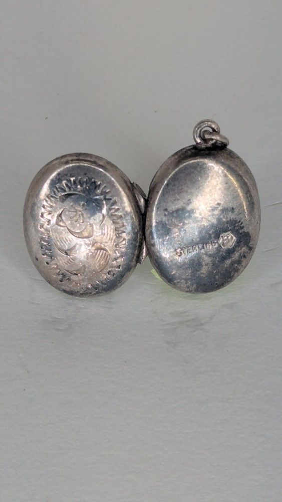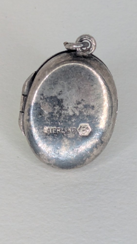 Vintage oval photo locket without chain. Marked Sterling alongside a 'B' in a hexagon, the makers mark for Birks of Canada at the time it purchased the company Burkhardt, between 1943-1950. Item shows some wear and tarnishing, a testament to its age. Delicate and beautiful, this piece holds history and endures as a charming votive of times gone by. Please check out my other listing and thank you for viewing!