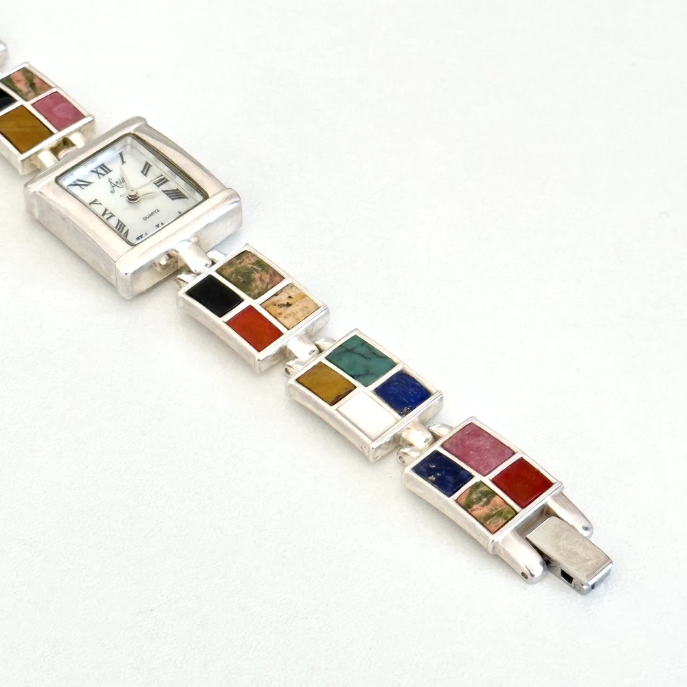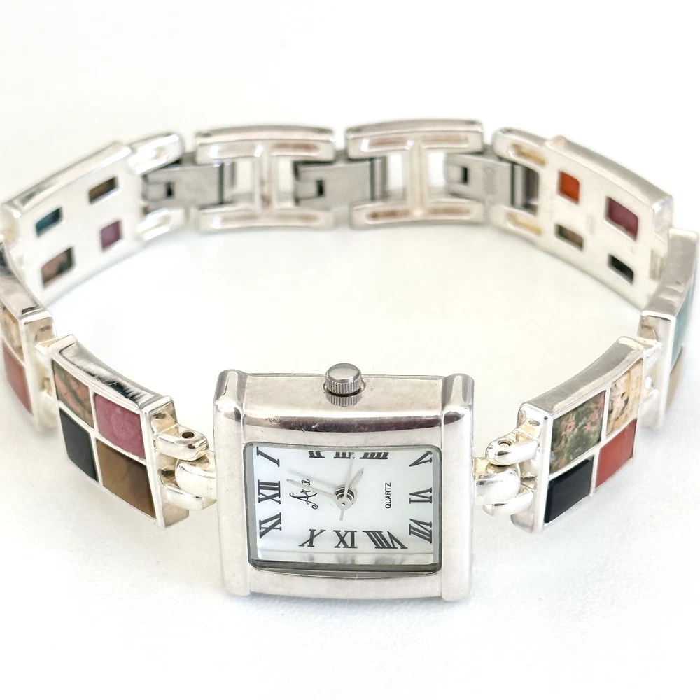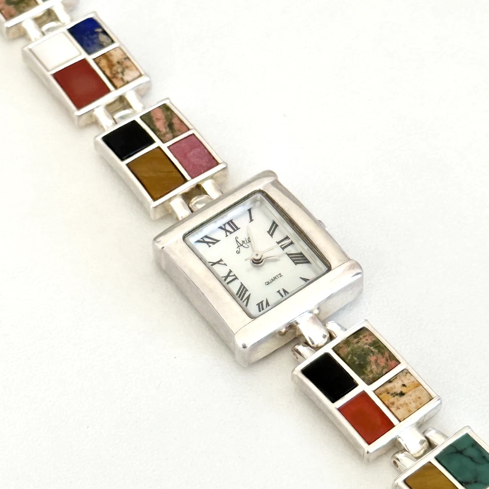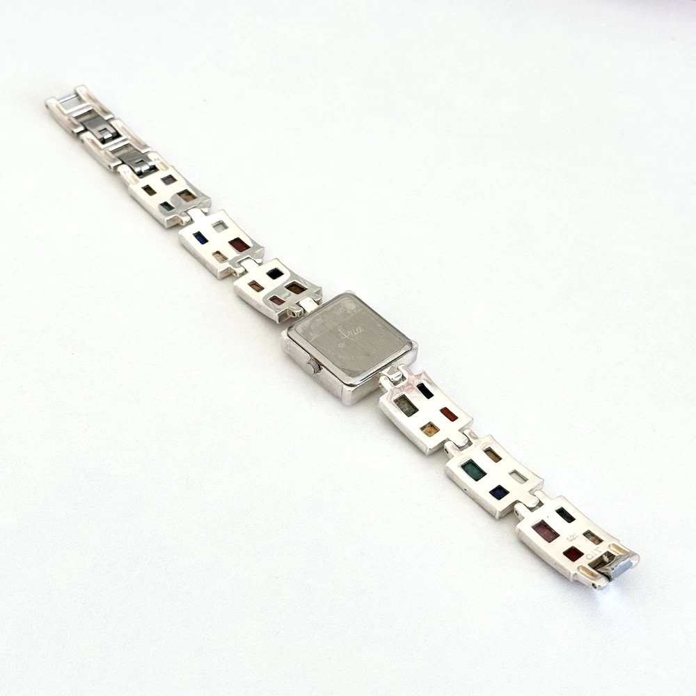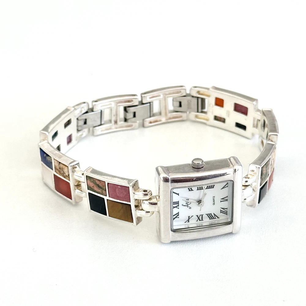 Vintage 925 Sterling Silver Aria Multi Gemstone Watch 7" Length: 7" Weight: 46.4 grams Signed: "OIT 925" on the chain part and "Aria Stainess Steel" on the clock part, Please note, needs a new battery. Otherwise in very good vintage condition. - Fast shipping, I ship the same or next business day! I also combine shipping. - Thank you so much for shopping with me and please check out my other jewelry listings, I post new pieces daily!