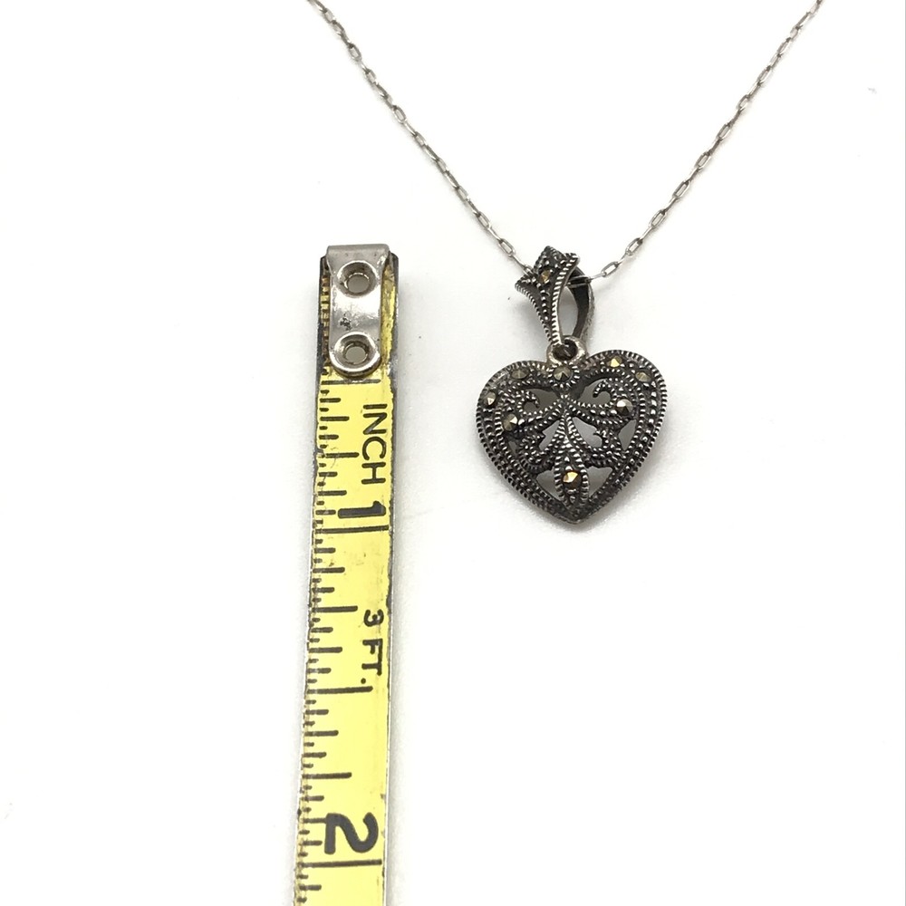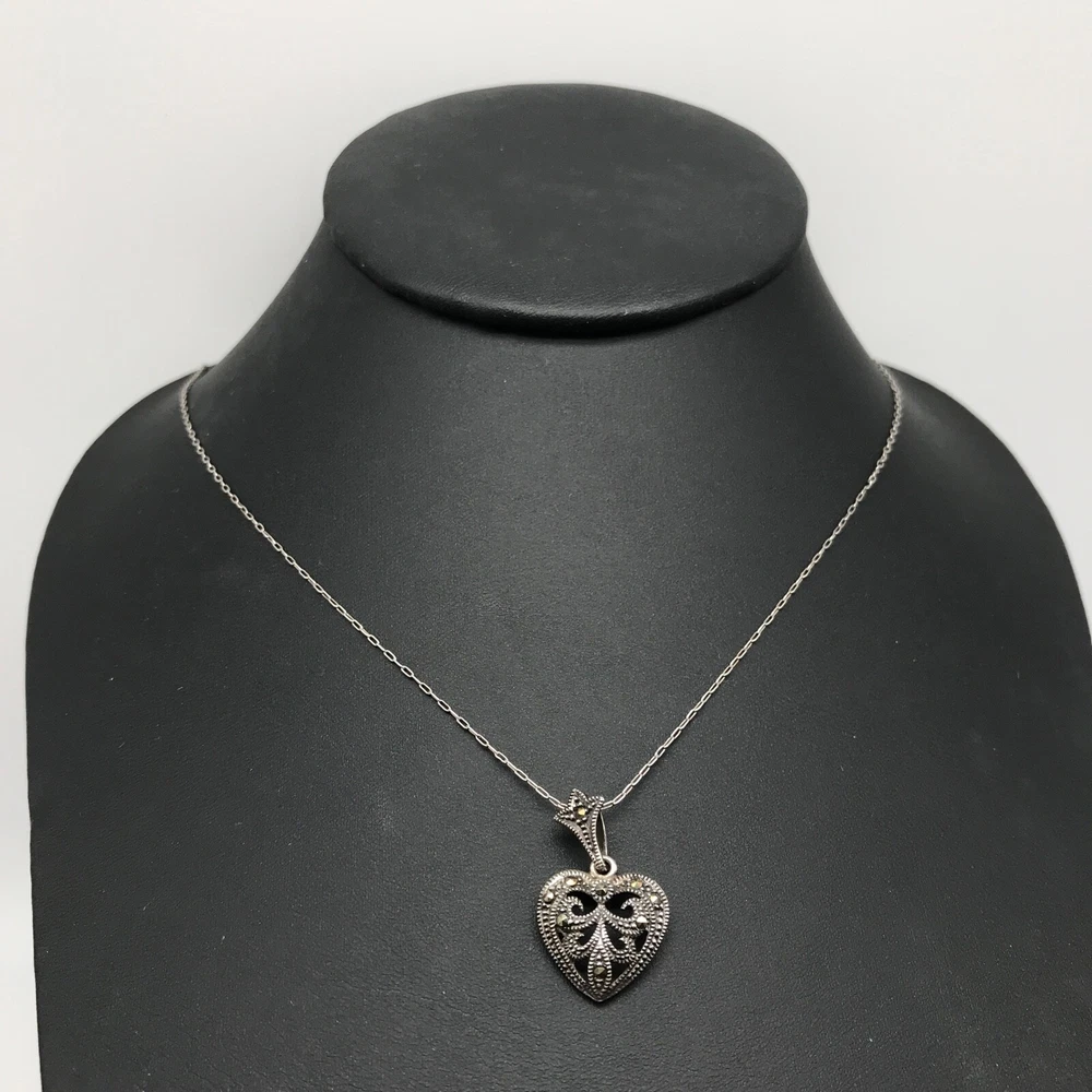 Vintage 925 Sterling Silver Marcasite Openwork Heart Pendant Petite Necklace I tem details: Lovely vintage sterling silver petite heart pendant on delicate chain necklace Length: 21" Pendant size: Just under 1" long Weight: 2.5 grams Marking: 925 Very good vintage condition - Please note, most of my store's items are vintage or pre-owned. Most items are in very good or good estate condition, but please also view all pictures. Well cared for. All sterling silver is marked 925/sterling or tested. Please feel free to ask any other questions you may have! I also combine shipping. - Jewelry is shipped safe and securely with a gift box or pouch included. - I typically will ship same or next business day! - Thank you so much for shopping with me and please check out my other jewelry listings, I post jewelry daily!