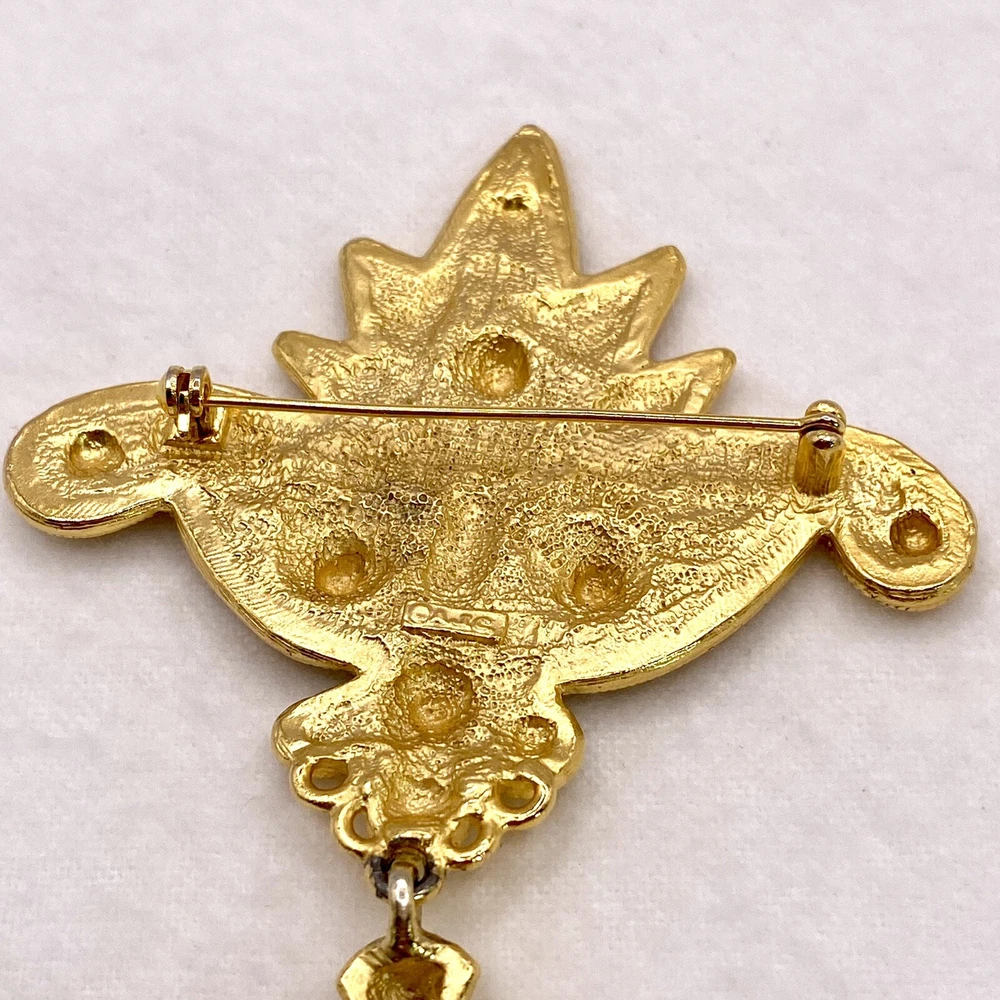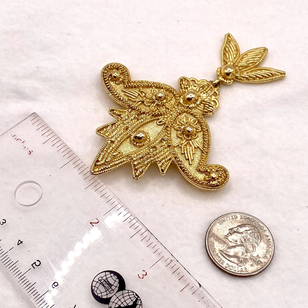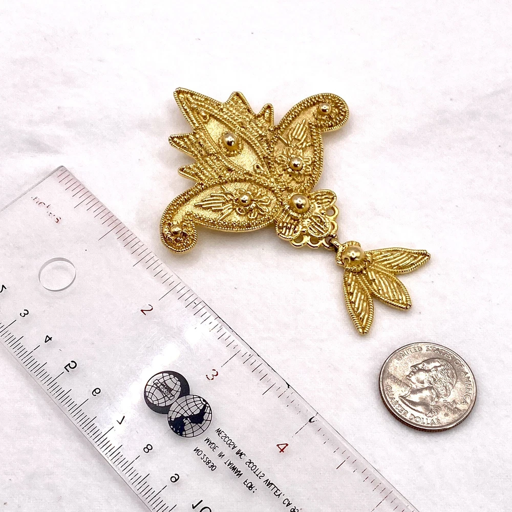 Add a touch of vintage beauty to your outfit with this stunning goldtone Les Fleur articulated scroll filigree large brooch pin from AJC. The intricate flower design is perfect for any occasion, whether it's a wedding, graduation, or just a casual day out. The pin is 3.75" in length and features eye-clean gemstones with excellent cut grade. This unique piece is perfect for those who love nature, art, and family & friends. It's a great addition to any collection and makes a perfect gift for Mother's Day, Father's Day, Christmas, or Valentine's Day. Whether you're a collector or just looking for a beautiful accessory, this brooch is sure to impress. Vintage Goldtone Les Fleur Articulating Scroll Filigree Large Brooch Pin State Y. This brooch is in excellent condition This is a pre-owned piece. It may require cleaning. There may be scratching, fading, chips, normal wear, missing stones, etc… See Photos. If you have any questions, please feel free to contact me via eBay w. Thank you for stopping by. Make sure to check out other items in my store. Your satisfaction is my priority. Have a wonderfnnul blessed day!
