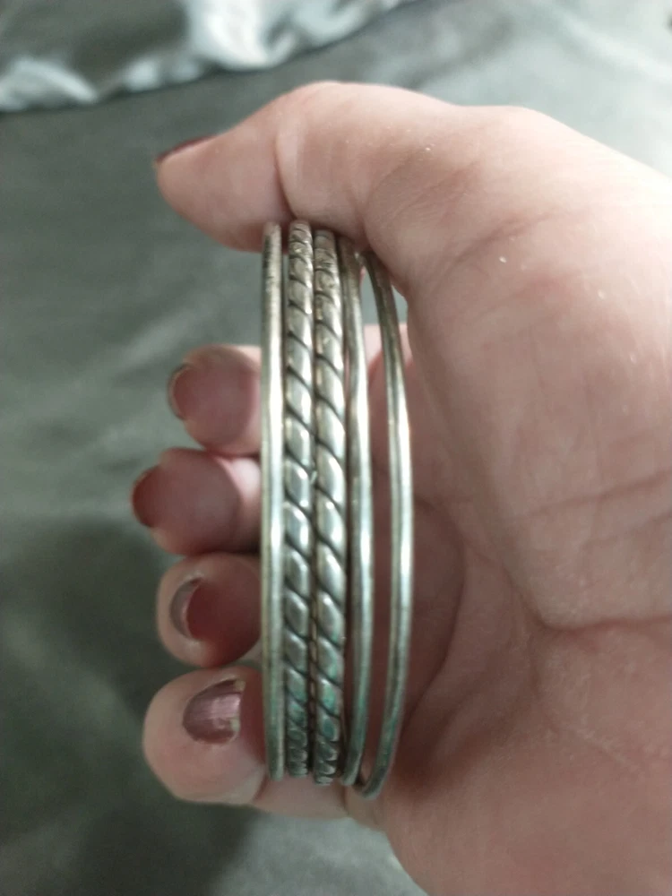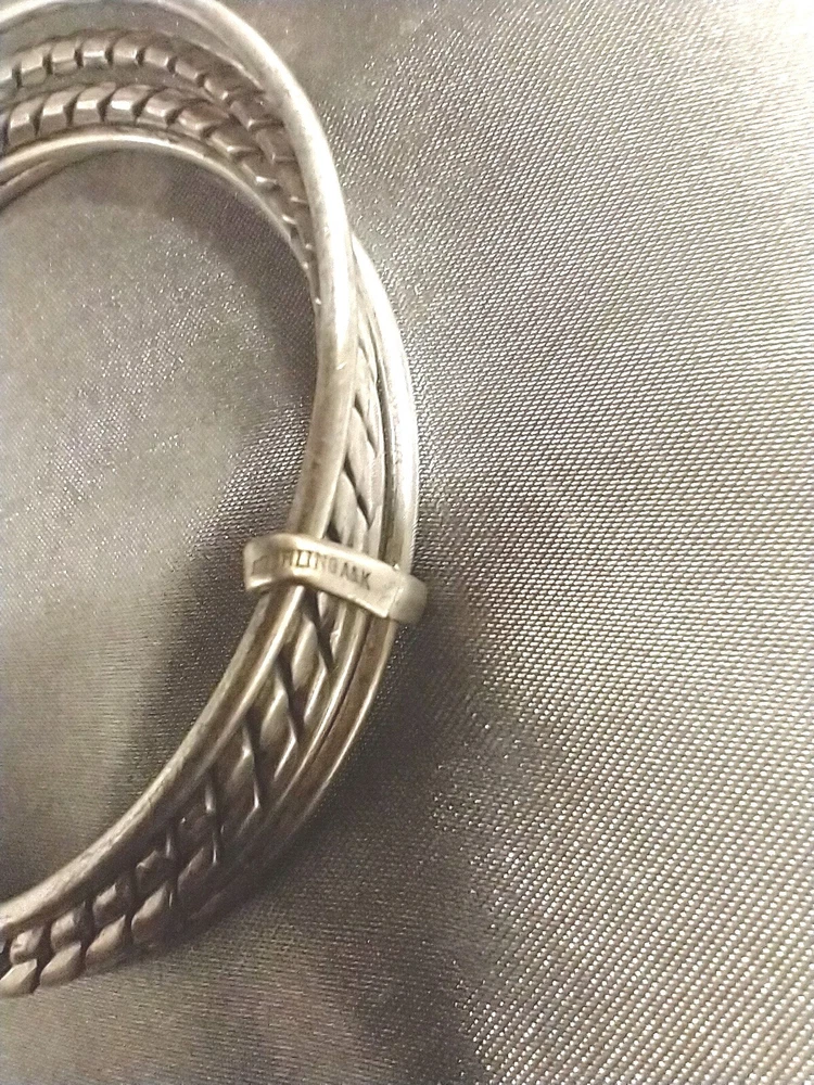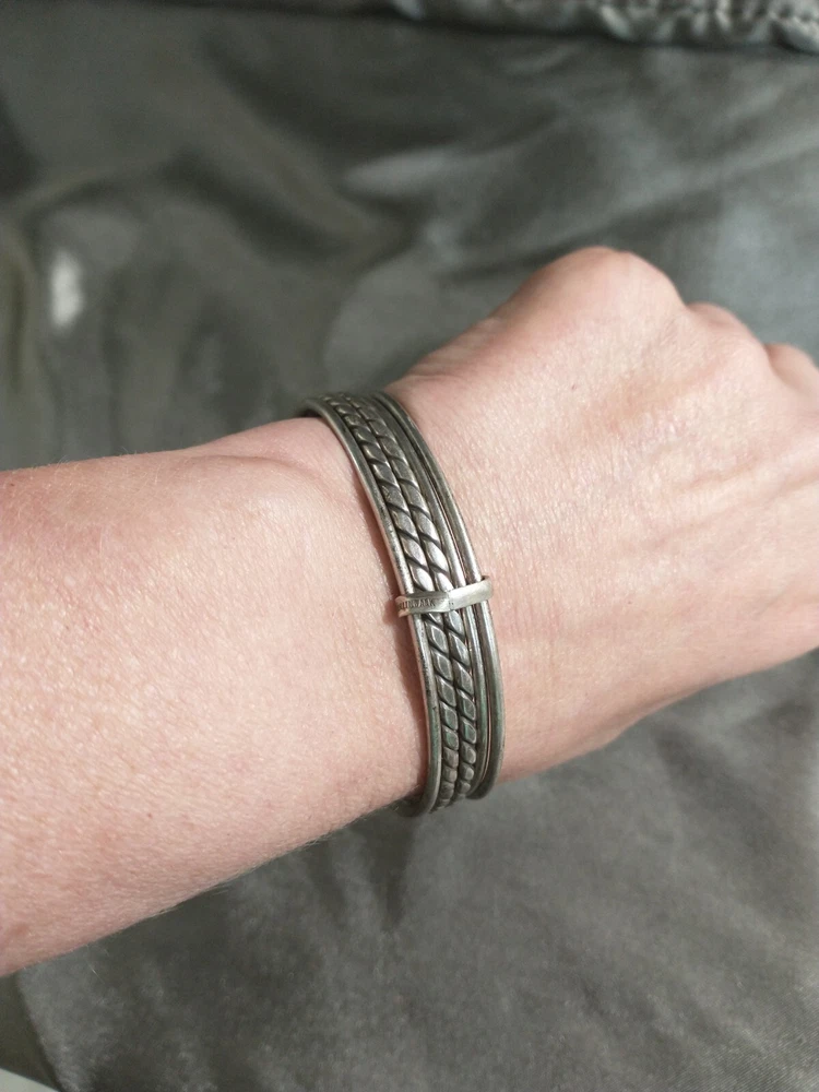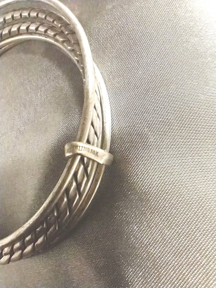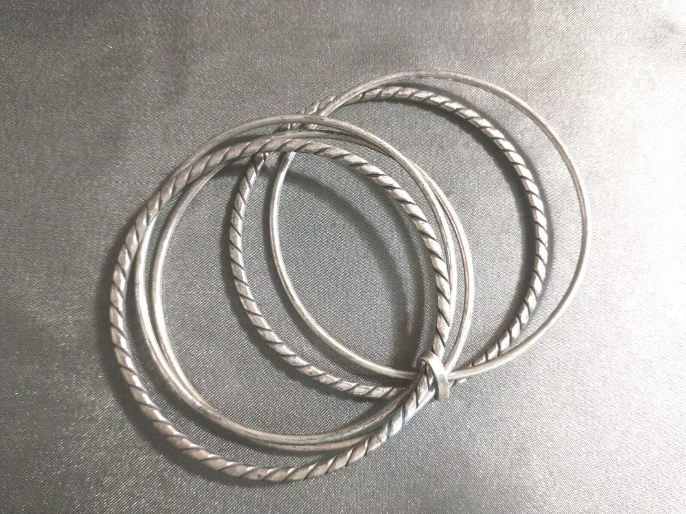 Please see images for size and condition description. SET of 5 Aarre Krogh sterling silver bangle bracelets. Three are solid and two are twisted. The opening is 2.5 inches. My wrist is 6.5 inches. The tag which is stamped STERLING A&K is soldered closed. Aarre Krogh is a Danish silversmith company that operated from 1949-1990 in Randers Denmark. I have not cleaned them, I'll leave that up to the buyer. 42 grams. As is. Thanks! FREE SHIPPING