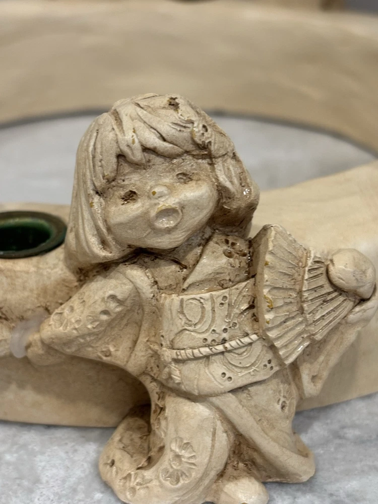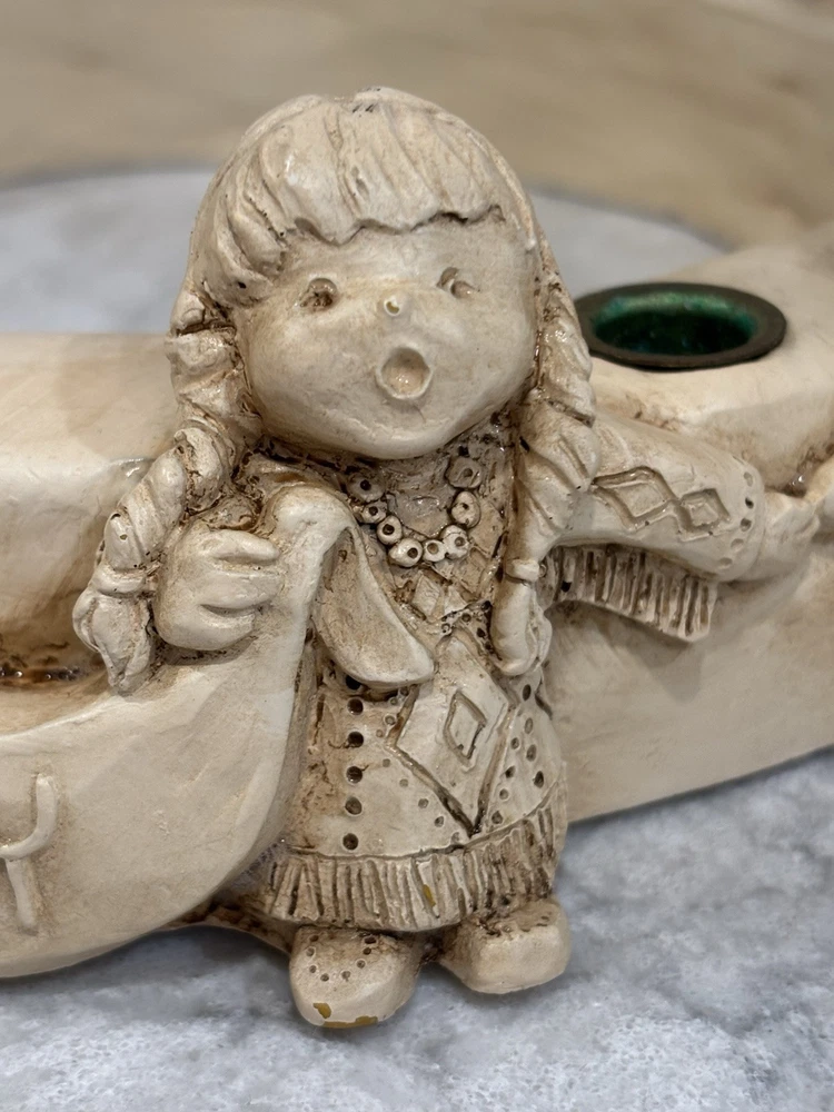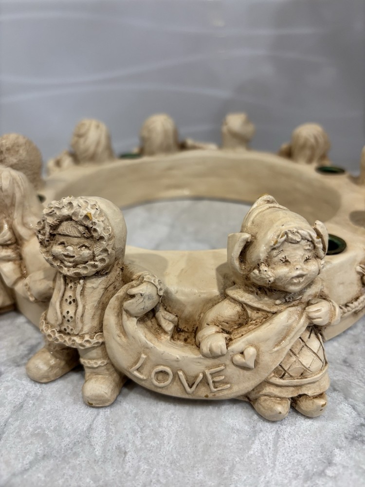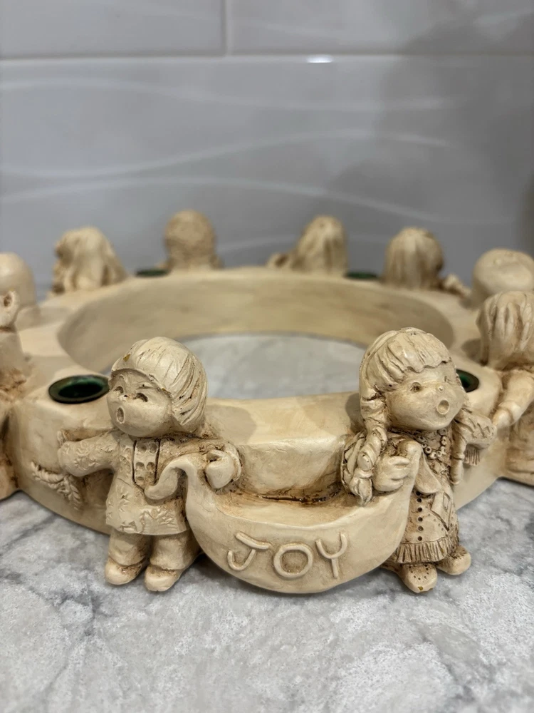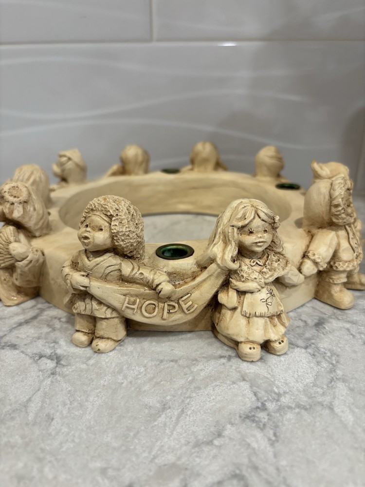 Vintage advent wreath candle holder. The wreath has 10 children from around the world with signs reading Love, Joy, Hope, and Peace. It was made in the USA bt Abbey Press. Its diameter measures approximately 10” and is about 3” in height. It has the look of wood but is is a resin like material. Preowned. Good condition.