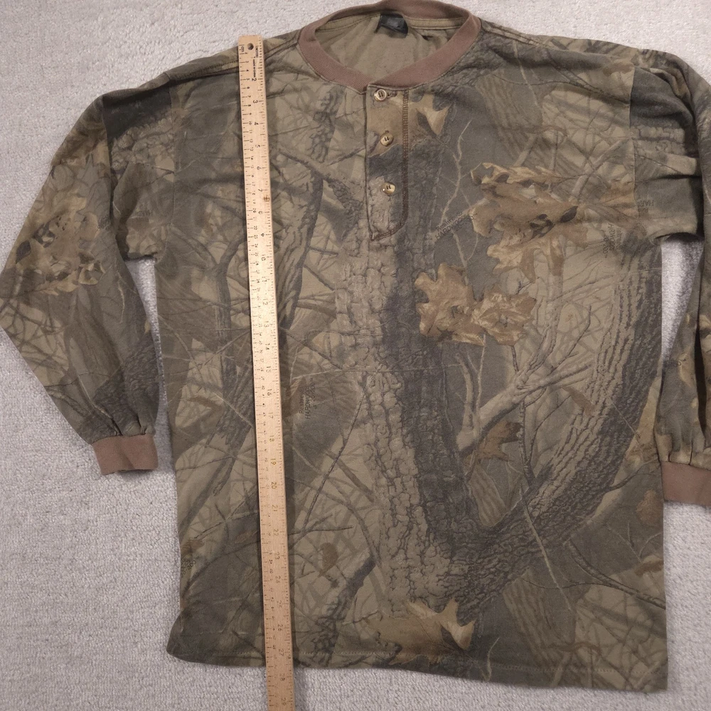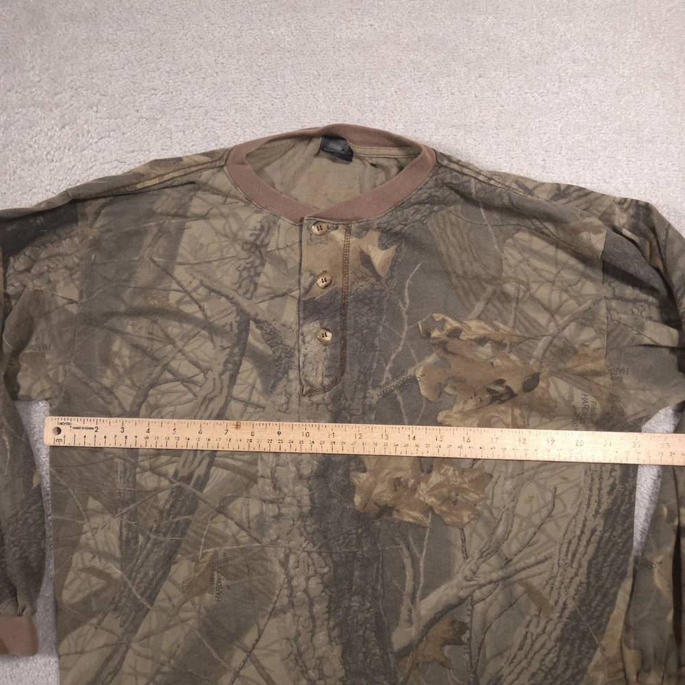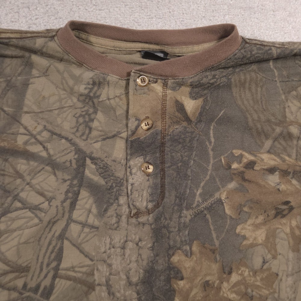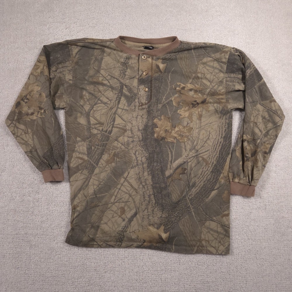 Vintage Ace Sportswear Shirt Mens XL Brown Realtree Camo Henley Long Sleeve USA Pre-owned Ace Sportswear mens henley shirt with fabric clean and structurally intact across front, back, and sleeves. Material shows overall wash wear throughout, light fading to the camo print, and a few small faint spots near the lower front and hem as pictured. Ribbed collar, cuffs, buttons, and hems remain secure and functional; interior neck and care tags present but no original retail tags or packaging included. ΔΆBrand: Ace Sportswear Mens long sleeve henley shirt designed for hunting, outdoor layering, and casual everyday wear. Color and pattern: Brown and olive Realtree HARDWOODS 2000 woodland camouflage featuring tree bark, branches, and oak leaves across the entire garment. Design details: Three-button henley placket, ribbed crew neckline in solid brown, long sleeves with ribbed cuffs, and a straight bottom hem. Fabric and feel: 50/50 poly/cotton knit intended to feel soft, breathable, and comfortable for all-season layering in the field or around town. Fit and sizing: Interior neck tag indicates Mens size XL with a regular T-shirt style fit through the chest and body suitable for wearing over a base layer. Branding and tags: Woven black Ace Sportswear neck label reading ACE SPORTSWEAR XL MADE IN U.S.A. RN 62180 with separate care tag noting 50/50 POLY/COTTON and machine wash instructions; Realtree HARDWOODS 2000 logos printed within the camouflage pattern. Use occasions: Suitable for deer season, turkey hunting, scouting, hiking, camping, or casual outdoor wear during fall, winter, and spring. Condition notes: See the condition section for details. BoxbigD005