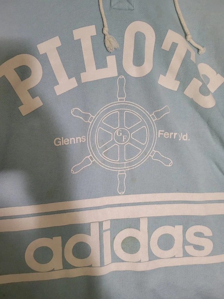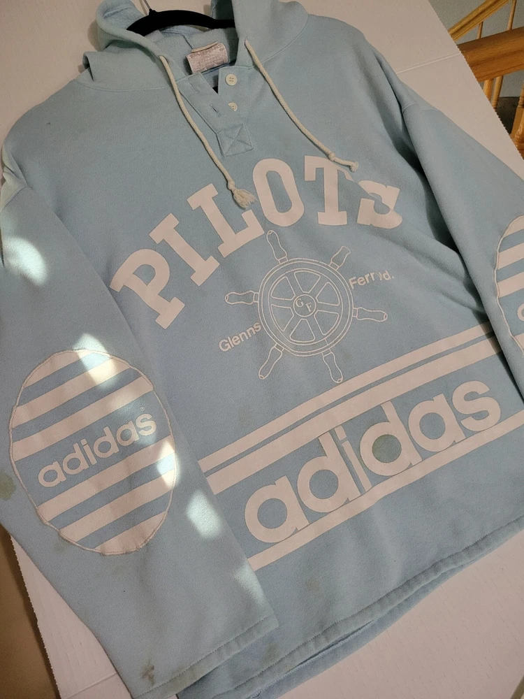 Vintage Adidas Lt Blue Hoodie 1/4 Button Elbow Patches Pilots Glenns Ferry ID