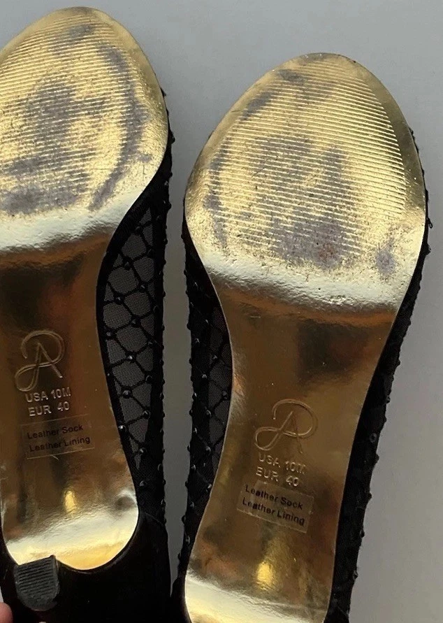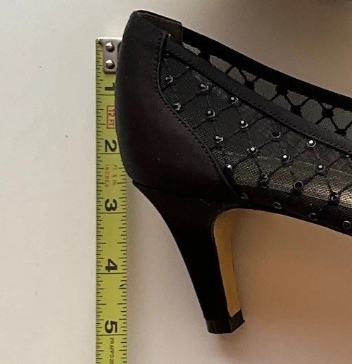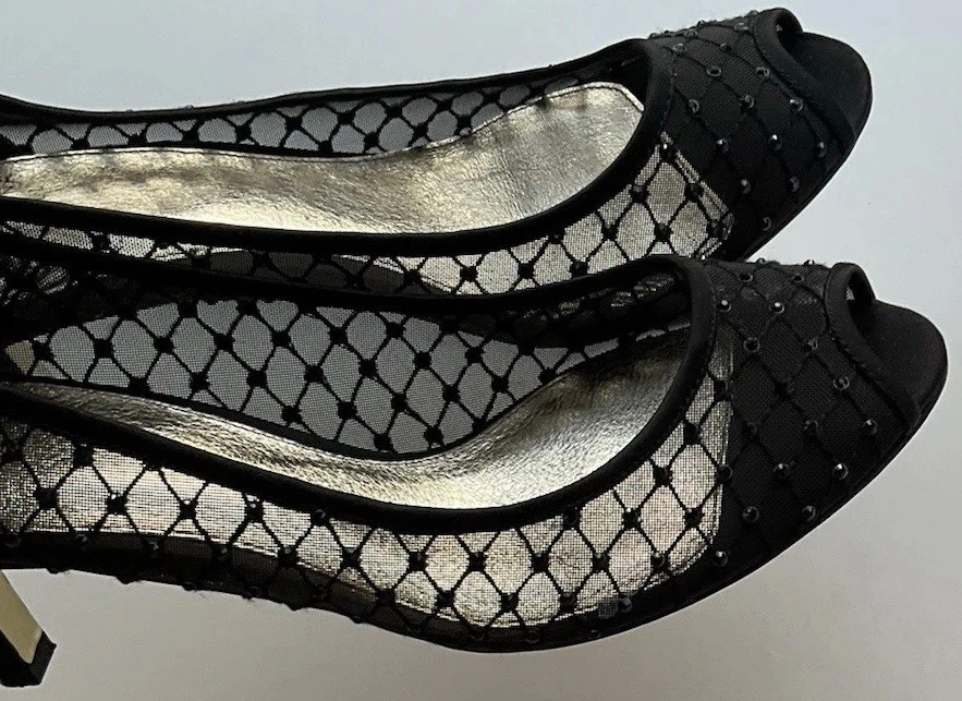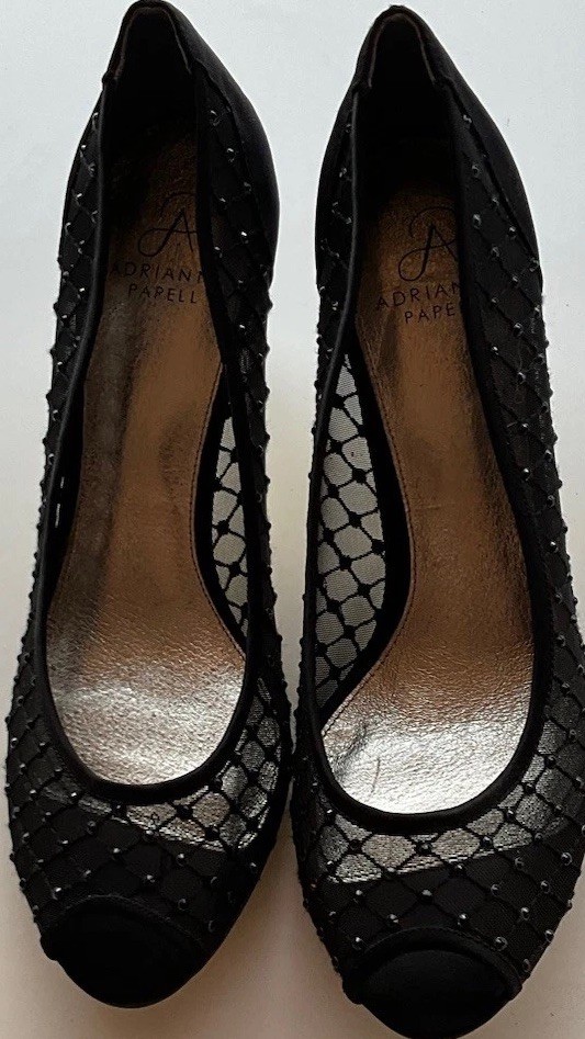 These Vintage Adrianna Papell Black Bedazzled Peep Toe Heels in Women's Size 10 exude a sophisticated and elegant charm. Made of leather with a classic peep toe design, these pumps are perfect for a variety of occasions such as weddings, formal events, or professional settings. The bedazzled detailing adds a touch of glamour, making them a timeless addition to any wardrobe. Perfect for those who appreciate vintage style and classic design with a hint of bohemian or Victorian flair.