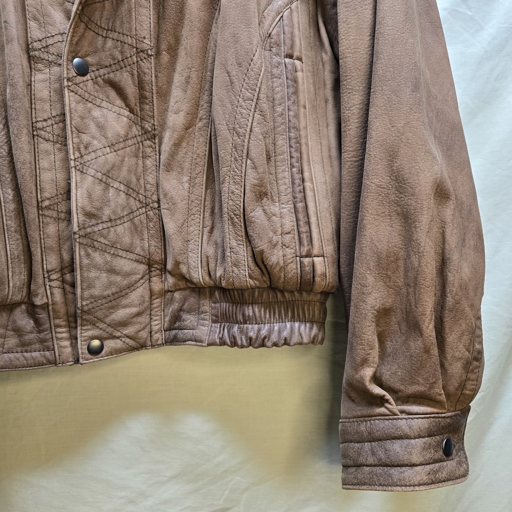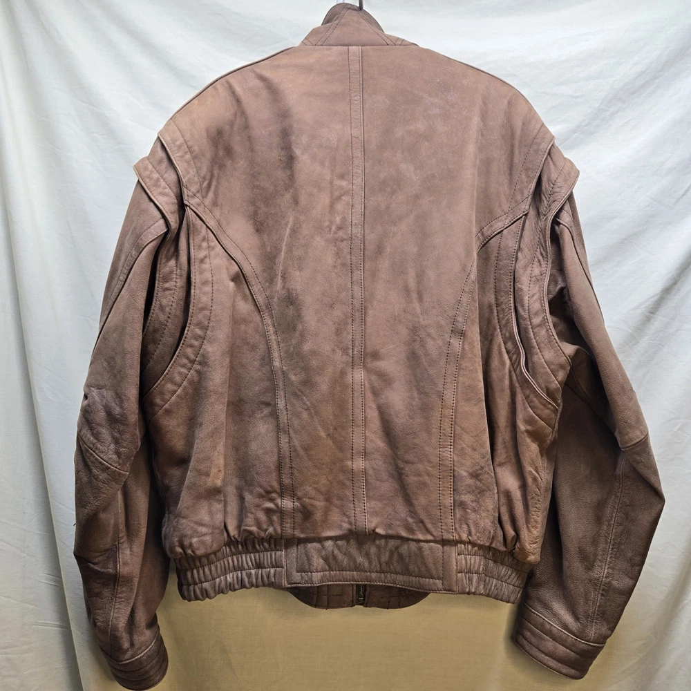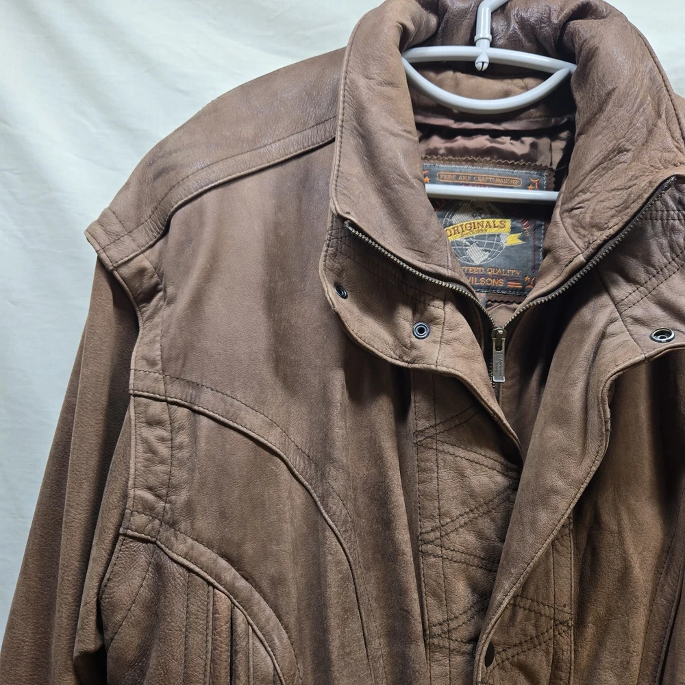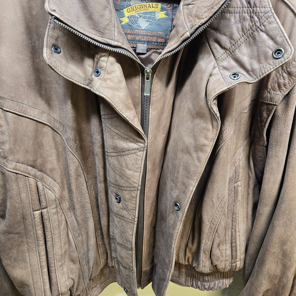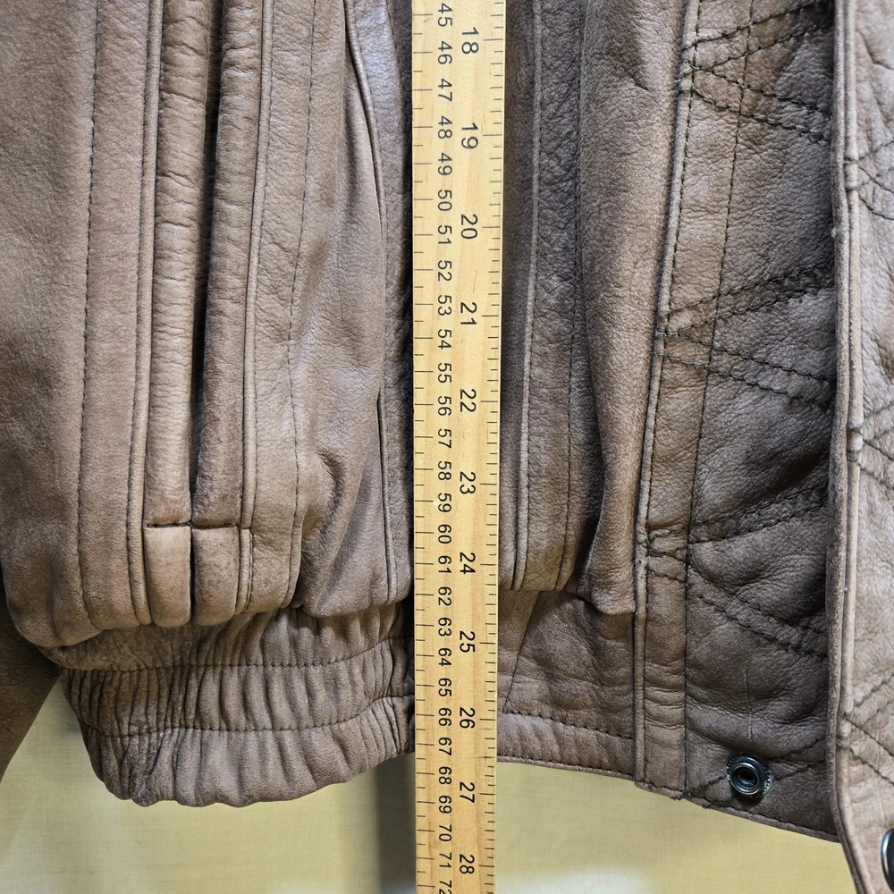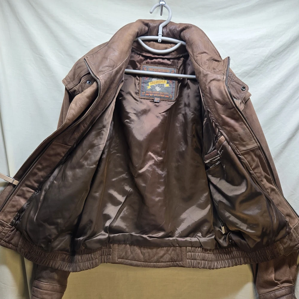 No inside liner other than that it's in great condition! No holes or damages! Very nice for riding your motorcycle or during this winter season. It's heavyweight will make you warm. Buy responsibly thank you! This Vintage Adventure Bound by Wilsons Heavy Brown Leather Bomber Jacket in Men's size LARGE is a classic piece perfect for casual, travel, or workwear occasions. Made from high-quality leather with a nylon lining, this jacket features a full zip closure and a spread or stand-up collar. The jacket's mid-length design, solid brown color, and 90s motorcycle theme make it a stylish and functional choice for the winter, fall, or spring seasons. Adventure Bound branding, along with button and zipper accents, add a touch of vintage flair to this timeless bomber jacket.