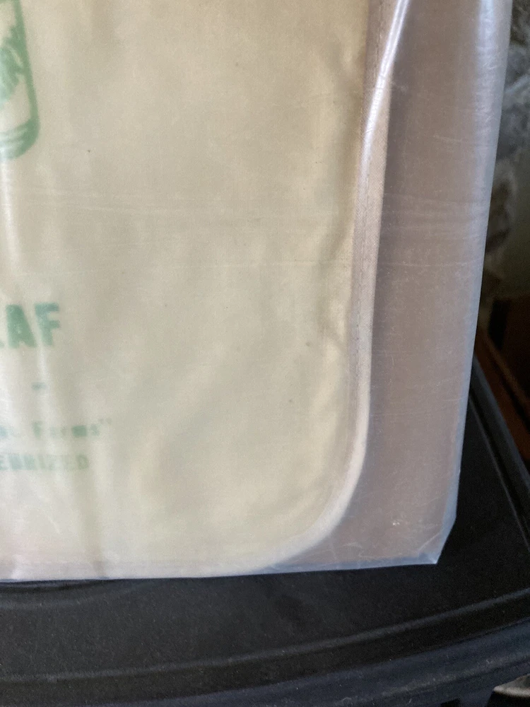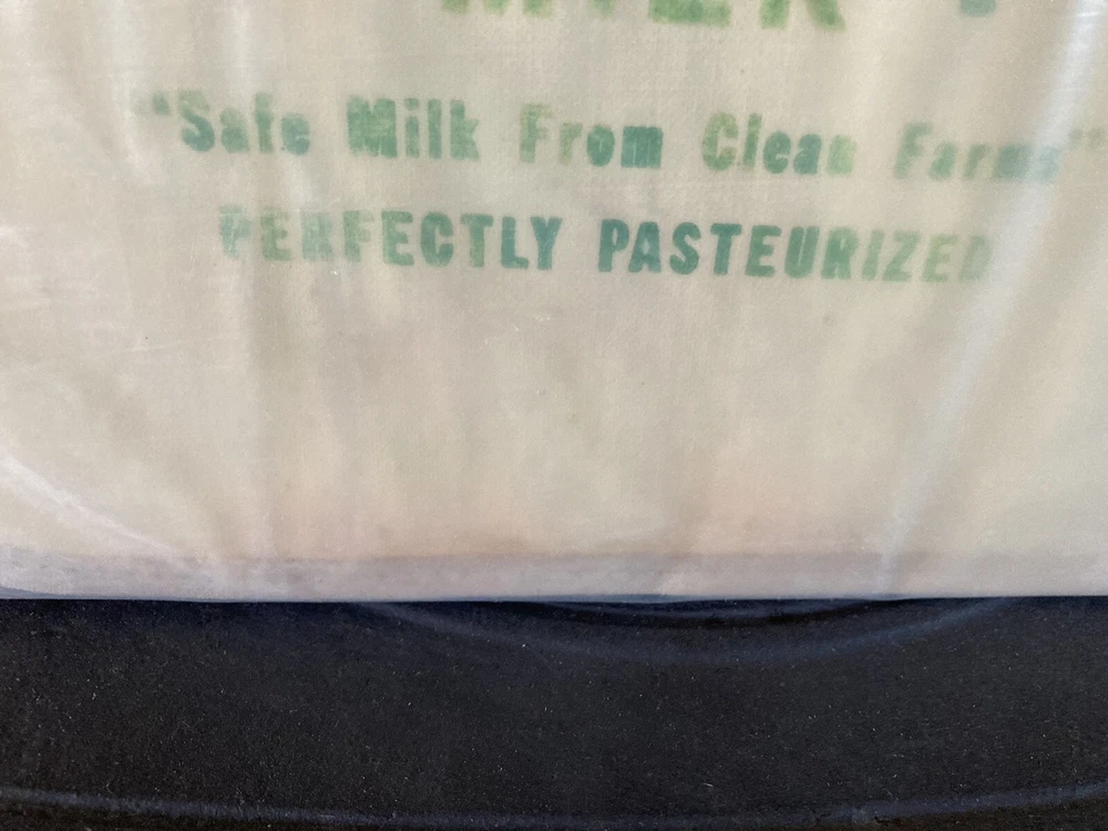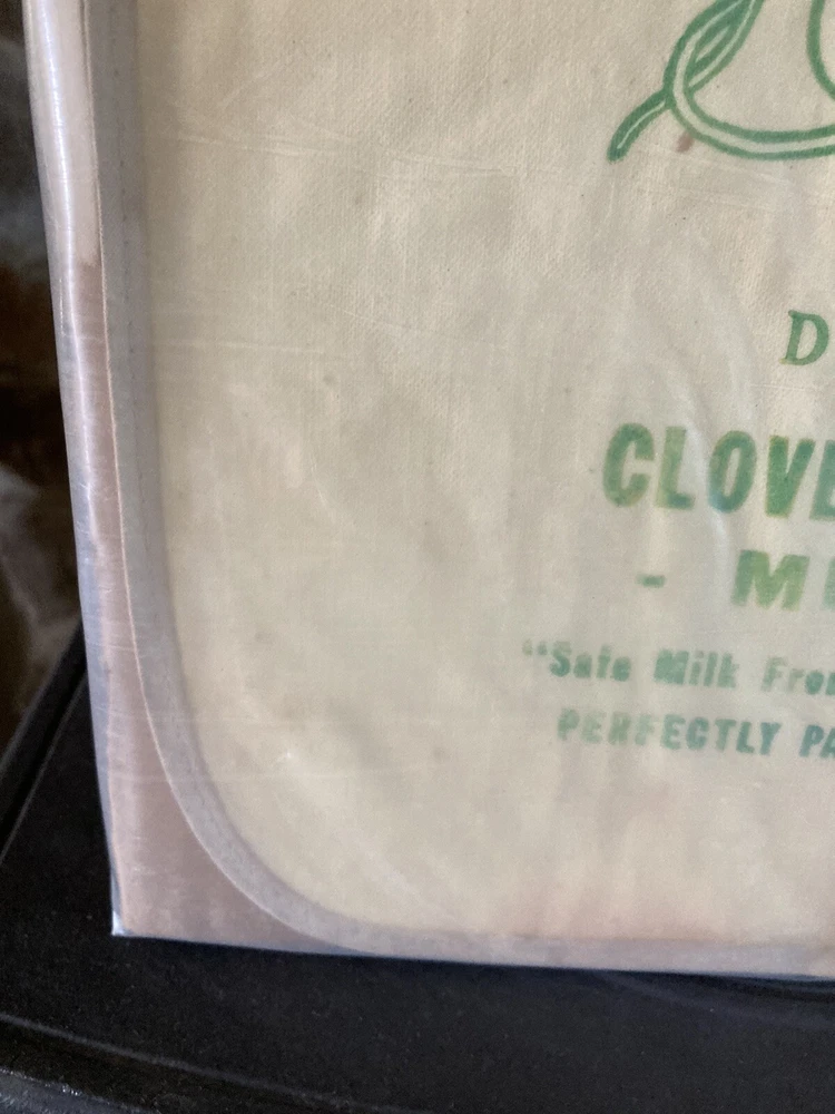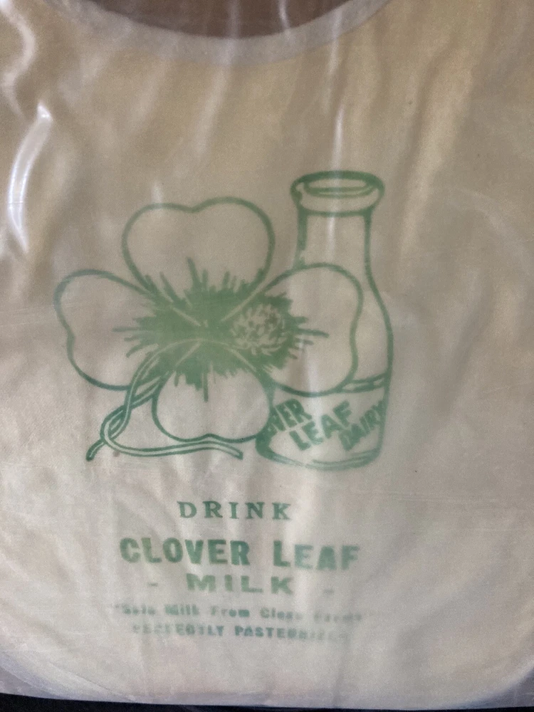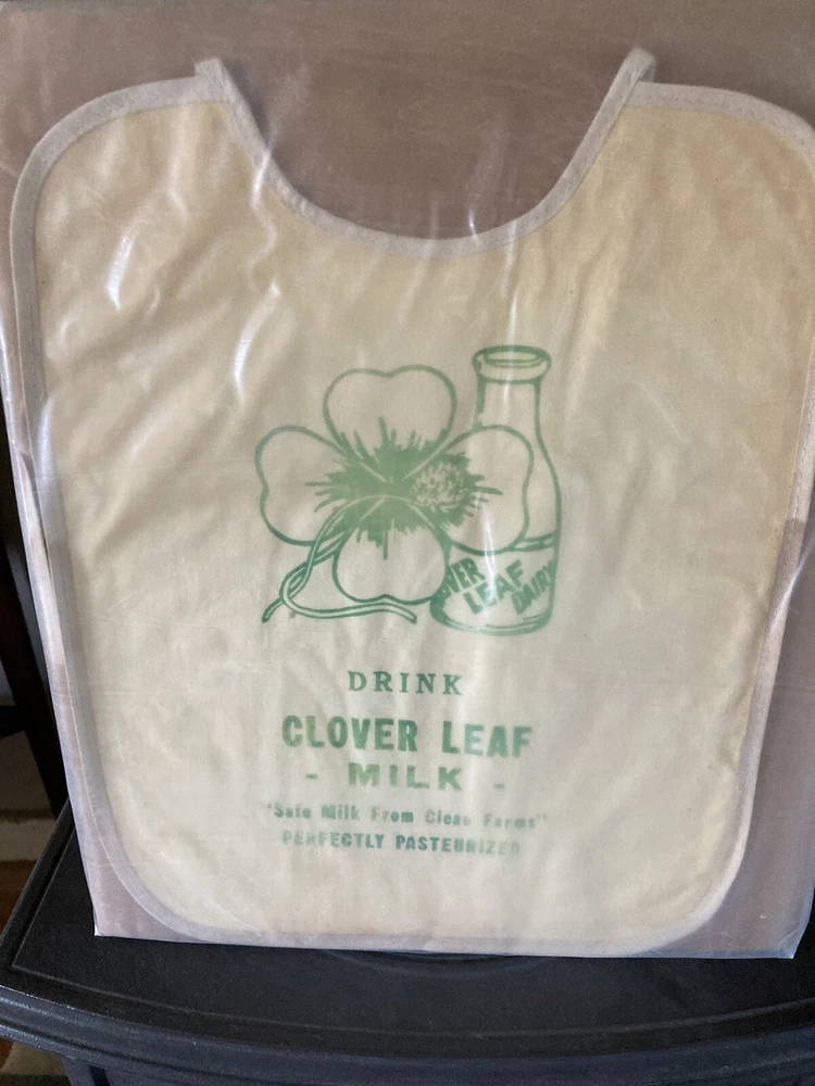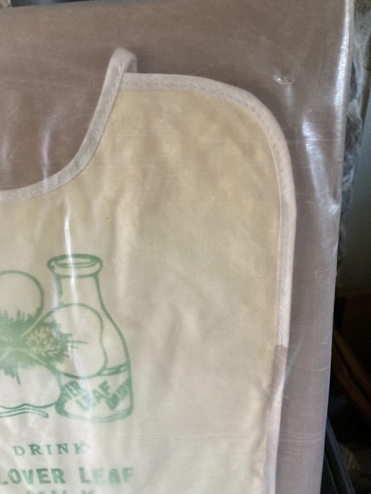 Vintage Advertising Baby Bib encased in plastic and cardboard from the Clover Leaf Dairy Newtown PA Bucks County. Has nice milk bottle on it with the logo Drink Clover Leaf Milk Safe Milk from Clean Farms Perfectly Pasteurized. Measures 12” long by 10” Wide. Has darkening bc around edges in middle margin areas and some discoloration at bottom mid section. Looks reddish or orange. I have not opened this so I do not know what the rear looks like. Local pick up available at the New Hope Antiques and Design Center 6148 Lower York Rd New Hope, PA 18938, open Friday Saturday Sunday and Monday 10-5pm