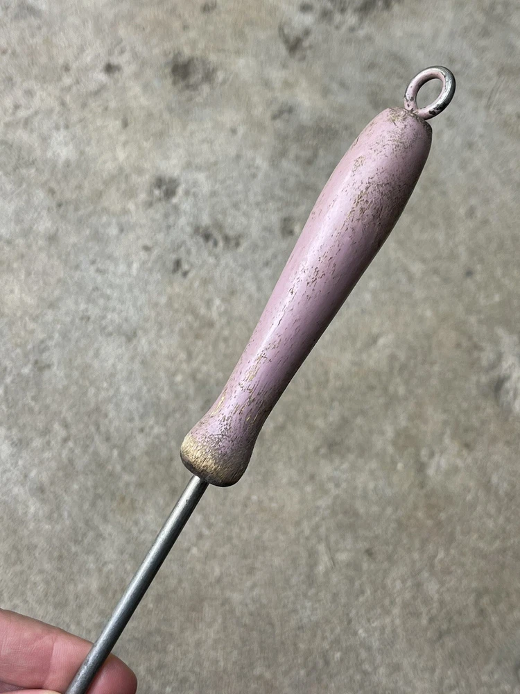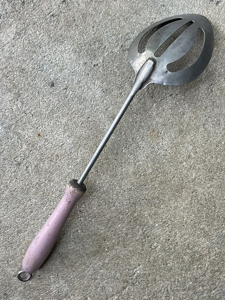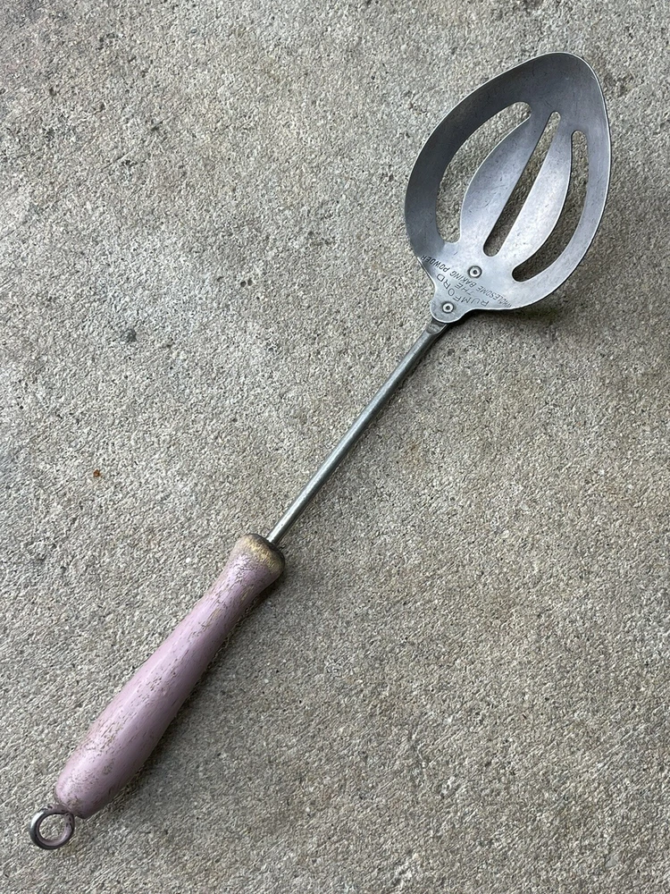 Vintage advertising promotional for RUMFORD baking powder - item used and in top shape / works 100 % as it should - no cracks or damage to wooden handle - spoon in steel with tin plating - nicer version of the usual all steel tools with a wire handle - Rumford liked giving away kitchen tools ( send in box tops or free in a larger bag of product - item measures 11 3/4 long - handle 4 inch - bowl marked RUMFORD THE WHOLESOME BAKING POWDER handle in a lavender color ( not sure if original or someone customized it ) it is old and would scrape off easily to repaint if wished solid and well made for a promo soda