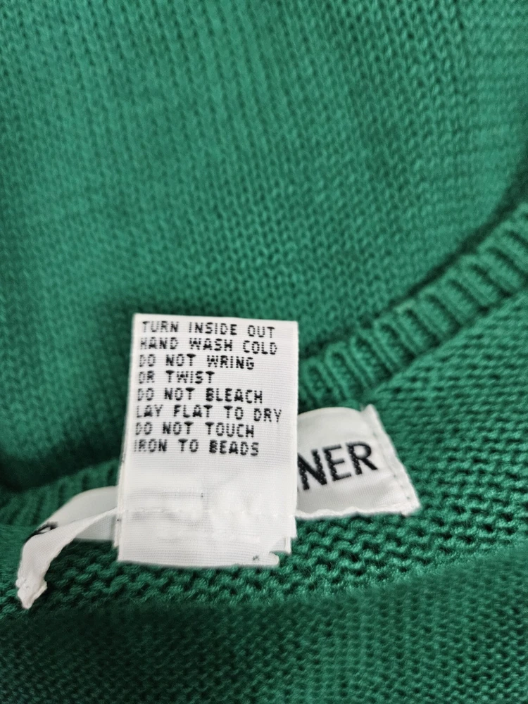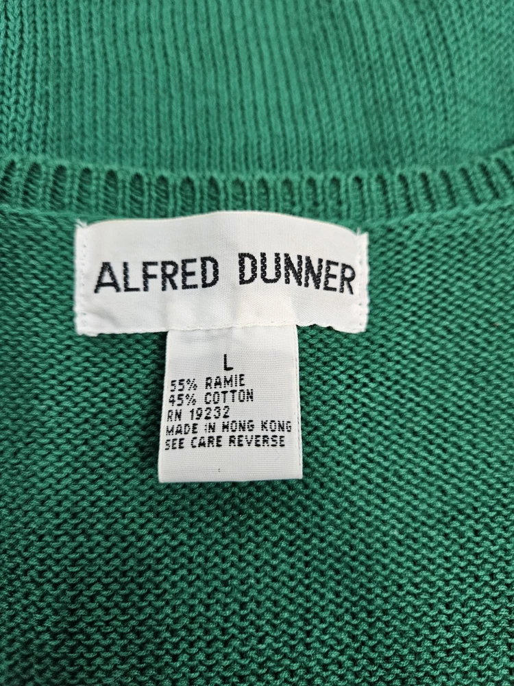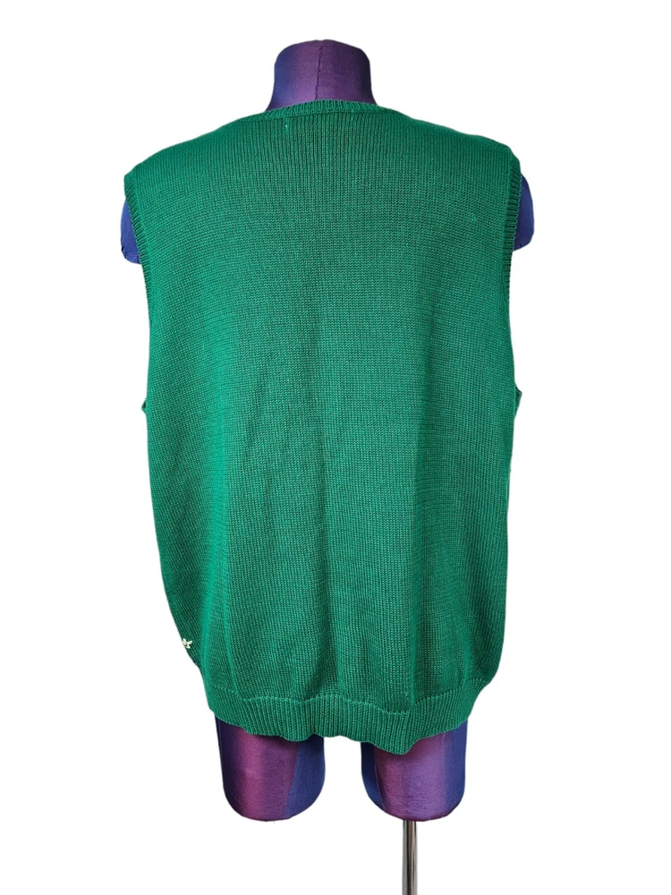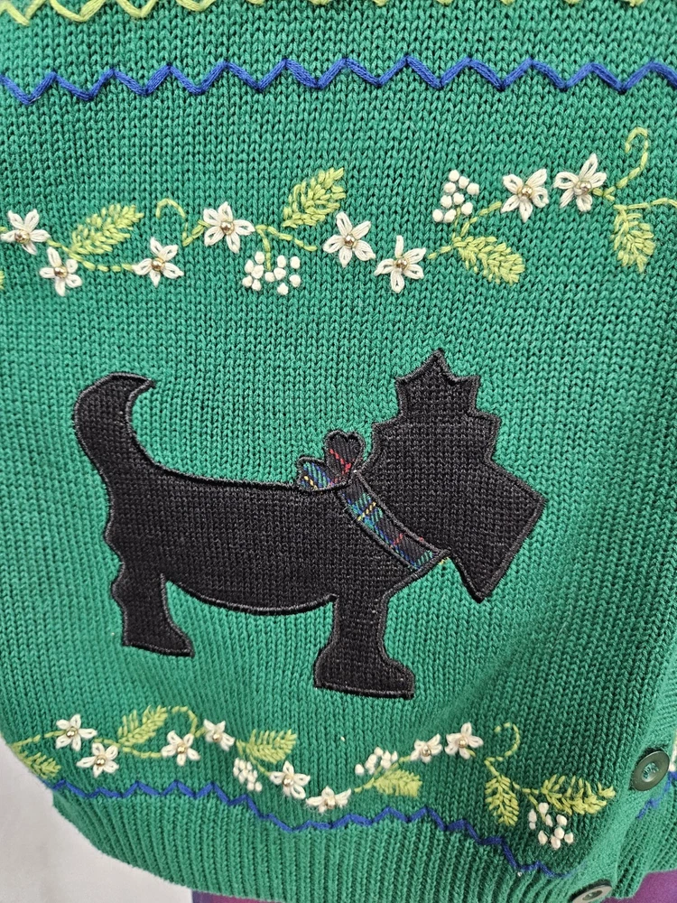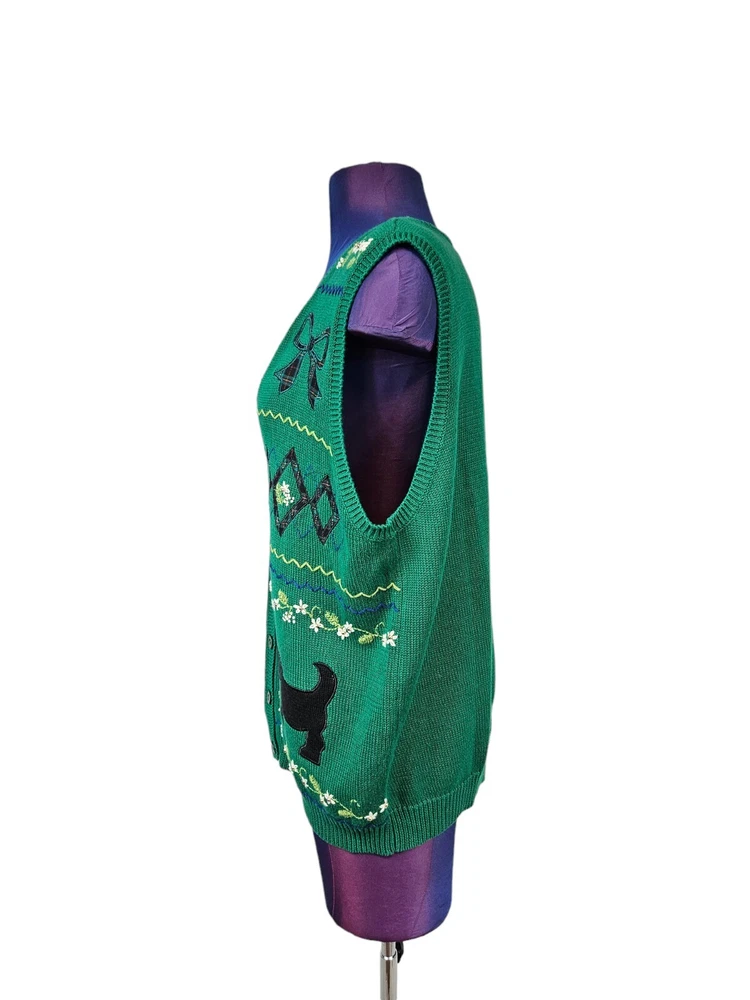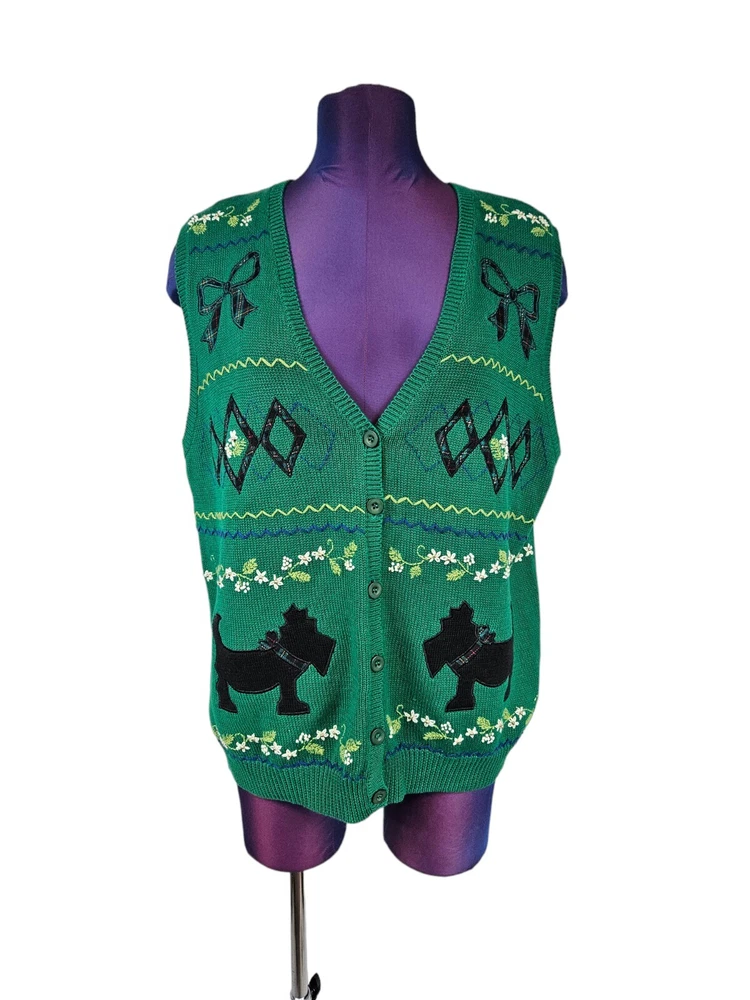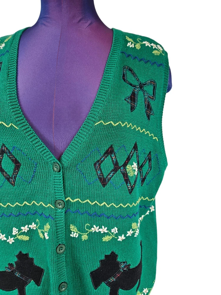 Vintage Alfred Dunner Green Scottie Dog Button Front Sweater Vest Size Large R8 In like new condition Vintage Alfred Dunner Green Scottie Dog Button Front Sweater Vest Size Large Women's. Features tight knit Christmas green patchwork fabric, ugly Christmas sweater vest, v-neck, 1/2 button vest, black lucite buttons, sleeveless, festive holiday vest, patchwork style with Scottie dogs with tartan plaid ribbons and diamond print, beaded embellished holly, unisex sweater. Made in Hong Kong Measurements laying flat chest 22" length 25" Fabric ramie, cotton This is a pre-owned item that may show signs of wear. In like new condition, no flaws.