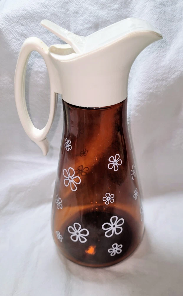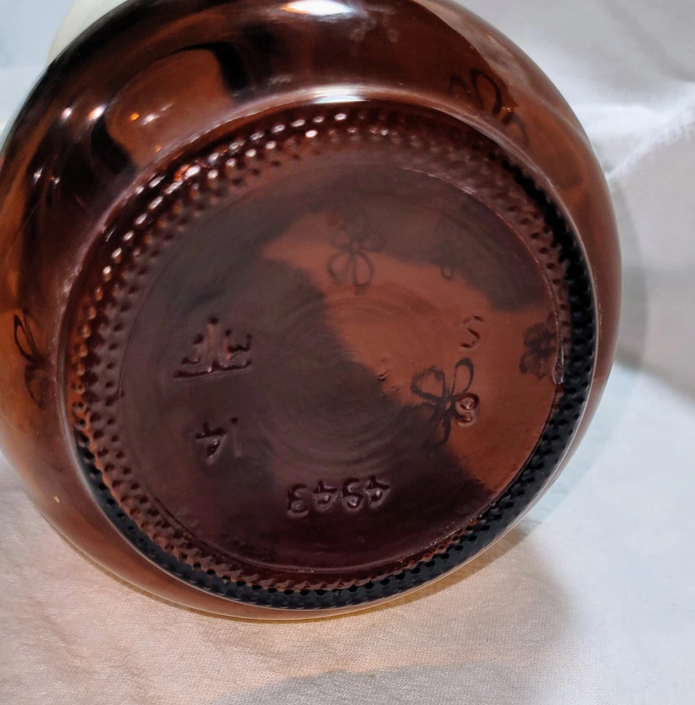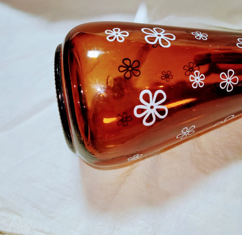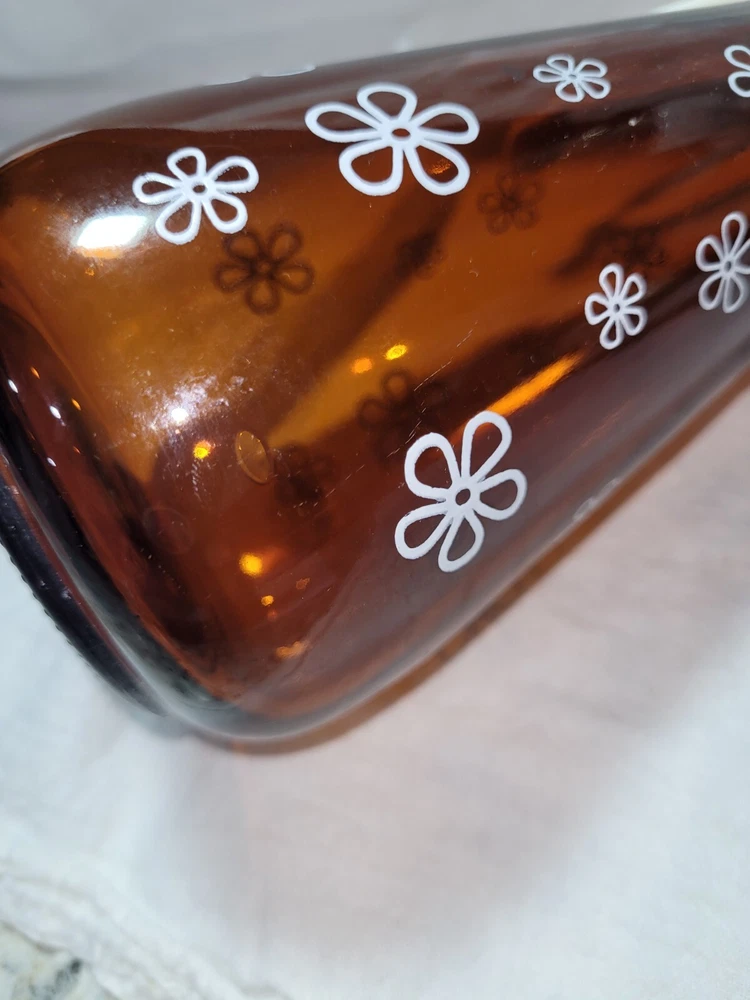 This is a nice vintage amber, brown syrup dispenser with Daisy print on it. It measures approximately 8" tall by 3 1/2" wide. On lid has a raised log cabin emblem. This also has an air bubble inside of glass, original to the piece. Please see photos for style and condition. The photos are part of the listing, and this is the item you will receive. I do combine shipping up to 7 days or 5 items, whichever comes first. Please request combined shipping if you are ordering/bidding on multiple items.