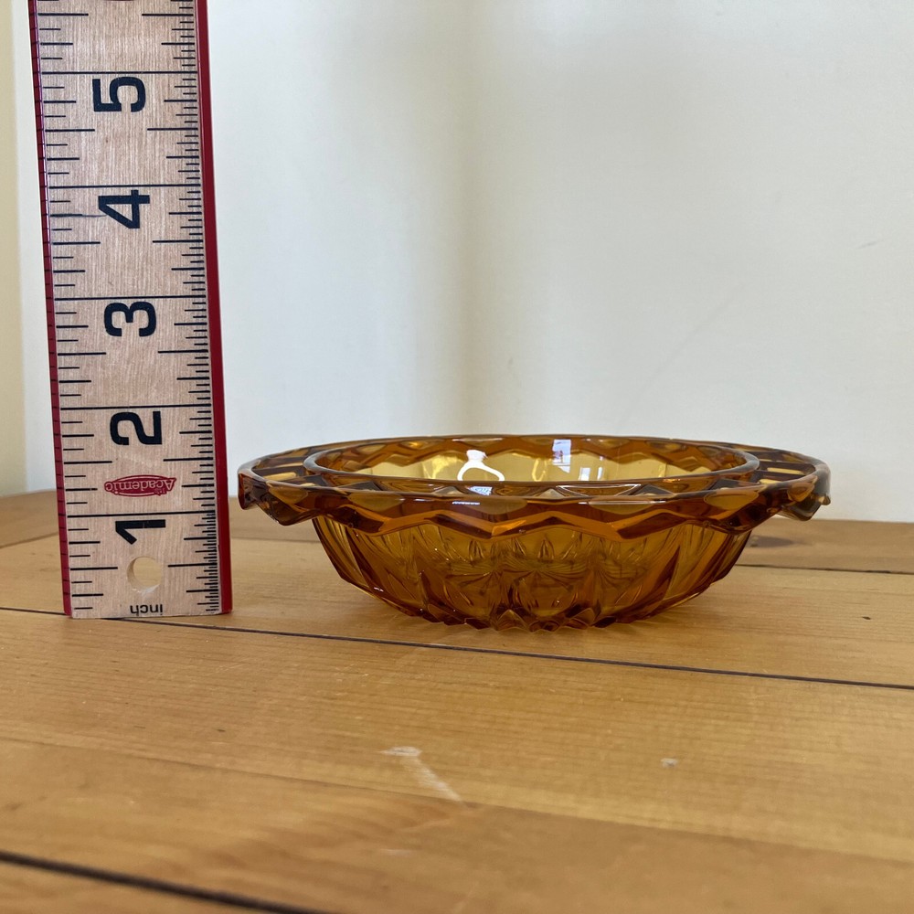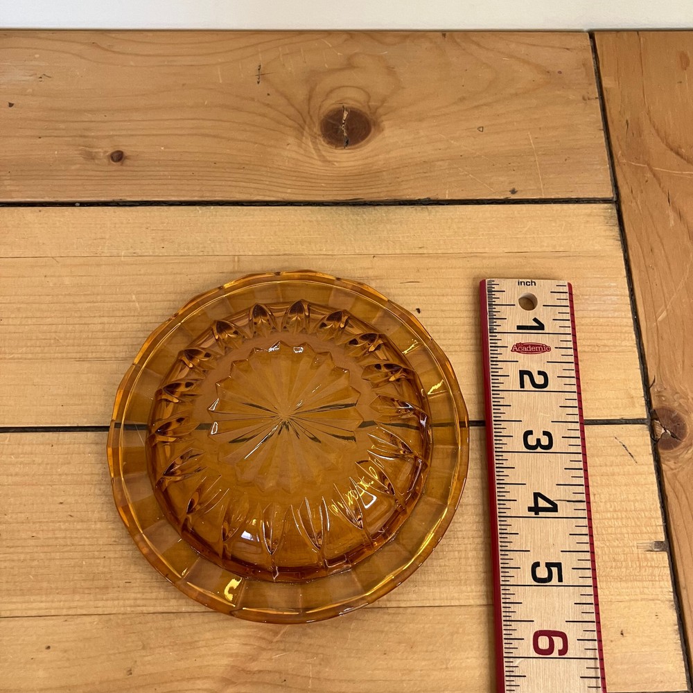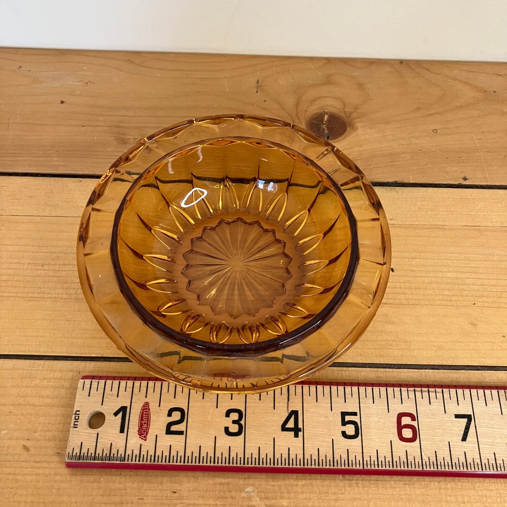 Amber glass small candy dish. 5 3/4" across rim x 1 3/8" tall. Good pre-owned condition. Glass has a few small surface marks from use. No chips or cracks. The pictures show the actual items that you will receive. Ships from Alberta, Canada. Tax applies to purchases.
