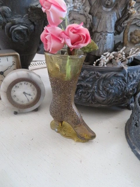 VERY PRETTY Vintage AMBER GLASS & Gold Tone Ladies BOOT Vase with PINK ROSES THIS IS A SMALL VINTAGE AMBER GLASS BOOT VASE AND VINTAGE MILLINERY ROSES. The vase glass boot and roses are not original to each other. The glass boot has some original gold paint with paint loss and wear. It is stamped B & H. The boot is about 5 1/2" by 3 1/2". Buyer to pay shipping and insurance of $9.00 to the lower 48.. BE SURE TO ADD SHABBYTOWNUSA TO YOUR FAVORITES AND CHECK BACK OFTEN. PLEASE SCROLL ALL THE WAY DOWN TO SEE ALL THE PHOTOS. See my other listings for more great items! Buyer to pay shipping and insurance. txzj pxzj1036 txzj-12
