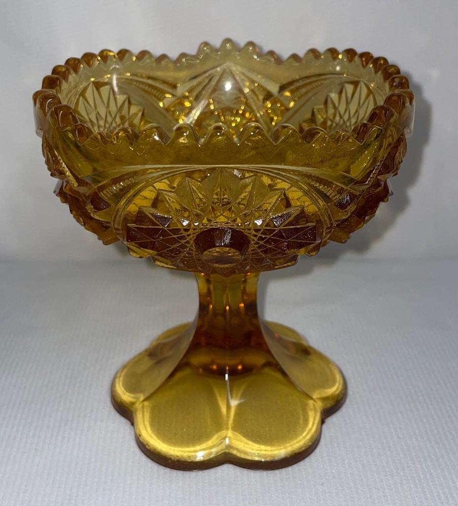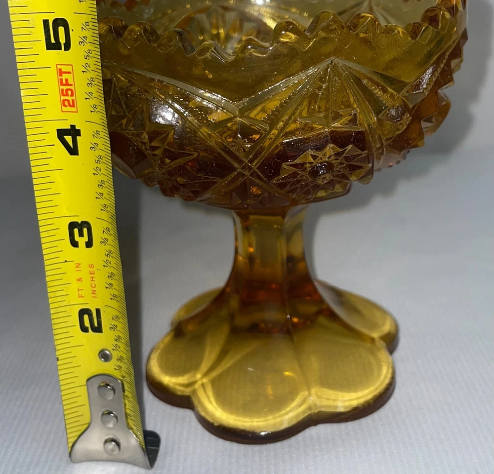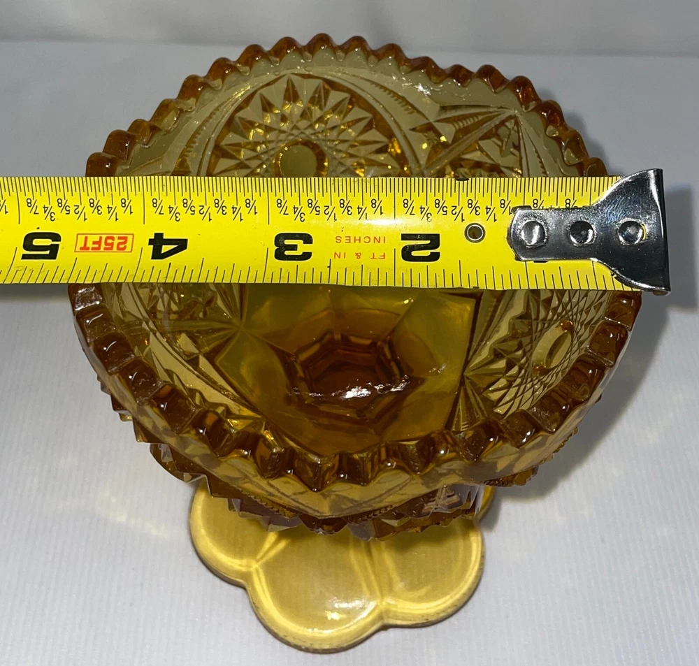 Vtg Wheaton Kimble Amber Glass Sawtooth Pedestal Candy Dish 5 Inches High Pre-owned, Very good condition, no chips or cracks. Has a sawtooth rim measures 5 inches across opening at top. Measures 5 inches high with a 4 inch base edge to edge. A beautiful button and sunburst pattern. ATTENTION REGARDING SHIPPING !! Shipping costs are expensive. Here is an offer that is hard to refuse. If you buy 2 or more items totaling $50 or more , I will handle the shipping cost (ground) anywhere in the continental United States. The items cannot be listed as having to be shipped alone due to SPECIAL PACKING NEEDS . eBay does not adjust the shipping cost removal from the invoice automatically. I can do it on the final invoice after you have the items in your shopping basket, before you pay. If eBay forces payment before that is done, you will receive a refund of shipping cost made before your package is shipped within the first business day following the transaction. The free shipping offer does not apply to Priority or Expedited shipping, although we can discuss a fair reduction in shipping cost should you desire the shipping upgrade. LOOKING FOR LESS EXPENSIVE SHIPPING? Click on "See details" next to Expedited Shipping Fee above to see other shipping options. eBay calculates the shipping fee based on package size, weight and type of shipping you select. SOME ITEMS CANNOT BE COMBINED WITH OTHER ITEMS DUE TO UNIQUE PACKAGING CHARACTERISTICS. THERE WILL BE A NOTE (here) IN THE LISTING WHEN COMBINED SHIPPING CANNOT BE USED. SAVE SHIPPING COSTS! – USE COMBINED SHIPPING Shipping costs are high. The best way to save money on shipping costs is through combined shipping,… purchasing more than 1 item and having them shipped together. The cost per item drops substantially. To do this you MUST NOT pay for items until after the combined shipping cost has been calculated on the invoice. If you pay before this has been done you will end up paying the individual shipping cost for each item, and I am unable to issue refunds for shipping overpayments when this occurs because eBay does not refund the fees they charge me on the refunded amount.
