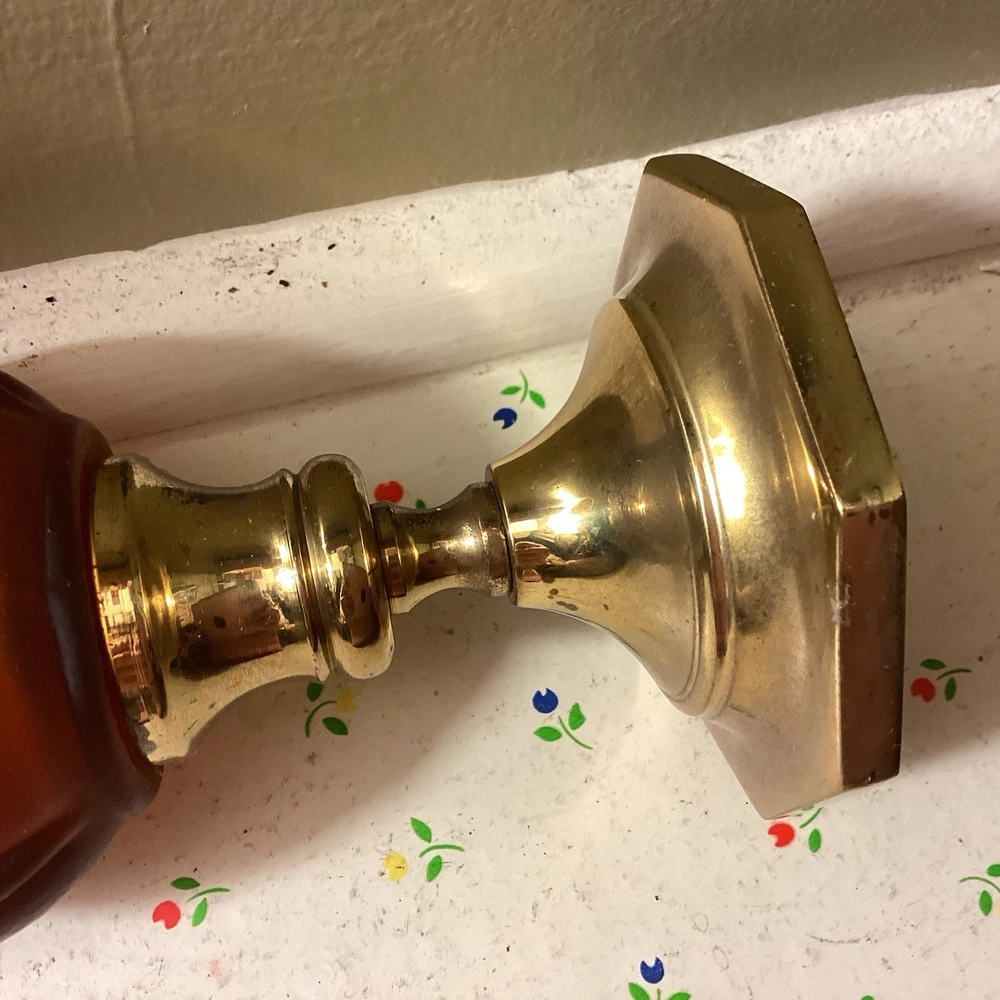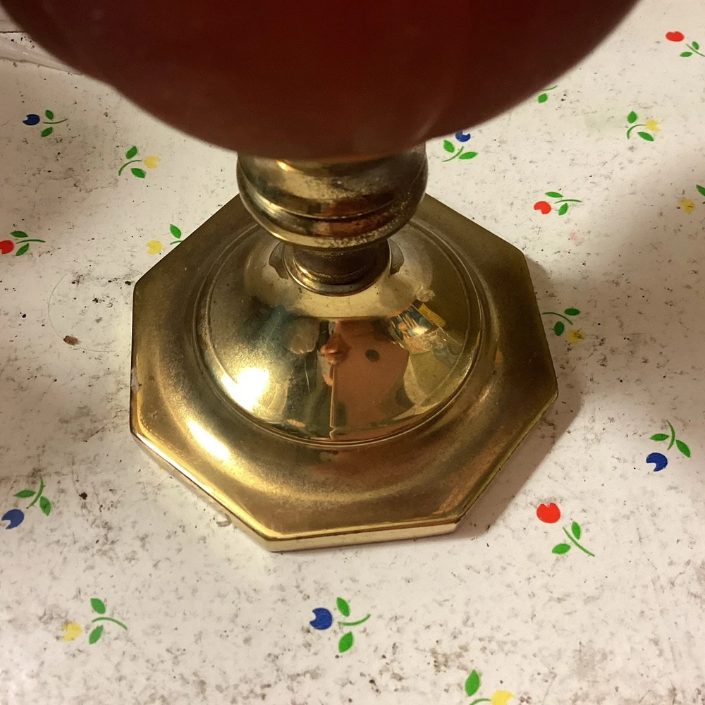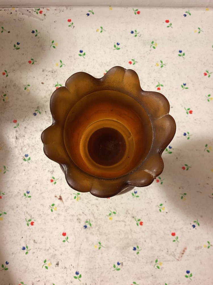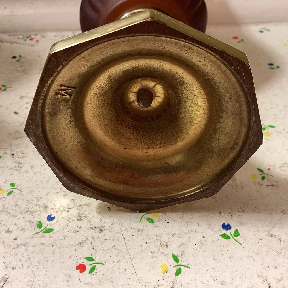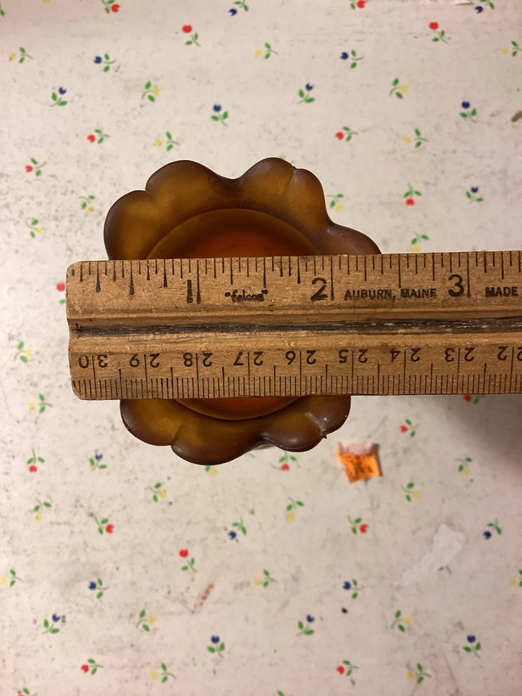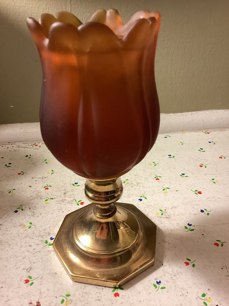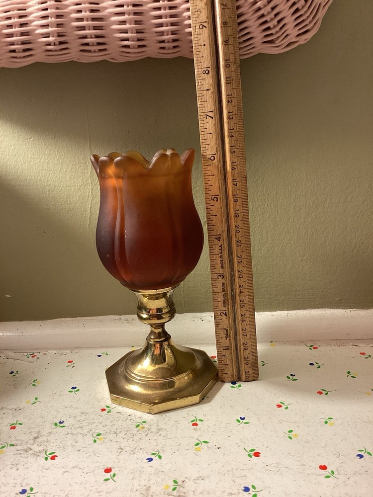 The product is a vintage dark amber and gold flared honeycomb diamond glass peg votive cup candle holder. This elegant candle holder is suitable for use with votive candles and tea light candles, making it perfect for any room in your home. Its Hollywood Regency style and original design add a touch of sophistication to any space. The item stands at a height of 5.75 inches and has a width of 3.5 inches. Care instructions recommend cleaning with warm water for easy maintenance.
