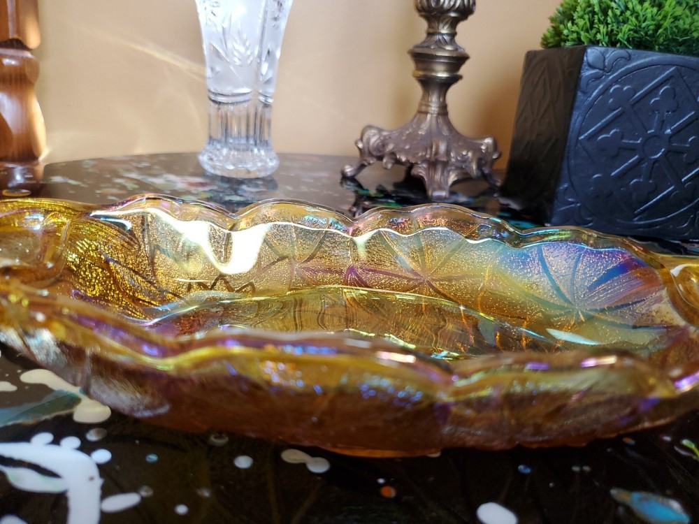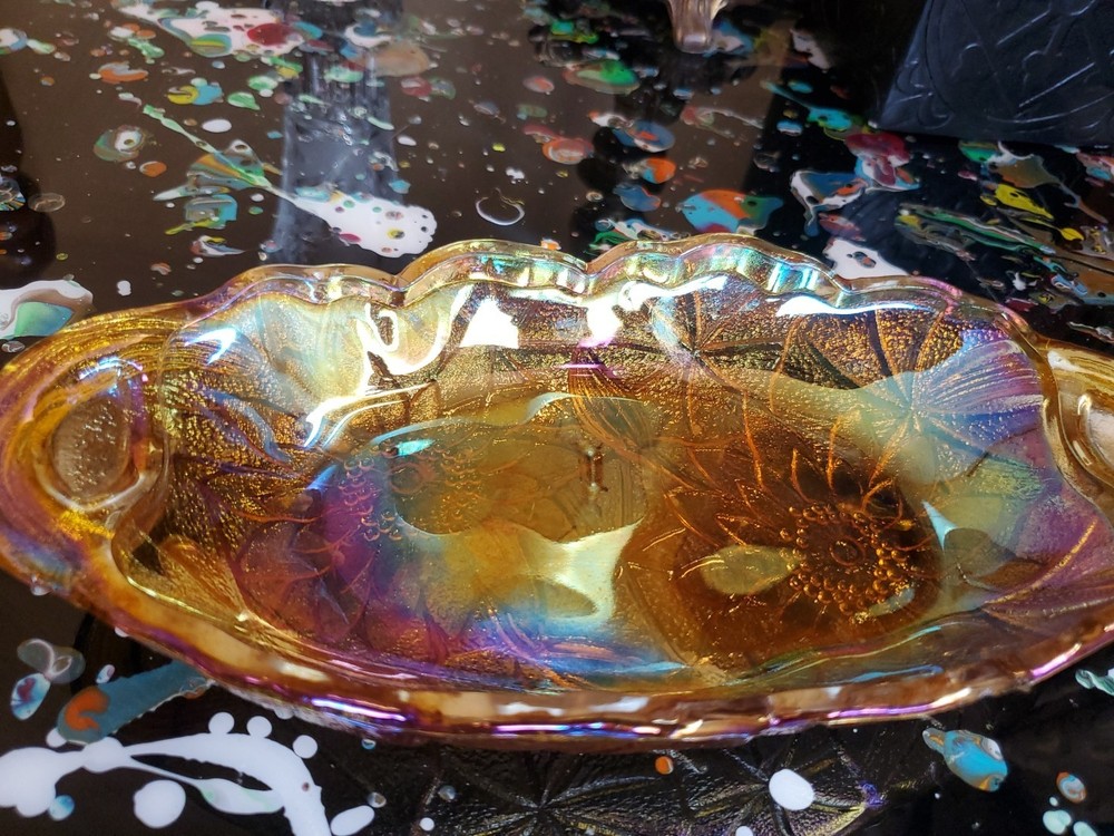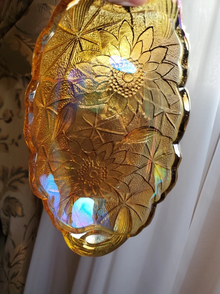 Vintage Indiana Carnival Glass Oval Sunflower Amber Candy Dish Perfect Condition. Condition is Used. Shipped with USPS Ground Advantage.