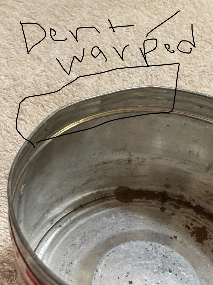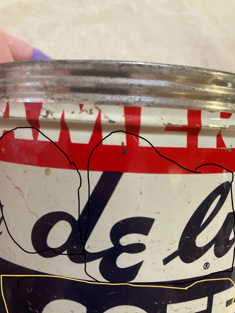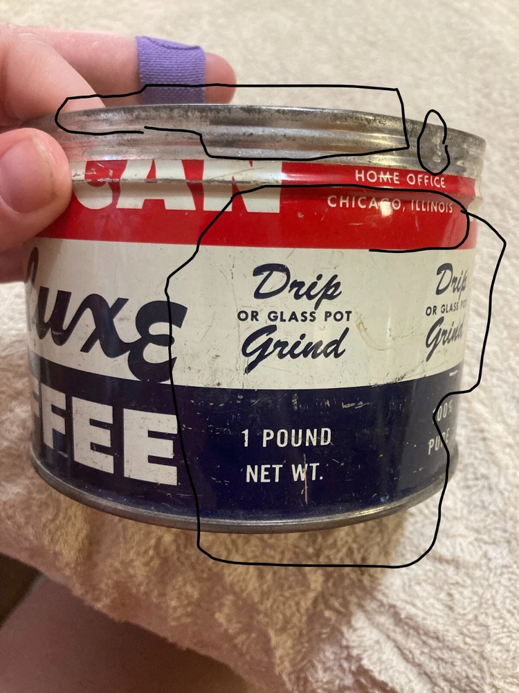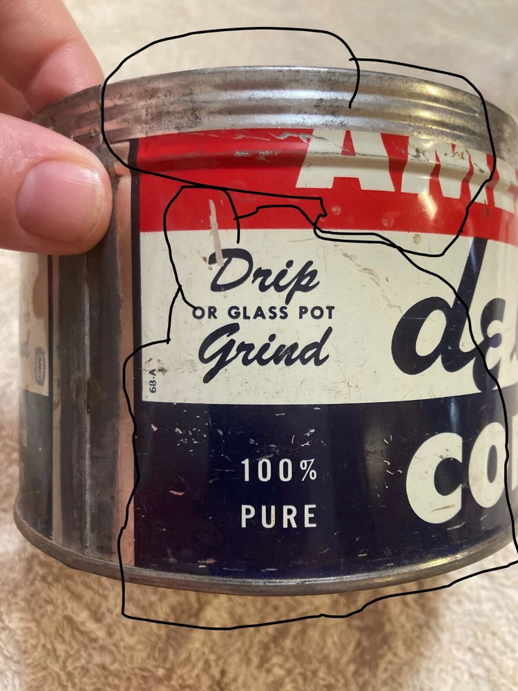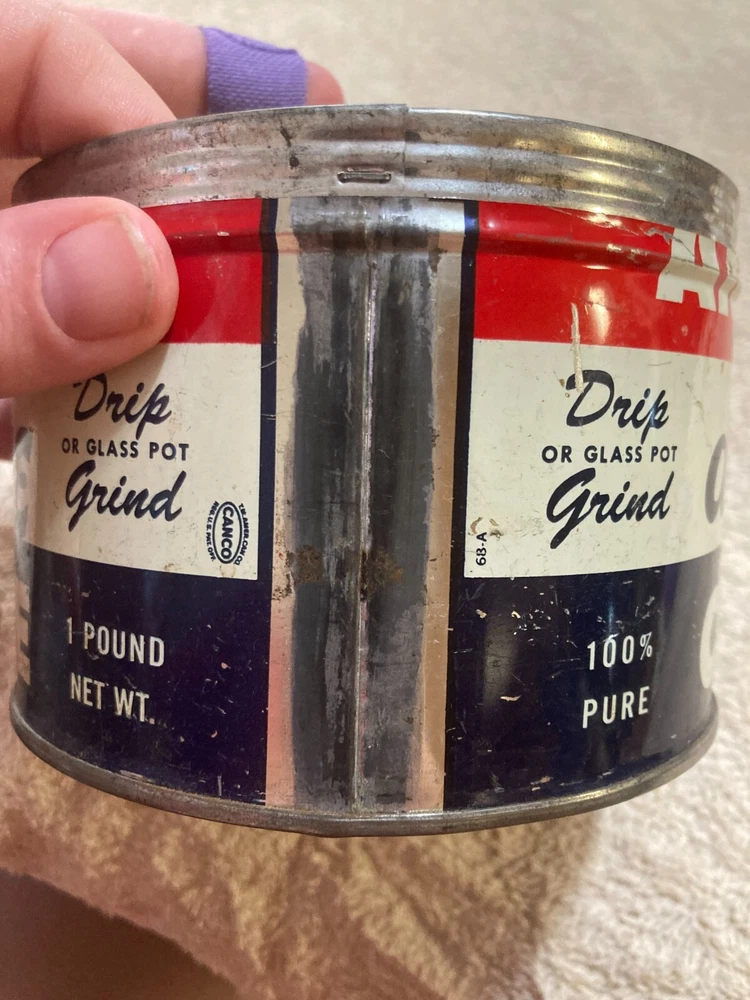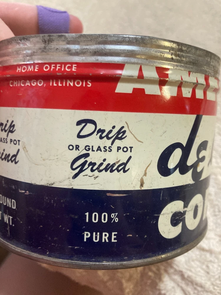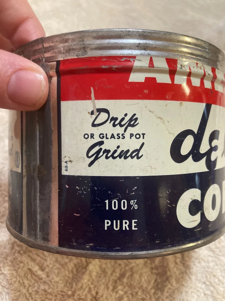 American Deluxe Coffee Metal Can with no Lid. The design on the coffee can with red, white, and blue stripes and lettering. The coffee can measures 3 1/2 inches and 5 inches in diameter. In fair condition with surface interior discoloration and surface scratches. There also is some rusting on the inside of the can. Some residue is found on the outside of the can and on the bottom surface of the coffee can. There is some wear to the metal and the coloring on the can. Please view all photos to judge the condition for yourself. All of these items are being sold as is -so please view all photos and ask any questions before buying this item. Please let me know if you have any questions or concerns. Items can always be combined for shipping. Any shipping charges that are above the cost of shipping beyond $1.00 will be returned. For example, if you are charged $12 and it costs $5, you will be returned $7. I had to include this because of some questions I have had lately. I am always open to reasonable offers .