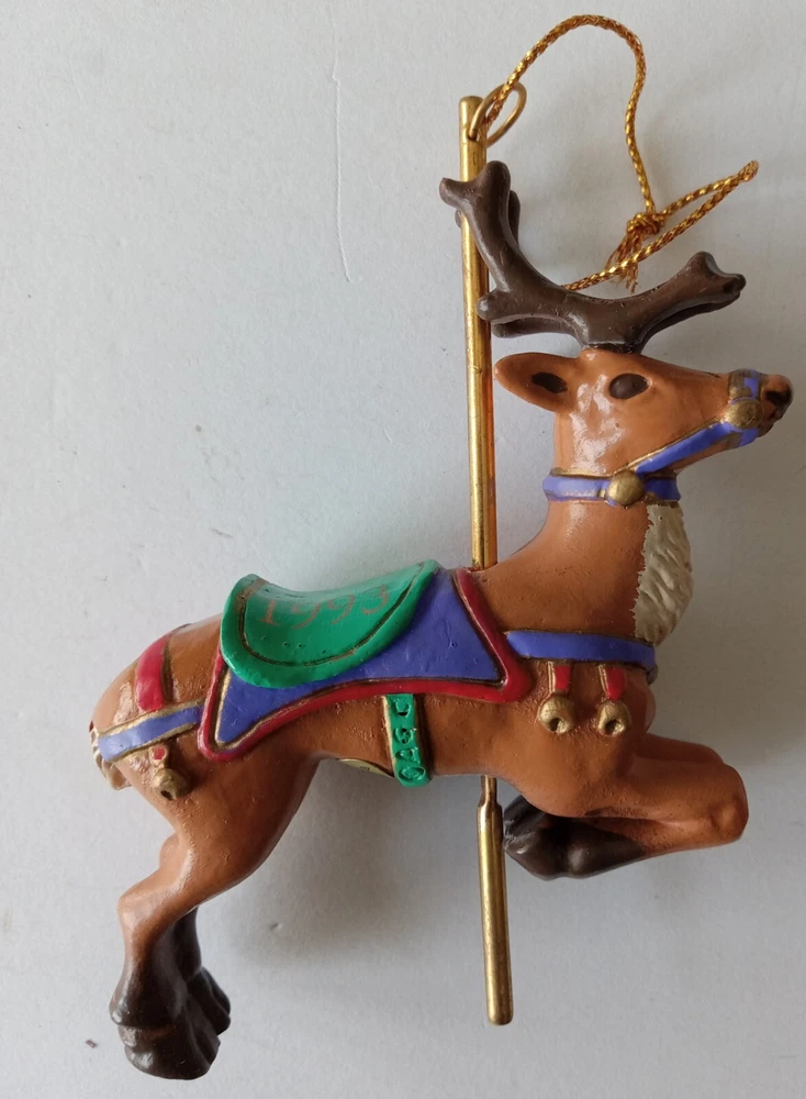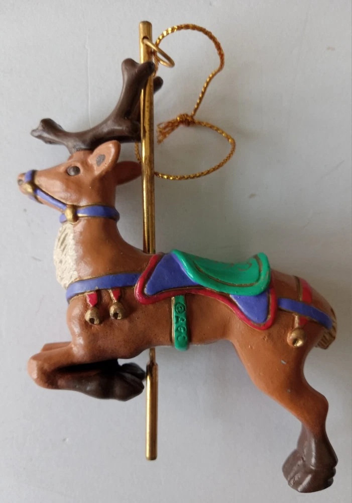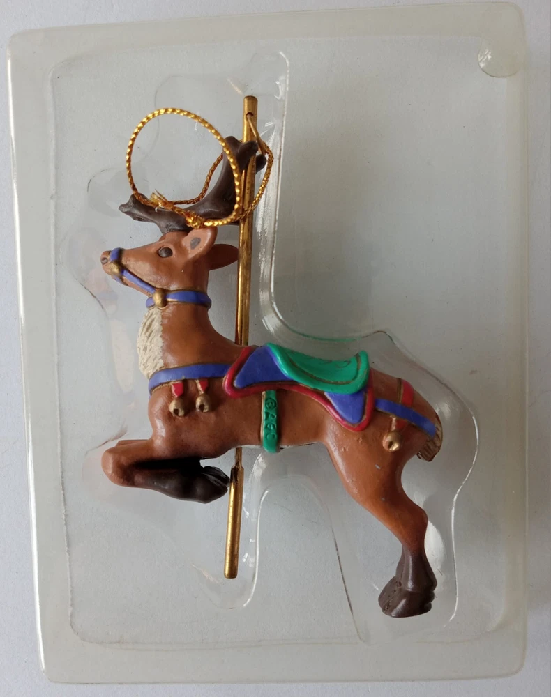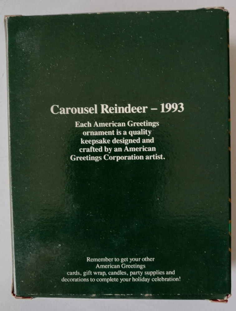 Vintage American Greeting 1993 Carousel Reindeer Christmas Ornament in Original Box with Original Plastic Bubble Packaging. The box does have a few VERY SLIGHT scuffs on some corners. The ornament is in very good condition with no marks, stains, scratches, broken or missing parts. Additional photos upon request. Item will be shipped in safe and secure packaging.