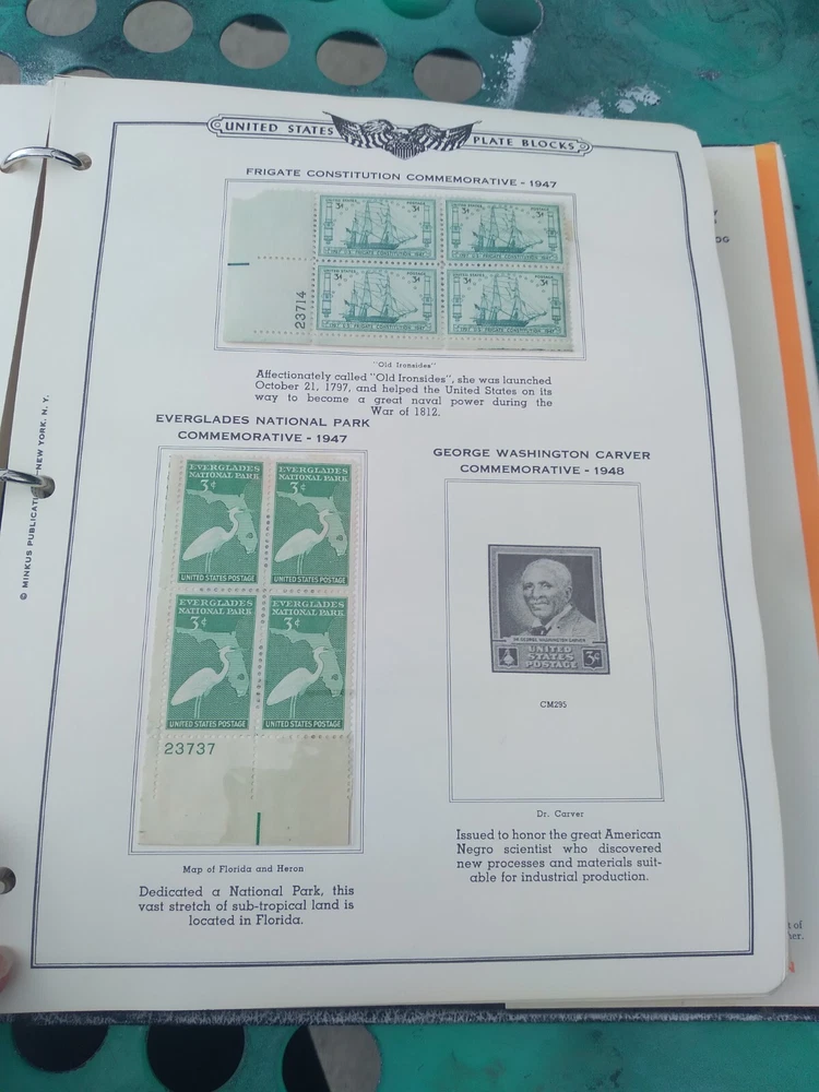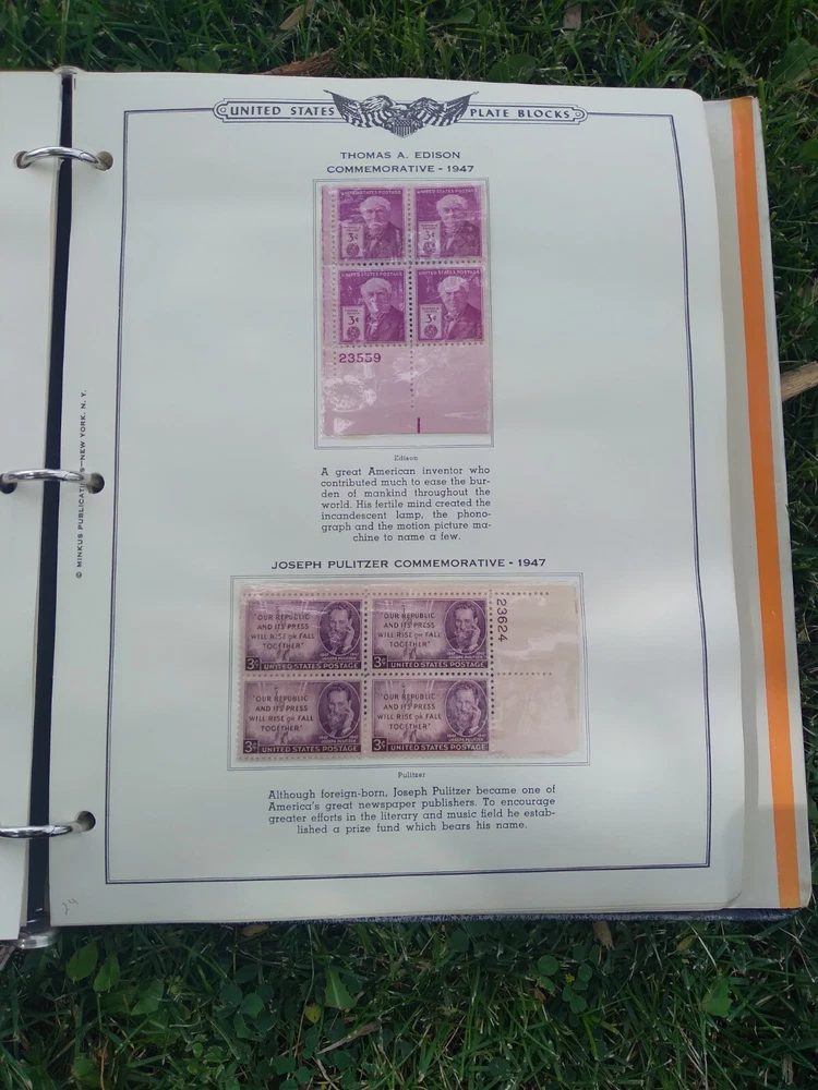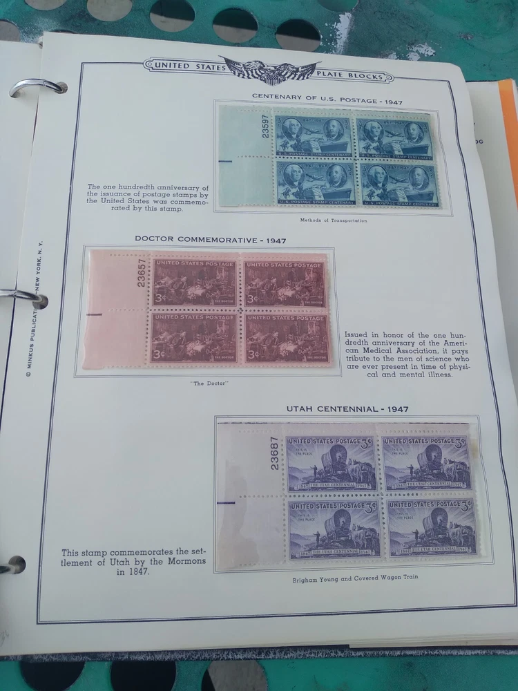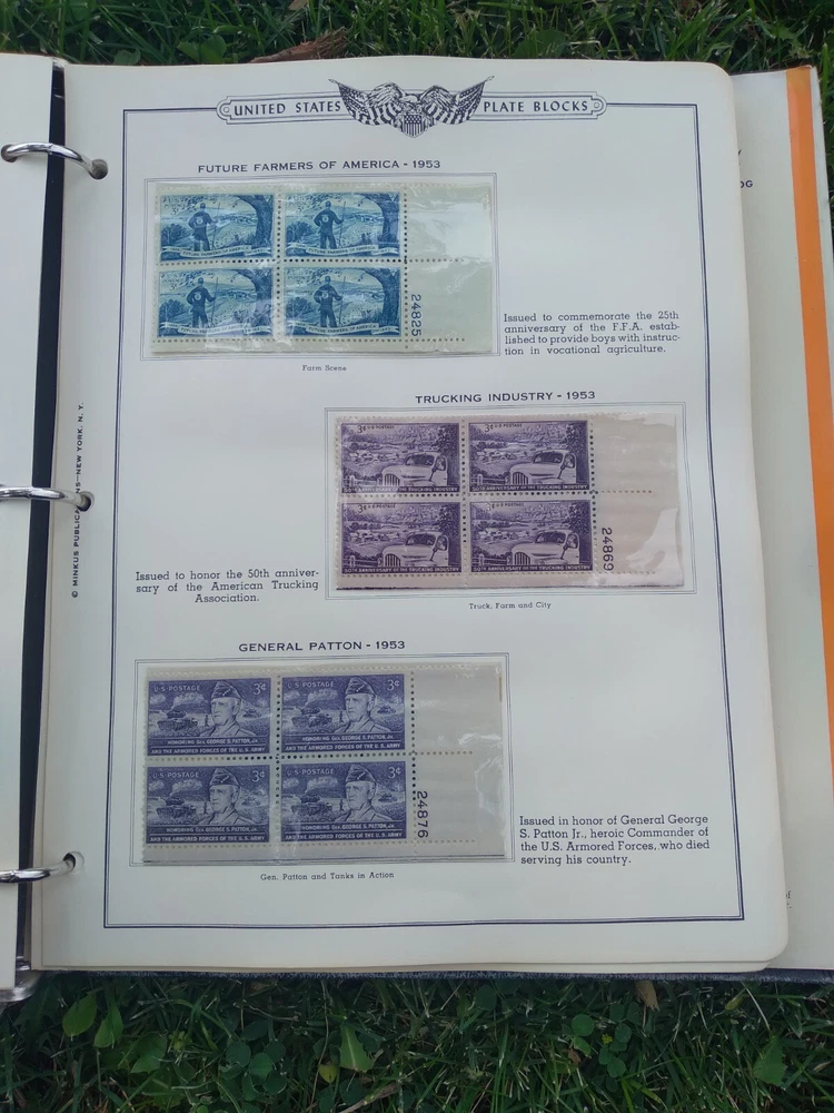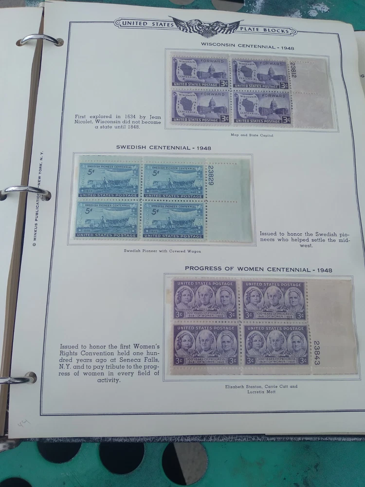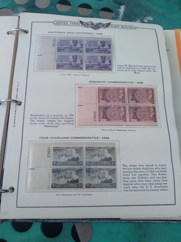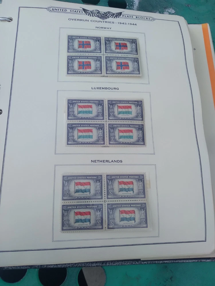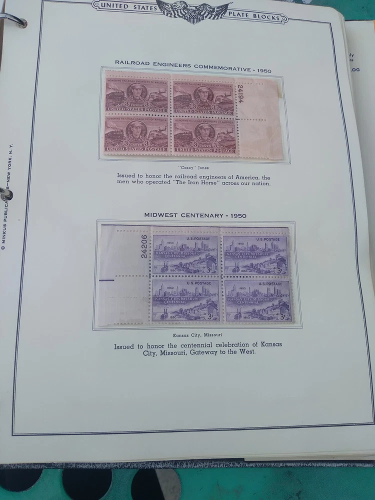 Stamp Collectors Book for American Stamps. Volume II Plate Blocks. All plate blocks come with 4 stamps each and the end corner. Compete Hinged collectible un-used stamps About 75% FULL with all un-used stamps. Going from 1 cent up to about 8 cents Most are from the 1940-1950s. All American Stamps. Comes with a complete set of taken over countries from World War II (2) including KOREA and all European Countries. Each page includes a detailed description about each collectible stamp plate block. All plate blocks are covered in clear plastic and in MINT or very fine condition. Un-used. I didn't count how many exact plate block stamp 4 stamps that are completed in the book. 75% is an estimate. All photos show the stamps that will be included in the book. It just doesn't show all stamps included in the book. Most pages come with 2-4 complete plate block 4 stamps per page. Gently used vintage condition. Book itself has some wear due to the age of the book. Has a tear on the back side of the book cover. All stamps are mint and in plastic covered plate blocks. All stamps have never been used. Stamp collector book is about 75% full of completed plate blocks. See photos for damage to cover. Photos show exact book and not all stamps included. Too many stamps to take pictures of all of them. Not willing to break-up or part out. Book is about 75% complete, with the most missing at the earlier years. SHIPPING & HANDLING: Handing is one day after payment has been received. Shipping will be Ground Advantage and takes about 5-7 days depending on your location. Tracking will be provided. Be sure to check out my vintage jewelry and vintage collectibles items as I would be more than willing to combine shipping. For all jewelry under 5 oz, the 2nd shipping cost will be refunded. If you buy more than 3 jewelry items, the 3rd piece of jewelry will be $1.00 extra shipping. For all other items for combined shipping, I will charge exact shipping costs and refund the difference after I have shipped your items. REFUNDS: If the item purchased is not as described when received I will provide a refund after I receive the item back. Items purchased that you would like to return for “not as described” will need to be returned within 14 days. If you think you are entitled to a “refund” and have received the item at a discount and not market (re-sale) value, I will DEMAND you send the item back for a full refund. This will ensure that I can resell the item at full market value vs what you paid. If you mistakenly purchased an item and I have already printed the shipping label, I will only refund the purchase price. You can cancel your item purchased (within the first 24 hours) for a full refund as long as I have not shipped the item. If I have shipped and printed the label, I will not refund your shipping costs. QUESTIONS: Please message me and I will respond within 24 hours.