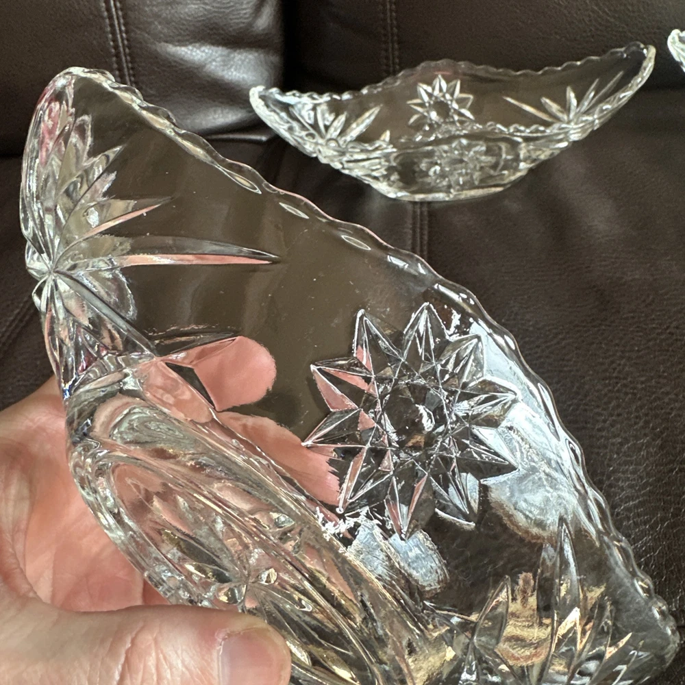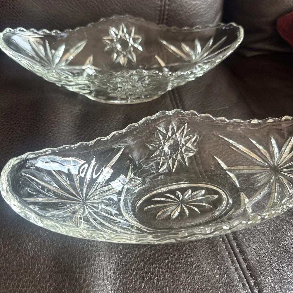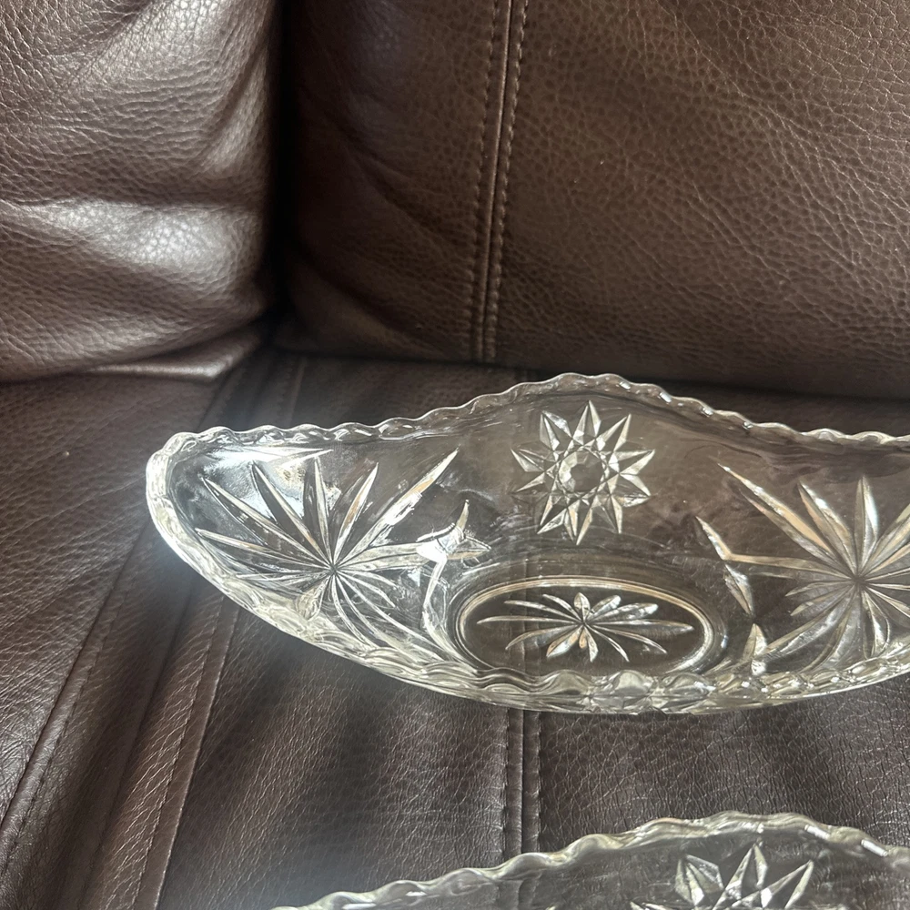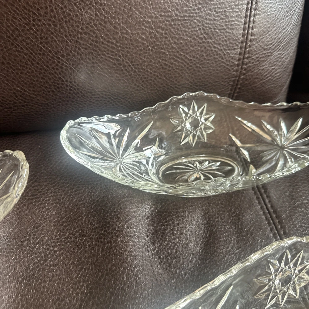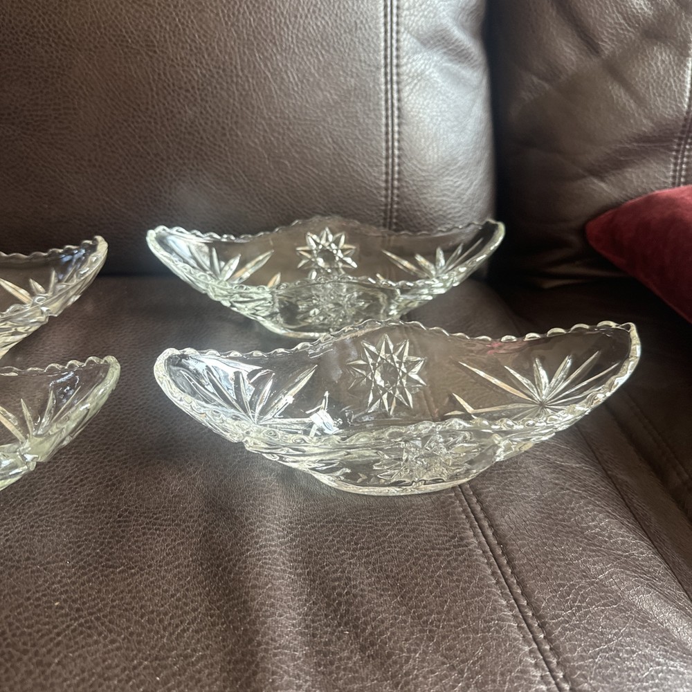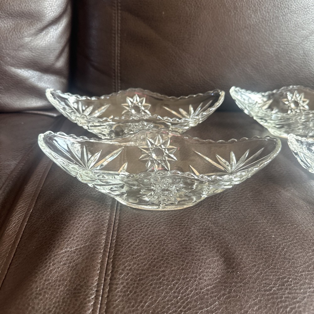 This product is a set of four vintage Anchor Hocking glass banana boats, each measuring 9.5" x 4.25". The glasses are clear and made of glass, and they belong to the Early American Prescut/EAPC product line. They are also vintage items. The brand of the glasses is Anchor Hocking, and the number of items in the set is four. Beautiful used condition!