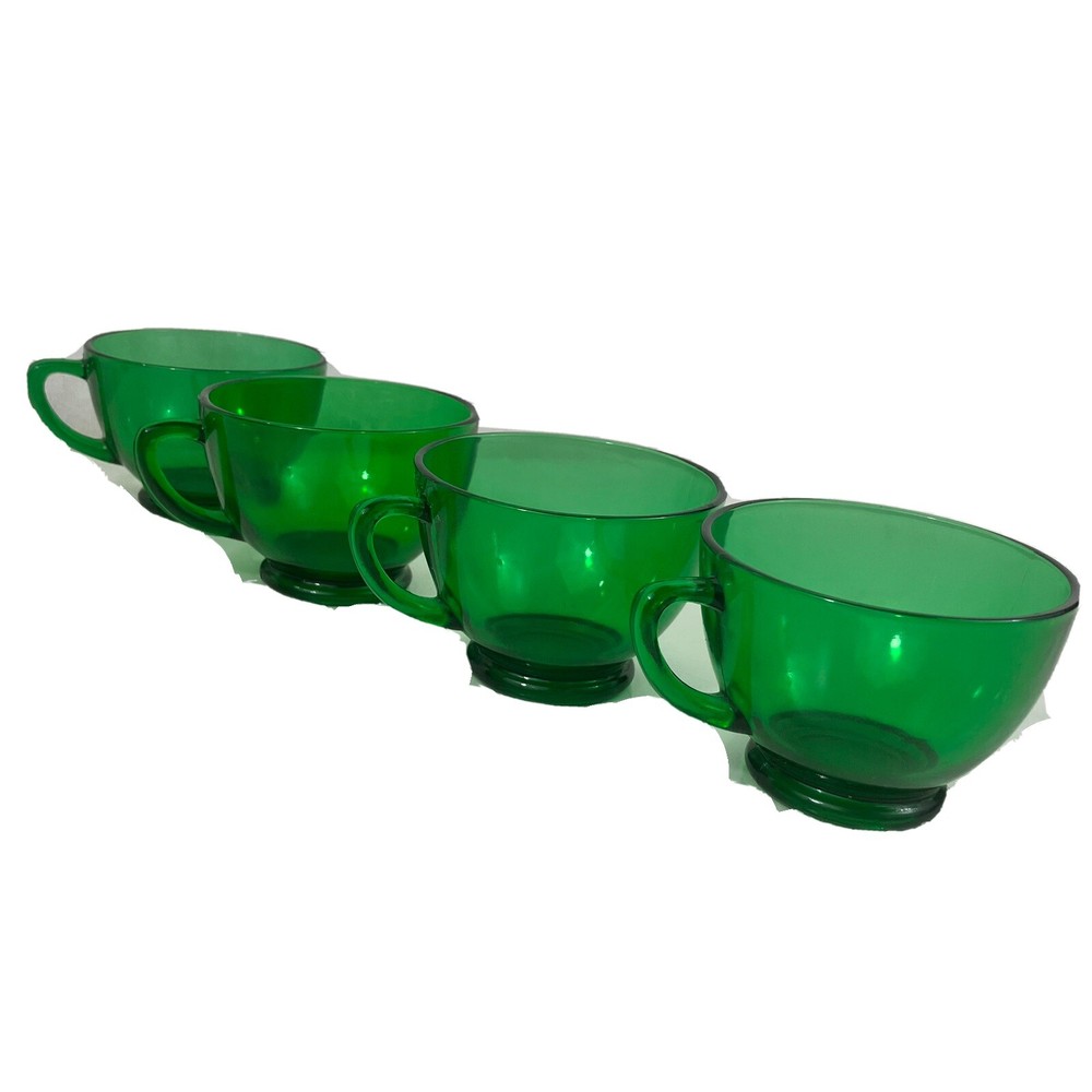 Add a touch of vintage charm to your collection with this set of four Anchor Hocking glasses. The cups are crafted in a beautiful emerald green hue that will surely brighten up any table setting. These glasses are perfect for serving your favorite beverages and are sure to impress your guests. The glasses are made of high-quality material, ensuring their durability and longevity. The set includes four glasses, making it ideal for larger gatherings or everyday use. The glasses are easy to clean and maintain, making them a practical addition to any home bar or kitchen.