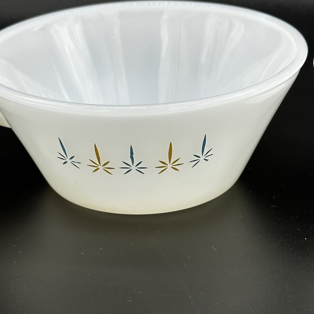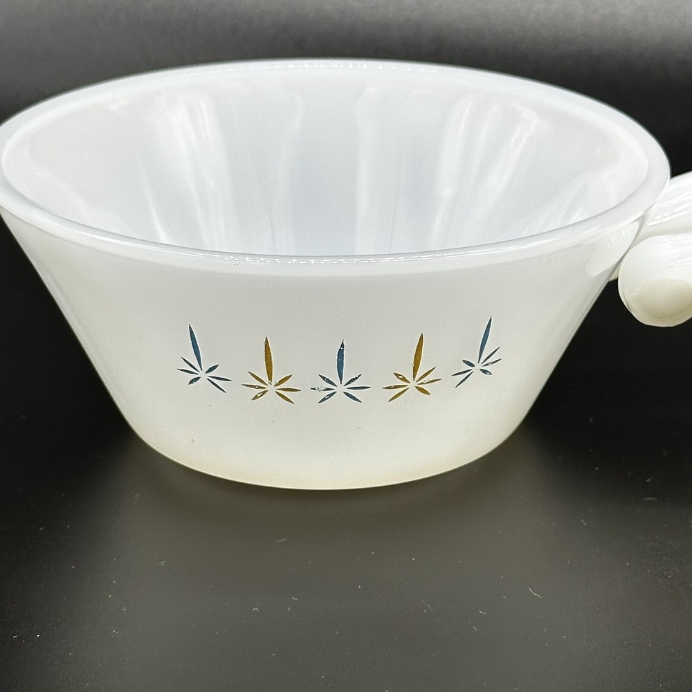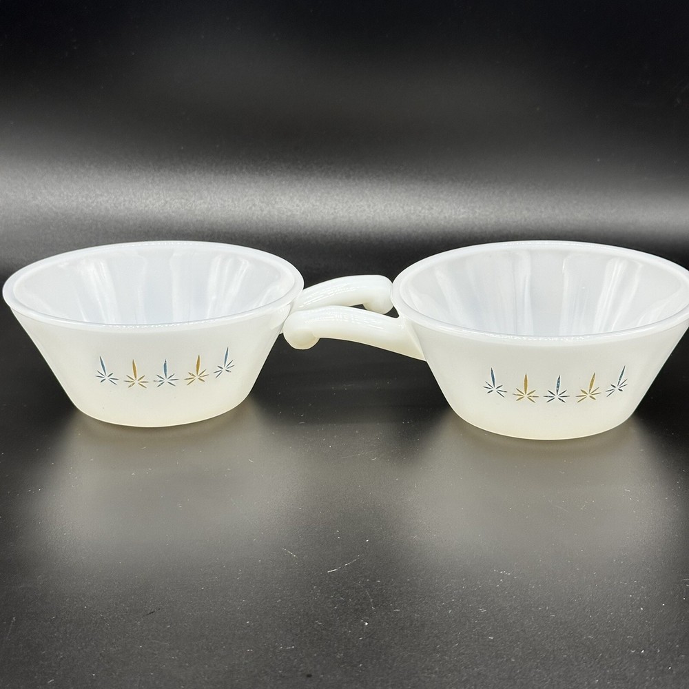 2 VTG Anchor Hocking Fire-King Ware Candle Glow Atomic Soup Bowls Handle Kitschy Great vintage condition with some mild fade Set of 2