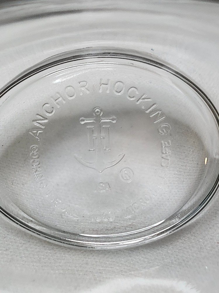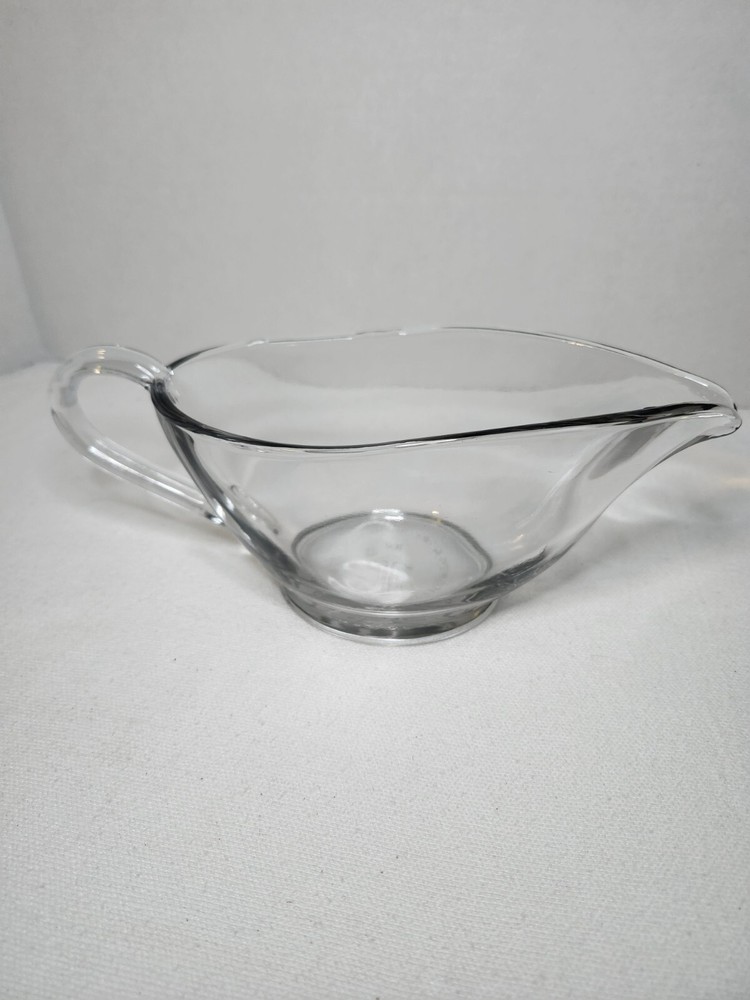 This vintage Anchor Hocking gravy boat is a clear glass oval-shaped piece from 1965, featuring a solid pattern and a glossy finish. Made in the United States, this mid-century modern style gravy boat can keep dishes hot for up to 4 hours and weighs 2 lbs. It is unboxed and bears an impressed backstamp, making it a unique and decorative addition to any kitchen collection.