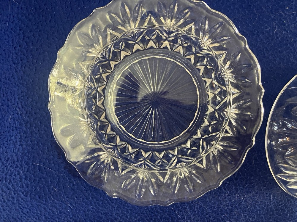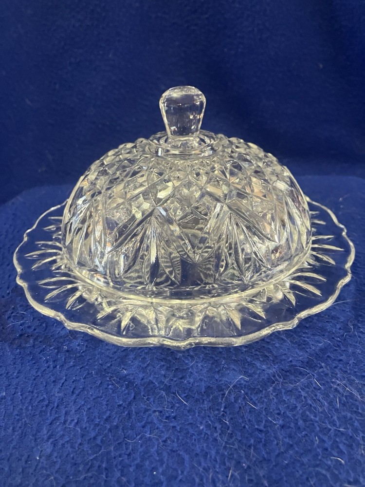 Enhance your collection with this exquisite Prescott Clear by Anchor Hocking round mid-century covered butter/cheese dish. Boasting the iconic Prescut clear starburst pattern, this pressed glass vintage glassware combines beauty and functionality. Measuring approximately 4 1/2 inches in height and 6 7/8 inches in width, its scalloped edge base and dome-like lid make it a stunning centerpiece for any table. Likely produced in the 1960 of 1970s. Perfect for serving or as a decorative item, this piece adds a touch of mid-century charm to your home. Embrace the timeless beauty of Anchor Hocking's Prescut Clear collection!