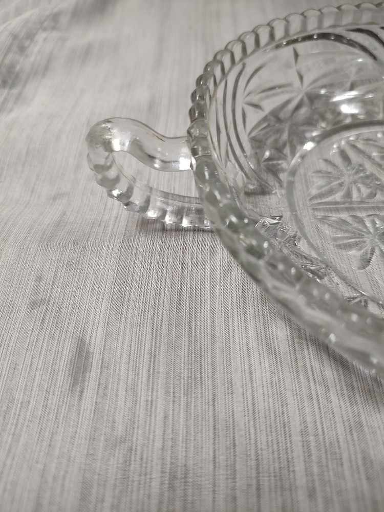 Vintage Clear Glass Serving Bowl With Handle Anchor Hocking Stars and Bars 6". No chips or cracks. See other listings for more stars and bars dishes. If you don't see it email me I have about 70 pieces. It will ship with a tracking number and well packaged. 10% of the sale goes towards the Animal Defense League of Texas. A no-kill animal shelter.