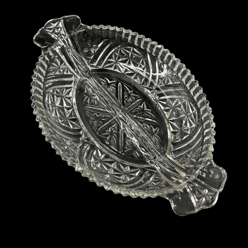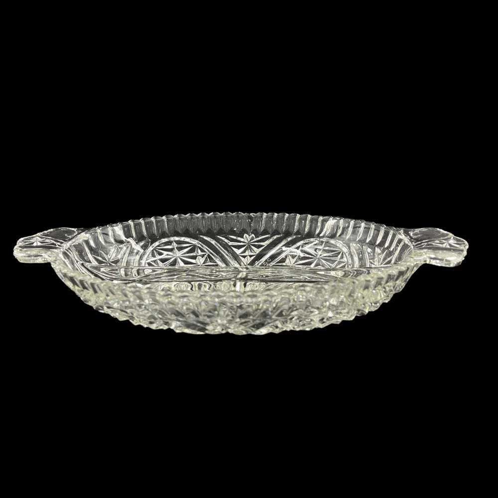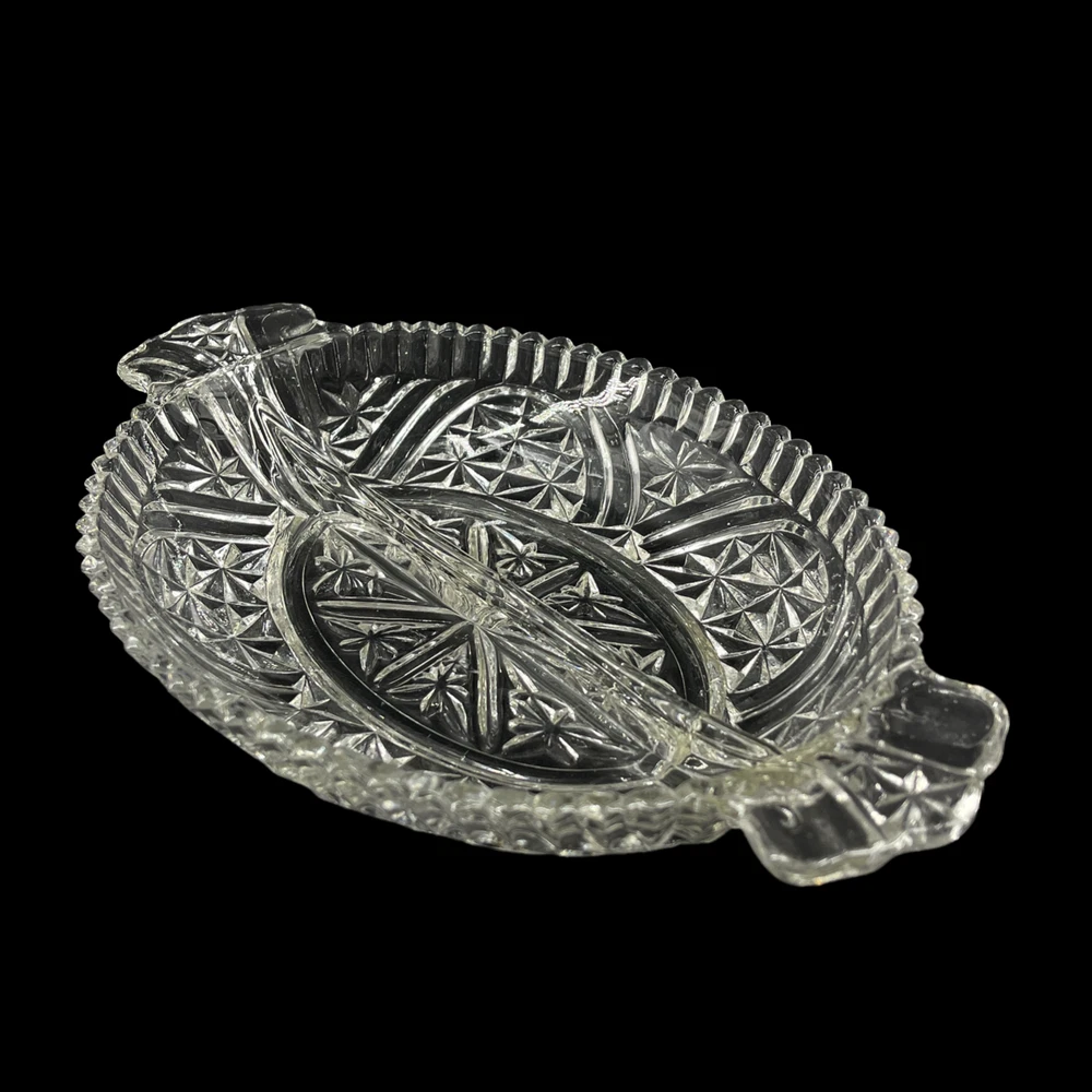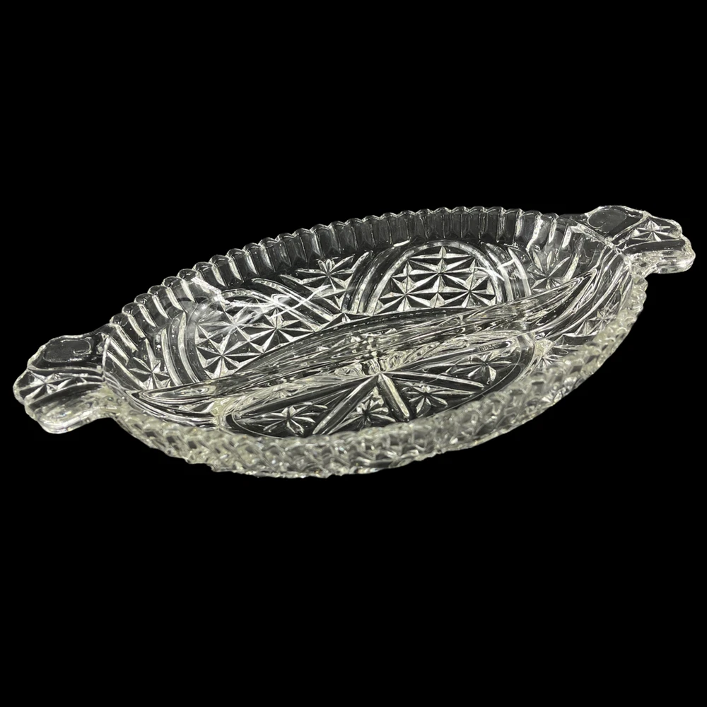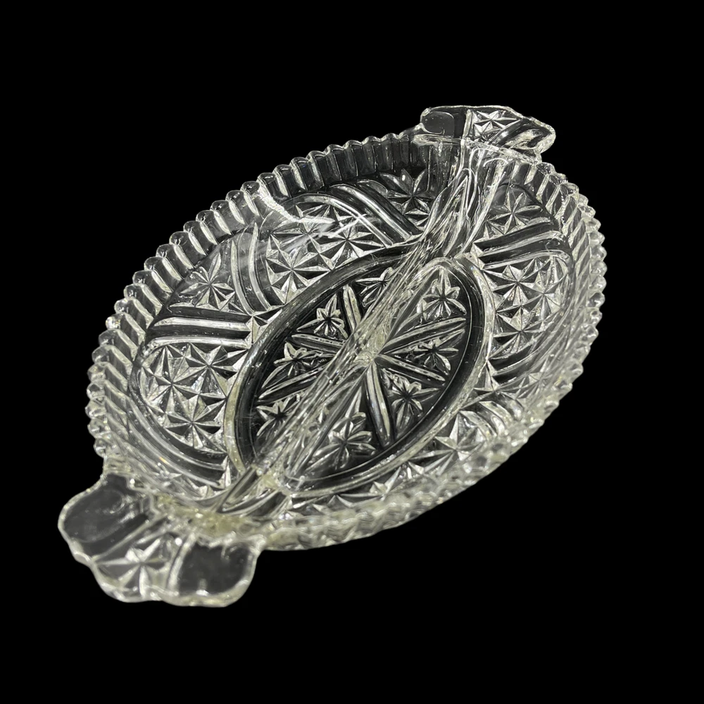 Vintage Anchor Hocking Stars and Bars Divided Relish Pickle Oval Serving Dish 6 1/4" x 10" and 1 1/2" deep. Double handles.