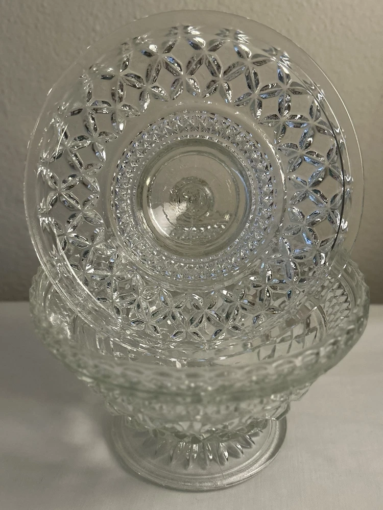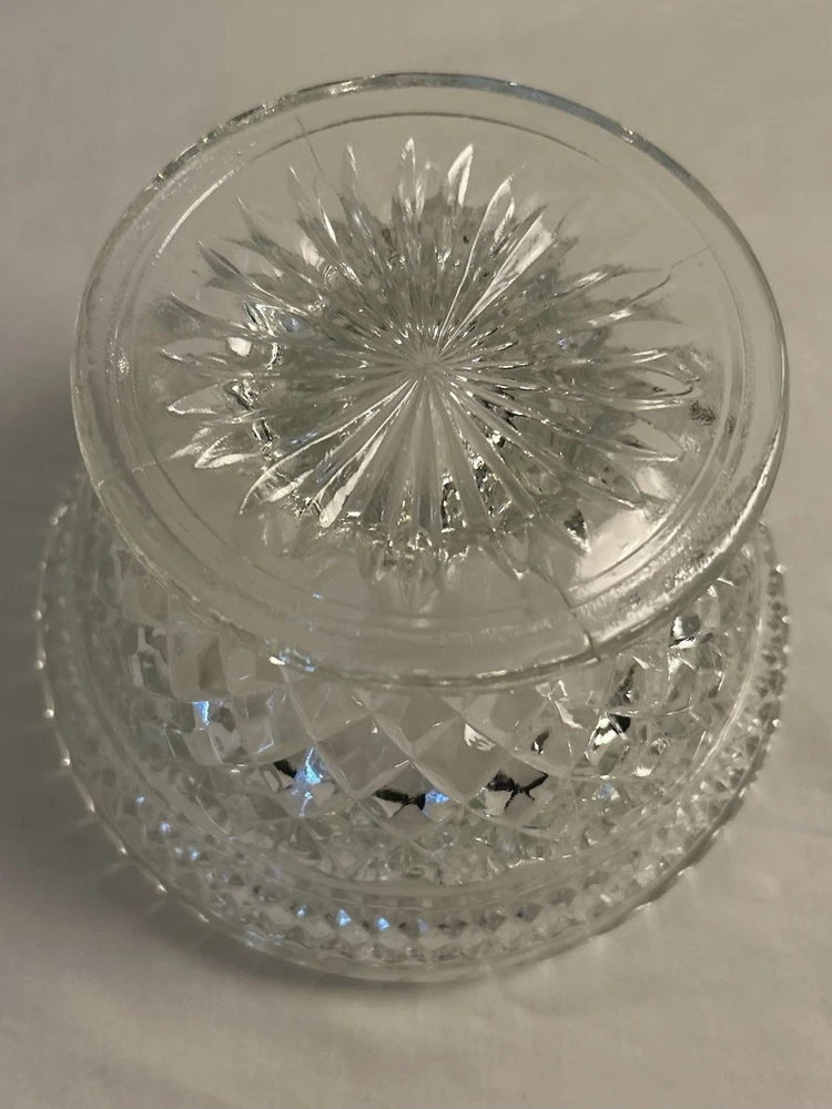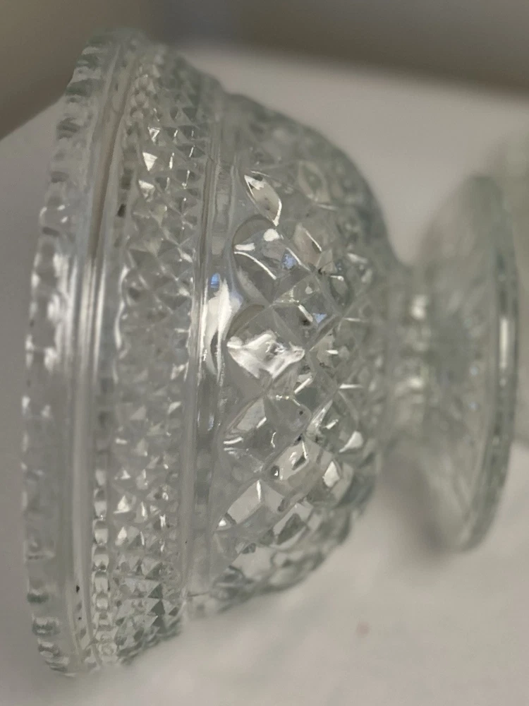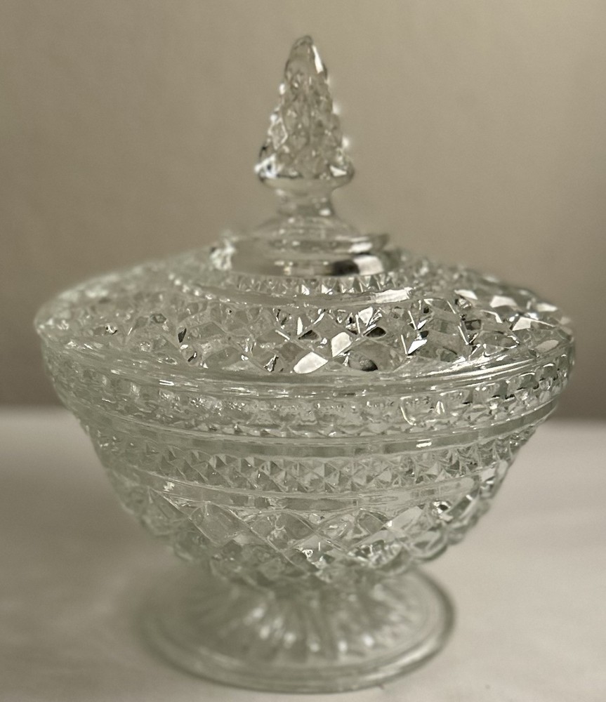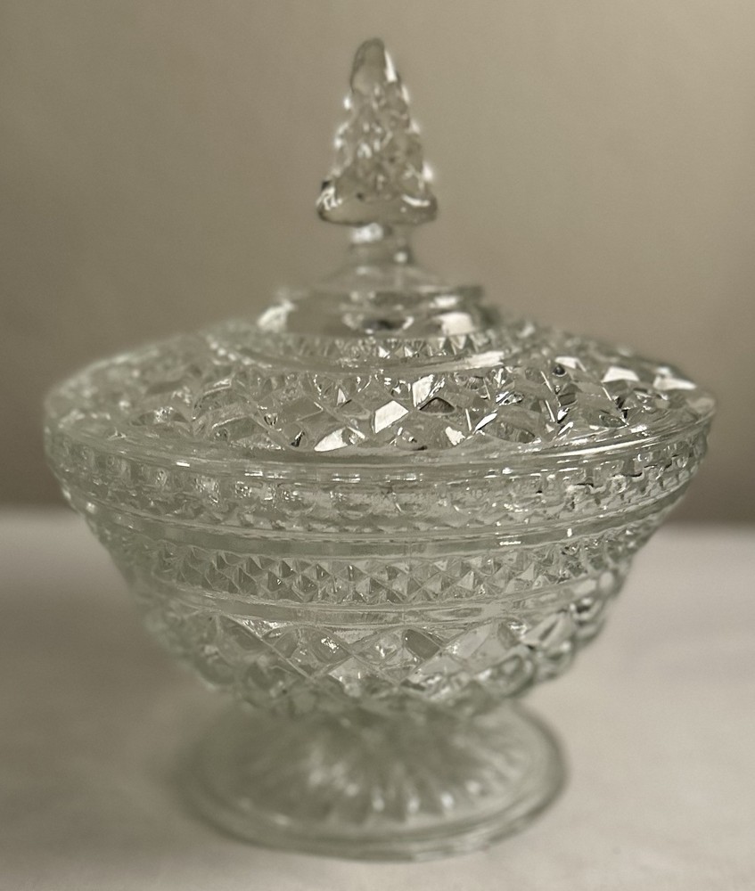 Elevate your display with the Vintage Anchor Hocking Wexford Clear MCM Glass Candy Dish, a quintessential piece of Mid-Century Modern design. The dish features a sleek, pressed glass construction with a fitted lid, ensuring your sweets are kept pristine and dust-free. Measuring 7 3/4 inches in height and 6 3/4 inches in diameter, it offers a generous space for your favorite confections. Crafted in the United States, this candy dish boasts the quality and charm of the Anchor Hocking brand, known for its exquisite glassware. The Wexford product line is celebrated for its elegance and simplicity, making this dish a timeless addition to any collection. Whether for serving or decoration, it brings a touch of vintage sophistication to any setting. No noticeable flaws detected Please see photos before purchase ask any questions pertaining to the item