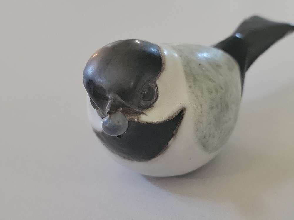 This product is a vintage 1989 Andersen Design Studio pottery chickadee bird with a blueberry, originating from North America. Made of ceramic in a multicolor finish with a matte texture, this figurine represents a decorative piece from the late 20th century. Handmade and produced using pottery techniques, this unique studio art pottery showcases the craftsmanship of the brand Andersen Design Studio, making it a charming addition to any collection or decor.