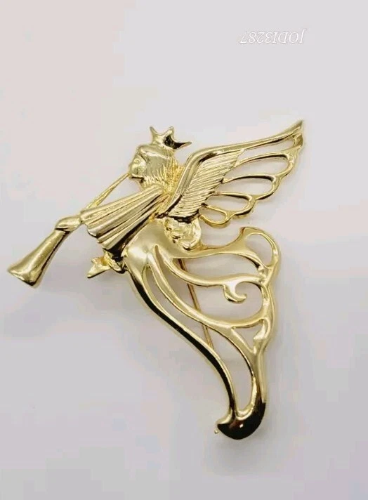 Vintage Angel Brooch Playing Horn Gold Tone Pin 3 in