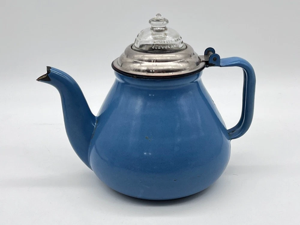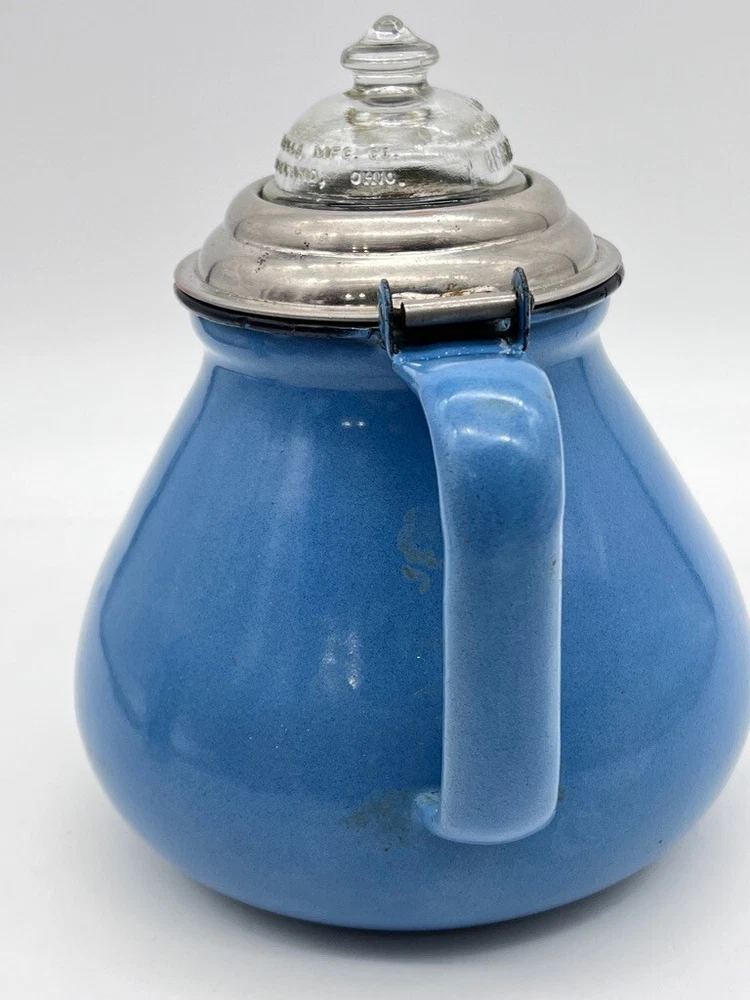 Vintage Antique Blue Enamel Ware Teapot with BREAK NO MORE Glass Lid Tea Kettle Please view my pictures as they are the most important part of my description - detailing external features of condition, style, color and contents of this auction. You will receive everything included in the photos. Please ask questions; I am happy to answer all inquiries. Thanks. Click HERE to view my other POTS, PANS & OTHER COOKWARE (INCLUDING CAST IRON, CAST ALUMINUM & VISION CORNING AMBER GLASSWARE Click HERE to view my VINTAGE REVERE WARE