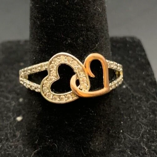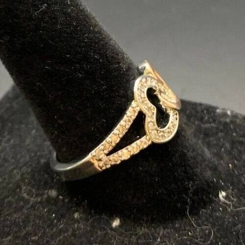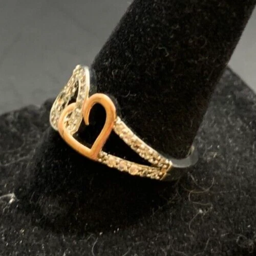 Vintage Antique Silver & Gold Tone Rhinestone Heart Ring - Size 8